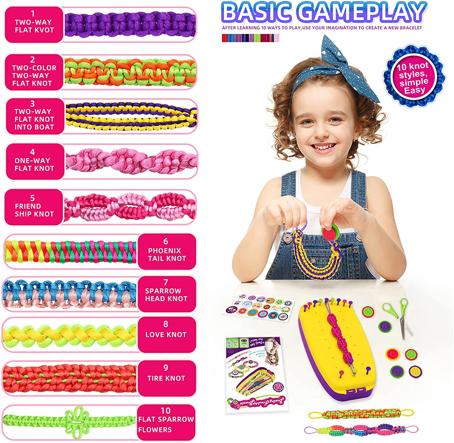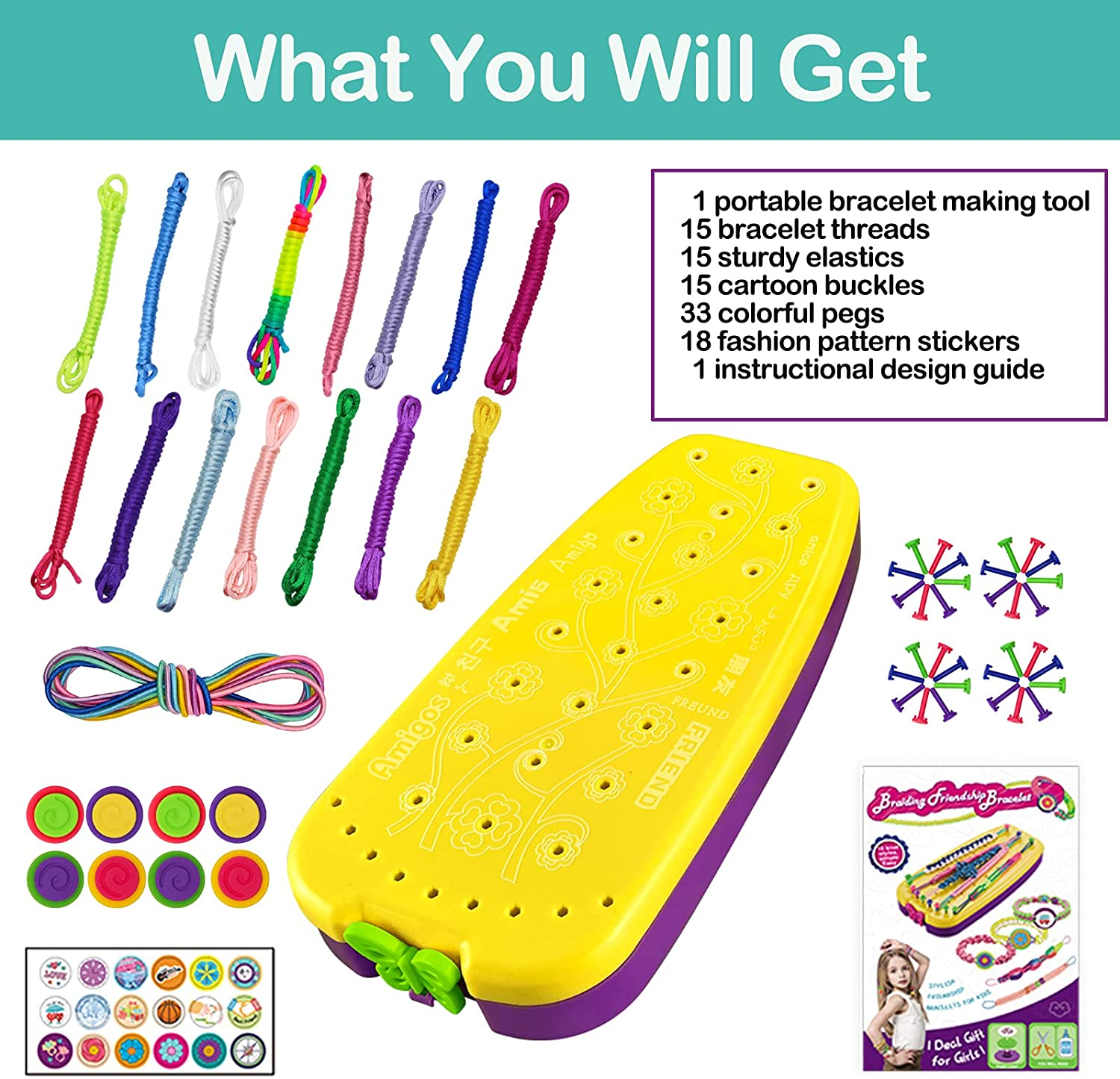 Bracelet Making Kit Toys, Arts & Crafts String Maker Tool, Kids Travel Activity What’s inside: 1 portable bracelet loom, 33 colorful pegs, 15 bracelet threads, 15 sturdy elastics, 15 cartoon buckles, 18 fashion pattern stickers, 1 instructional guide, all in a beautiful box, great gifts ideas for girls, cool toy for tween and teens to have fun and promote relationship. Easy to create by yourself: It’s simple for you to make bracelets by following directions step by step, choose a style, take out the braiding loom with movable pegs to hold the bracelet in place, keeping the threads separated and organized, or give full play to your imagination to complete it. What it can be used for: Make up to 15 bracelets, 10 knot styles, choose most popular style and well woven, you can send it as a gift to your friends, or just have fun for yourself whether at home or for a road trip , what’s more, it can be used as hair extension accessories for girls. Christmas gifts for kids girls: Bring this bracelet maker kit on road trips or on airplane car travel. It dispels boredom and provides hours of entertainment, the unique design makes it possible to include all the accessories you need, very convenient, funny activity for family travel or school camp. Product Description Fun game easy to make Follow our video step-by-step instruction helps kids become a master friendship bracelet maker. Improve their creativity . Arts and crafts kit suit for girls ages 8-12. Different Styles Every Day It's a activities that allows your kids to develop their brains and improve their hands-on skills.Girls can use their imagination and create their own styles! Spending time knitting bracelet helps kids stay away from iPads, phones and TVs. It’s good for eyes. What You Will Get 1 portable bracelet making tool 15 bracelet threads 15 sturdy elastics 15 cartoon buckles 33 colorful pegs 18 fashion pattern stickers 1 instructional design guide Exquisite packaging, high-quality materials. Perfect choice for girl's birthday gift Easy to learn and knit We provide a fixed elastic rope bracelet loom, let the children follow the instruction, step by step, kids can create their own handmade bracelet. Enjoy a nice travel This bracelet set can accompany kids on family trips, school summer camps, airplanes, cars, or anywhere to start their creations 6.0 inches x 7.0 inches x 1.85 inches. Weight: 4.8 oz Item model number Bracelets-001 Item dimensions L x W x H 7 x 6 x 1.85 inches Age Range (Description) 7-12 Years Color Yellow Included Components String, Bracelet Making Kit, Maker Tool Material String Country of Origin China Style Friendship Bracelet Item Weight 4.8 ounces Theme Friendship, Arts And Crafts, Diy Size Small Model Name Friendship Bracelets Seasons All Seasons Art Craft Kit Type Friendship Bracelet Making Kit Special Feature Travel Activity Set, Kids Activity, Diy Craft Product Dimensions 7 x 6 x 1.85 inches Number of Pieces 33
