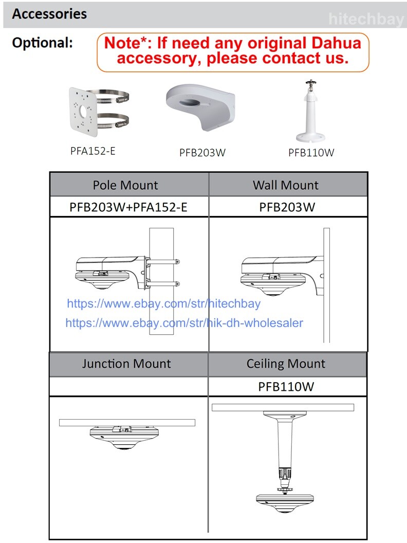 Dahua IPC- EW5541-AS 5MP Fisheye AI Starlight IP Camera IR10m Built-in Mic H.265+ IP PoE Network >>> Welcome to the bulk order of Dahua all-line English version products with attractive prices, please contact us now! <<< Note*: 1. Latest Dahua 5MP fisheye model, to replace IPC-EW5531-AS ( N55BT5 ) 2. Original Dahua worldwide English version and upgradeable. Features > 5MP, 1/2.7” CMOS image sensor, low illuminance, high image definition > Outputs max. 5MP (2592 × 1944) @25/30 fps > H.265 codec, high compression rate, ultra-low bit rate > ROI, SMART H.264+/H.265+, flexible coding, applicable to various bandwidth and storage environments > 120dB WDR, 3D DNR, HLC, BLC, digital watermarking, applicable to various monitoring scenes > Intelligent detection: Intrusion, tripwire, people counting in area > Abnormality detection: Motion detection, video tampering, scene changing, audio detection, no SD card, SD card full, SD card error, network disconnection, IP conflict, illegal access, and voltage detection > Alarm: 1 in, 1 out; audio: 1 in, 1 out; supports max. 256 G Micro SD card, built-in Mic > 12V DC/PoE power supply, easy for installation > IP67, IK10 protection > Heat map for people counting. You can adjust the number of people, time threshold to generate a heat map, which can be exported. System Overview With fisheye lens, Dahua Fisheye series camera can realize 360° surveillance, and it is widely applied in various scenes such as airports, shopping centers, banks and hotels Functions Smart H.265+ & Smart H.264+ With advanced scene-adaptive rate control algorithm, Dahua smart encoding technology realizes the higher encoding efficiency than H.265 and H.264, provides high-quality video, and reduces the cost of storage and transmission. Heat Map Duhua heat map technology is used to display the crowd density and people appearance probability. Display the crowd status by different colors. Generally, the crowd status is the statistics of people quantity in space and time dimensions. In Area No. With advanced stereo image technology and deep leaning algorithm, Dahua In Area No. technology recognizes human targets accurately to count people in area in real-time. You can set people quantity threshold, when the number larger or smaller than the threshold, it triggers linkage. It is applicable in the scene that has limit on people quantity. True WDR With advanced Wide Dynamic Range (120dB WDR) technology, Dahua network camera provides clear details in the environment of strong brightness contrast. The bright and dark area can get clear video even in high brightness environment or with backlight shadow. Protection (IP67, IK10, wide voltage) IP67: The camera passes a series of strict test on dust and soak. It has dust-proof function, and the enclosure can works normal after soaking in 1 m deep water for 30 minutes. IK10: The enclosure can stand the punch more than 5 times from a 5 kg hammer falling from a height of 40 cm (Impact energy is 20J). Wide voltage: The camera allows ±30% (for some power supplies) input voltage tolerance (wide voltage range), and it is widely applied to outdoor environment with instable voltage. Specifications Camera Image Sensor 1/2.7”5Megapixel progressive CMOS Max. Resolution 2592 (H) × 1944 (V) ROM 128 MB RAM 512 MB Scanning System Progressive Electronic Shutter Speed Auto/Manual 1/3 s–1/100,000 s Min. Illumination 0.006 Lux @F2.0 S/N Ratio > 56 dB Illumination Distance 10 m (32.8 ft) Illuminator On/Off Control Auto/Manual Illuminator Number 3 (IR LED) Lens Lens Type Fixed-focal Mount Type M12 Focal Length 1.4 mm Max. Aperture F2.0 Field of View Horizontal: 180° Vertical: 180° Diagonal: 180° Iris Type Fixed Close Focus Distance 0.2 m (0.7 ft) DORI Distance Detect Observe Recognize Identify 28 m (91.9 ft) 11.2 m (36.7 ft) 5.6 m (18.4 ft) 2.8 m (9.2 ft) Smart Event Heat Map Yes Professional, intelligent IVS (Perimeter Protection) Tripwire; intrusion People Counting Support people counting in area, and displaying and outputting yearly/monthly/daily reports (matching devices are needed); support people counting in 4 areas Intelligent Search Work together with Smart NVR to perform refine intelligent search, event extraction and merging to event videos. Video Video Compression H.265; H.264; H.264H; H.264B; MJPEG (only supported by the sub stream) Smart Codec Smart H.265+/ Smart H.264+ Video Frame Rate Main stream (2592 × 1944 @1–25/30 fps) sub stream (704 × 576 @1–25 fps/704 × 480 @1–30 fps) third stream (1280 × 720 @1–25/30 fps) Stream Capability 3 streams Resolution 5M (2592 × 1944); 3M (2048 × 1536); UXGA (1600 × 1200); 1.3M (1280 × 960); 720p (1280 × 720); D1 (704 × 576/704 × 480); VGA (640 × 480); CIF (352 × 288/352 × 240) Bit Rate Control CBR/VBR Video Bit Rate H.264: 3 kbps–8192 kbps H.265: 3 kbps–8192 kbps Day/Night Auto (ICR)/Color/B/W BLC Yes HLC Yes WDR 120 dB Scene Self-adaptation Yes White Balance Auto/natural/street lamp/outdoor/manual/regional custom Gain Control Auto/Manual Noise Reduction 3D DNR Motion Detection OFF/ON (4 areas) Region of Interest (RoI) Yes (4 areas) Smart Illumination Yes Privacy Masking 4 areas Audio Built-in MIC Yes Audio Compression PCM; G.711a; G.711Mu; G726; AAC Alarm Alarm Event No SD card; SD card full; SD card error; service life warning (supported by Dahua card); network disconnection; IP conflict; illegal access; motion detection; video tampering; tripwire; intrusion; scene changing; audio detection; voltage detection; external alarm; people counting in area; stay alarm; people counting; people No. exception detection; safety exception Network Network RJ-45 (10/100 Base-T) SDK and API Yes Protocol IPv4; IPv6; HTTP; HTTPS; TCP; UDP; ARP; RTP; RTSP; RTCP; RTMP; SMTP; FTP; SFTP; DHCP; DNS; DDNS; QoS; UPnP; NTP; Multicast; ICMP; IGMP; NFS; PPPoE; 802.1x; SNMP Interoperability ONVIF (Profile S/Profile G/Profile T); CGI; Milestone; Genetec; P2P User/Host 20 (Total bandwidth: 64 M) Storage Dahua Cloud;