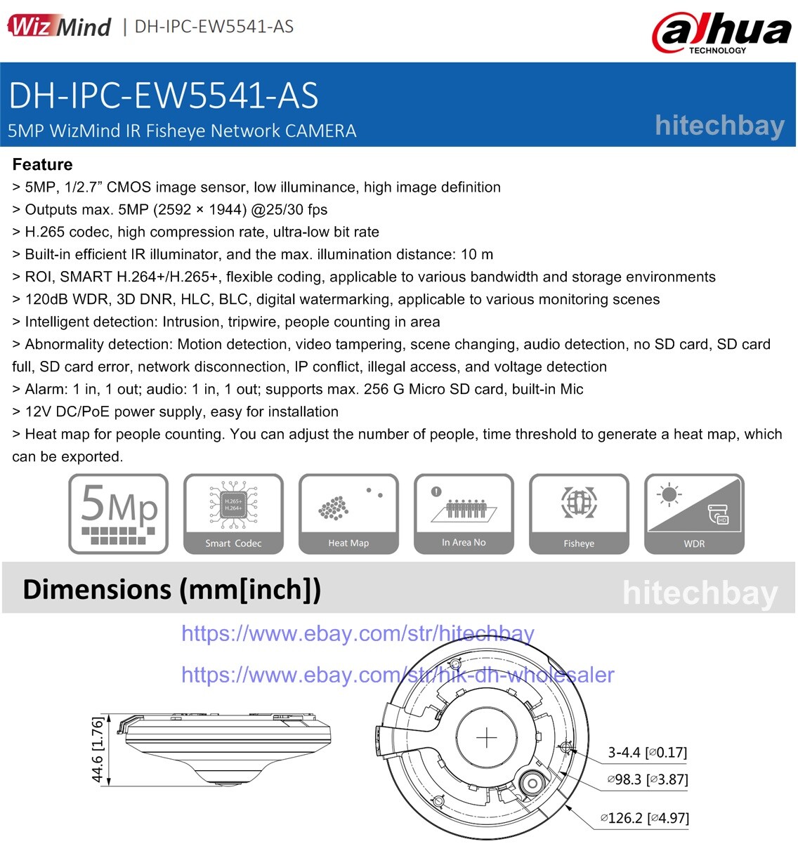 Surveillance Technology: IP/Network Connectivity: Wired gtin13: 9331361830083 Model: IPC-EW5541-AS Brand: Dahua MPN: IPC-EW5541-AS, DH- IPC-EW5541-AS UPC: 9331361830083 Maximum Resolution: 5MP (2592 × 1944) @25/30 fps Power: PoE or DC12V Location: Indoor/Outdoor Type: Panoramic Features: 5MP, 1/2.7” CMOS image sensor, low illuminance, Built-in Mic, supports max. 256 G Micro SD card, Intelligent detection: Intrusion, tripwire,, people counting in area, Fisheye Camera