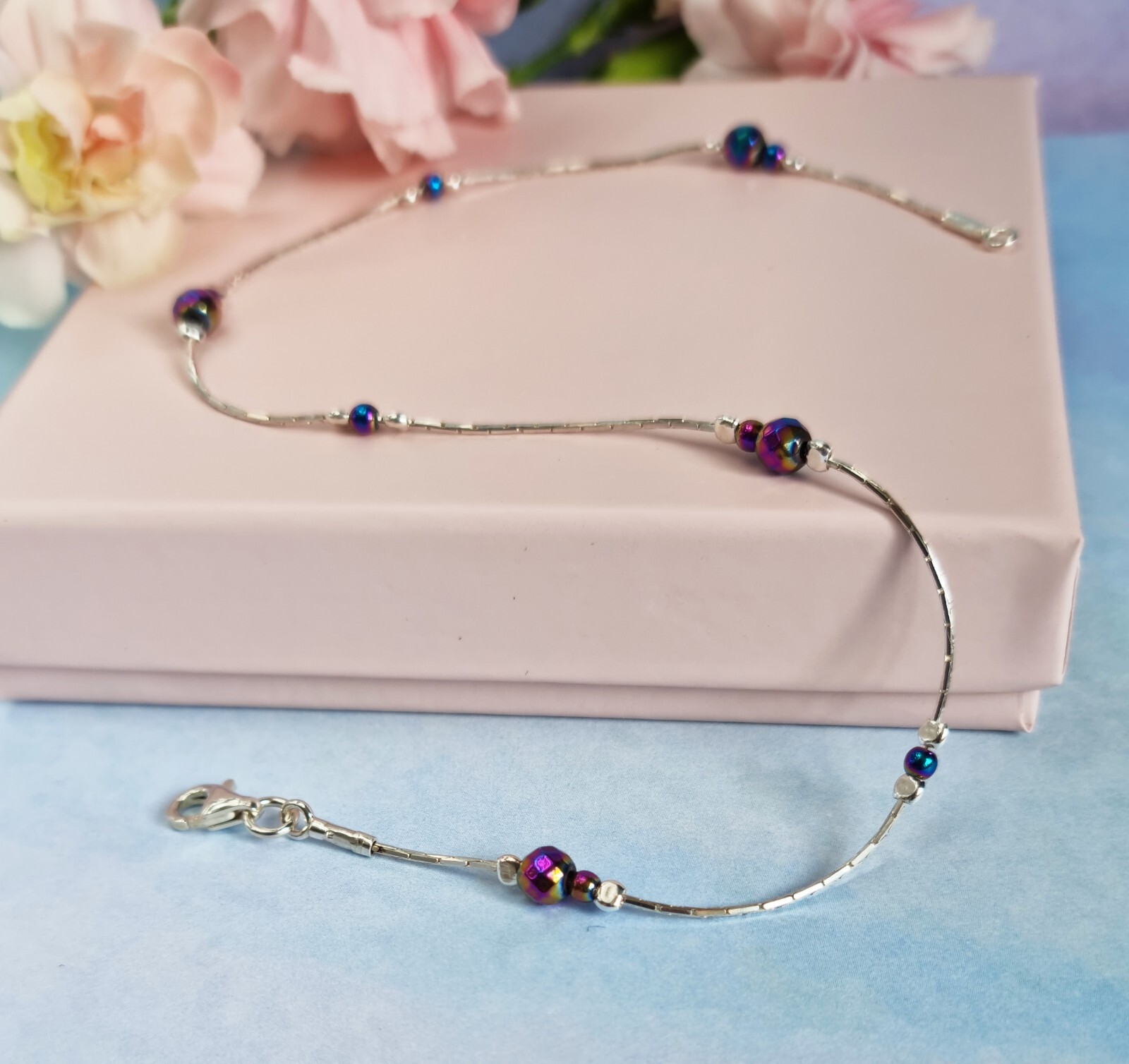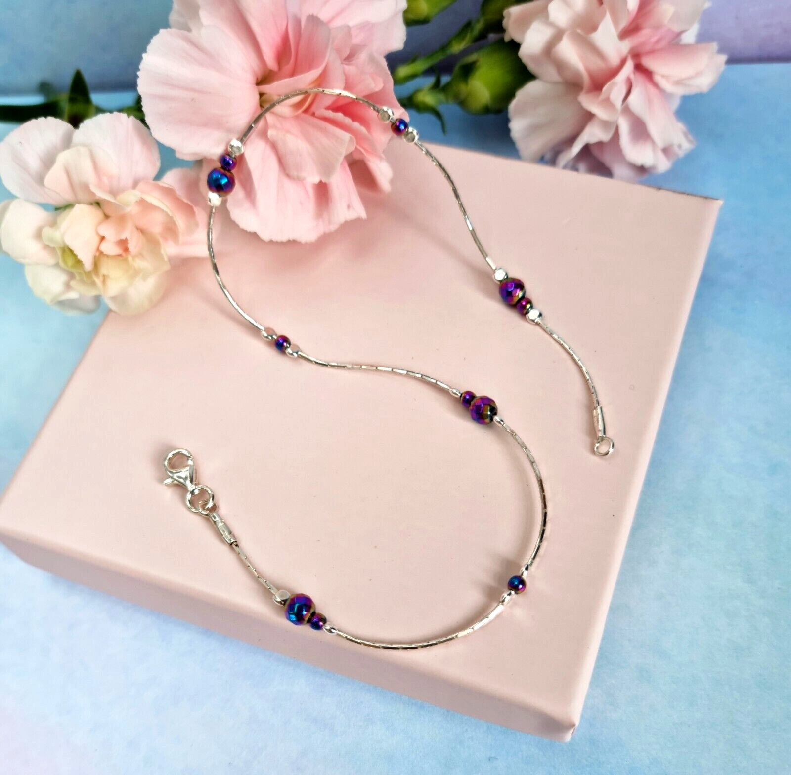 Handcrafted beautiful ANKLET made from solid 925 Sterling Silver decorated adorable faceted Rainbow Hematite beads Gleaming effect of Hematite looks really elegant Lovely colour, very dainty, cute design and high quality - why do not treat yourself ? Our jewellery is individually handcrafted in our Studio, using solid high quality 925 Sterling Silver Length 10'' Beads 3 mm; 2mm If you need different length please let me know placing the order Anklet comes wrapped in velvet gift bag We usually dispatch within 1 working day of receiving cleared payment. Thank you so much for taking the time to view our listing today