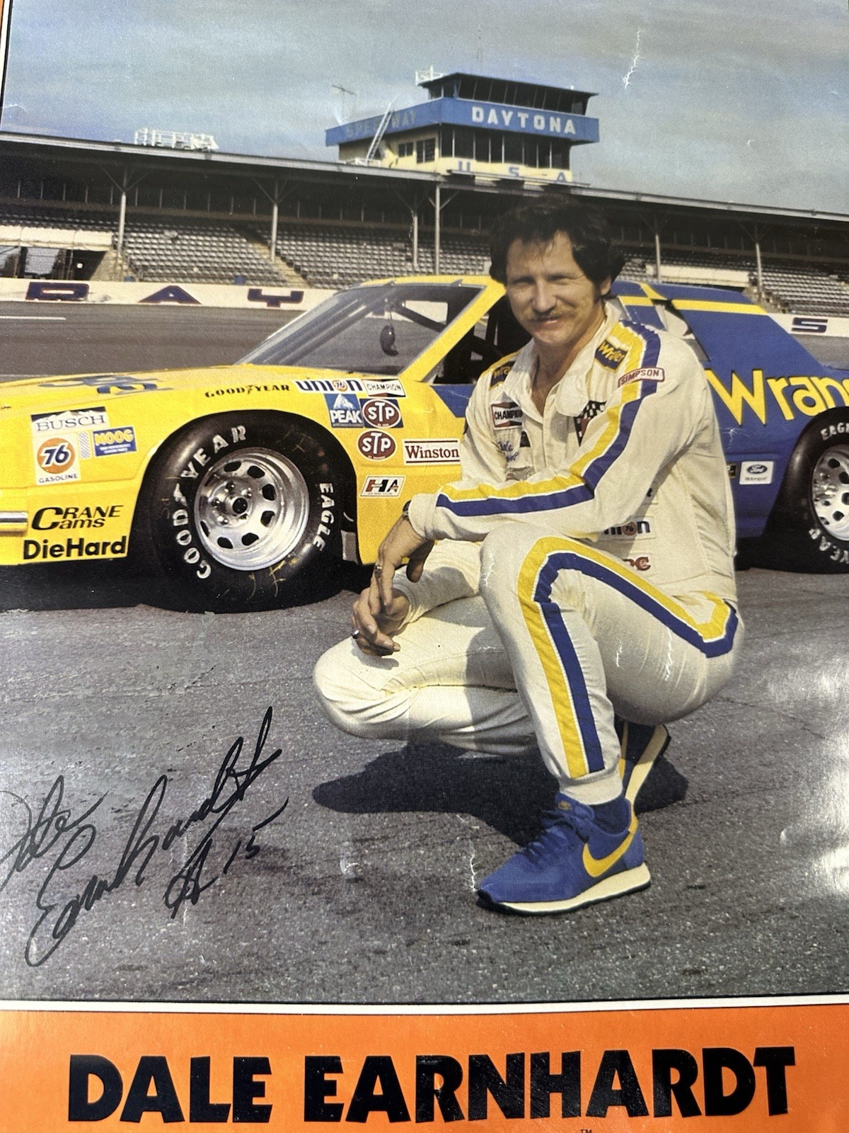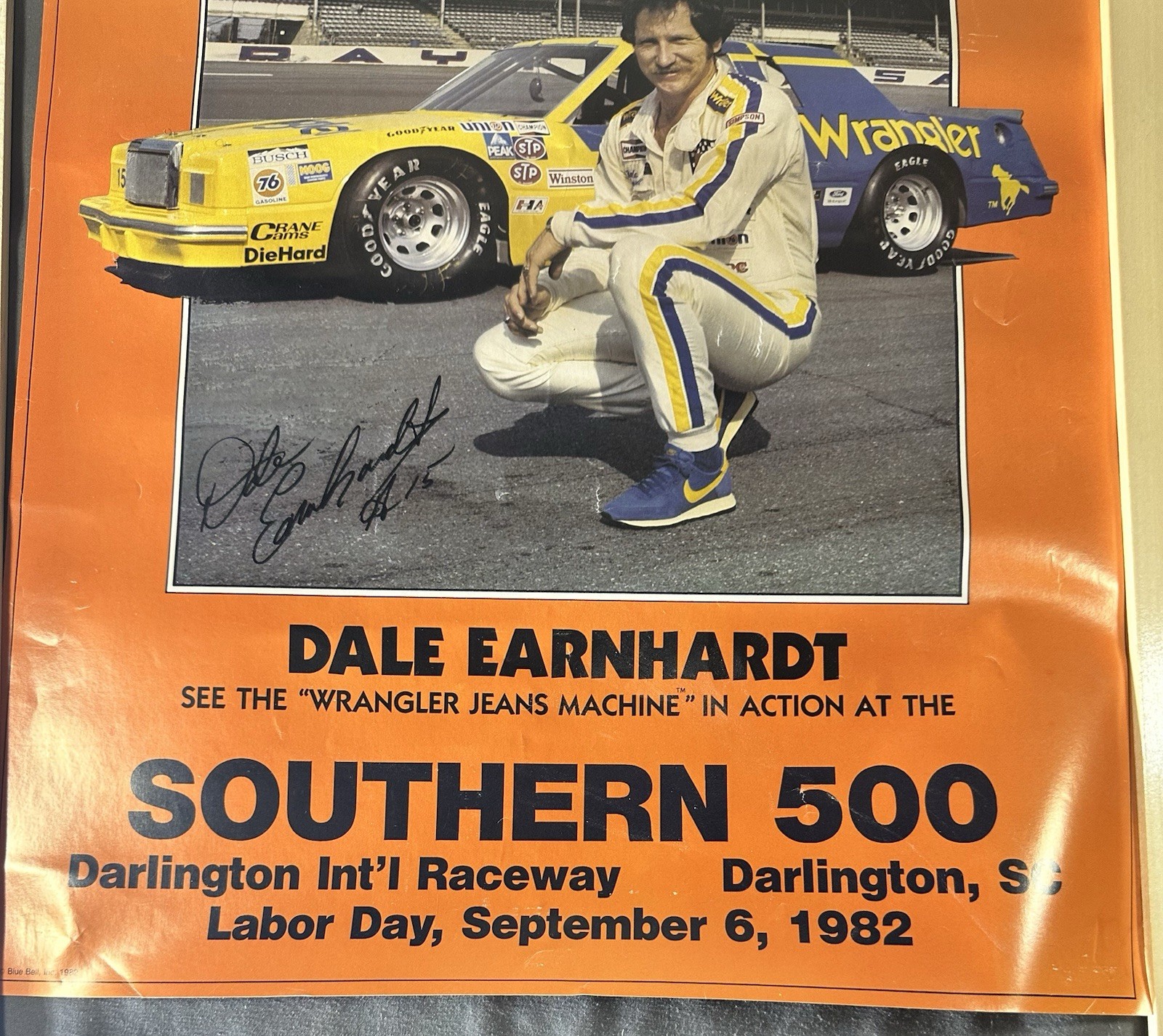 For sale is an original vintage 1982 promotional poster featuring NASCAR legend Dale Earnhardt Sr. This piece was produced to promote the Southern 500 at Darlington International Raceway on Labor Day, September 6, 1982. Key Features: Visuals: Features Earnhardt in his iconic yellow and blue #15 Wrangler Jeans "Machine" Ford Thunderbird. Signature: Includes a large facsimile (pre-printed) autograph. Dimensions: Approximately 22" x 15.5". Authenticity: This is an original vintage item from the 1980s, not a modern digital reprint. Condition: Poster is in good vintage condition with vibrant colors. Displays minor edge wear consistent with age also has markings on the back side from tape. Please see photos for exact details.] Shipping: Will be shipped carefully rolled in a heavy-duty protective mailing tube to ensure it arrives safely.