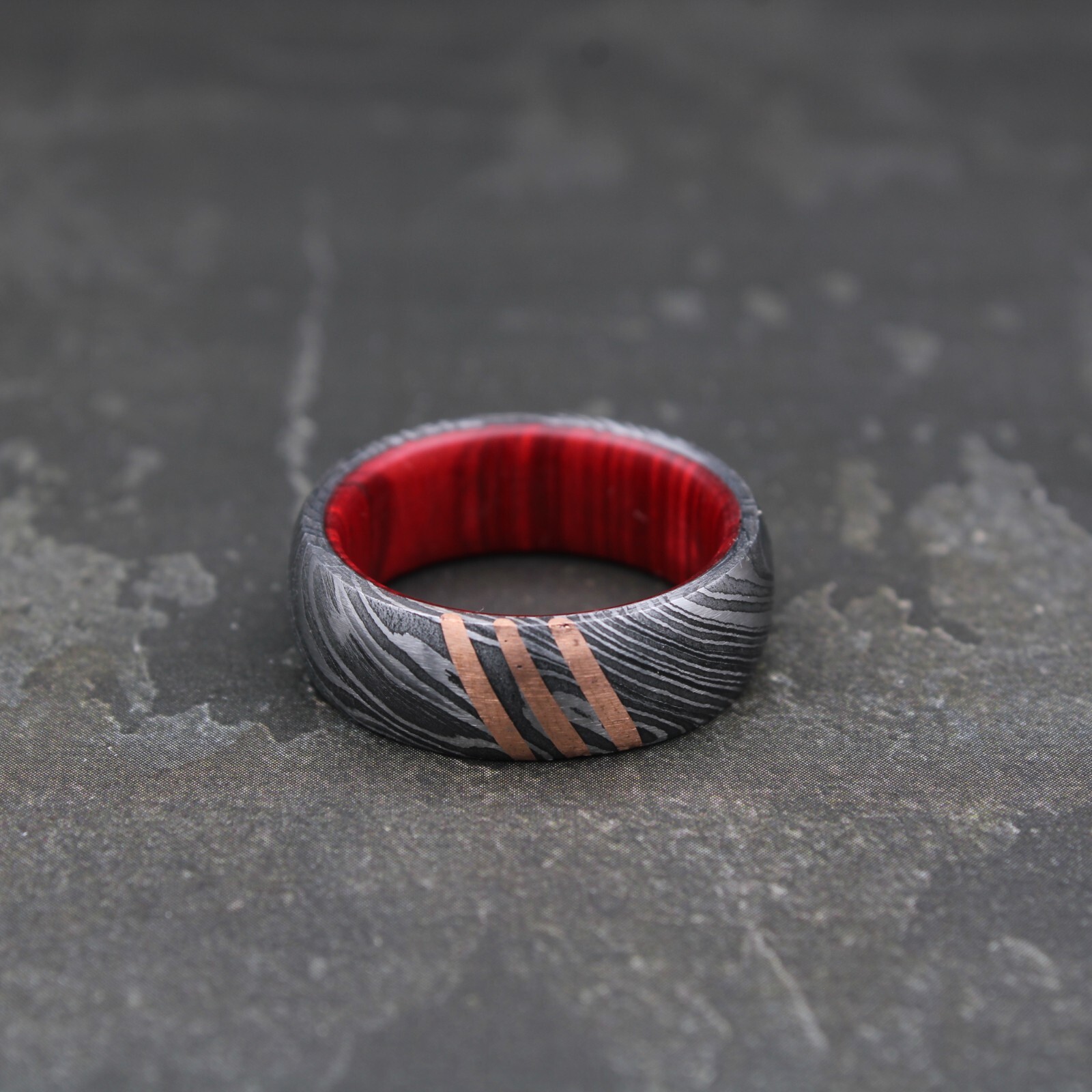 The interior of this damascus steel ring is lined with a hardwood sleeve. Hardwood used in this ring is 100% natural and skin friendly. If you want a ring that will stand out, this band is your one stop shop because it offers a unique but simplistic aesthetic. The appealing design has a sleek polished finish. Authentic damascus steel ring made with the mixture of 1095 and 15n20 which is a type of metal that is known for its strength and durability. The rings have a hammered finish, which gives them a rustic look. Every single band in my shop is 100% handmade, made one by one and i don’t use any machine to make the rings. Weight of ring: 6-9 grams. The width of the ring in picture is 8mm. Package includes: 1x Ring in a poly bag. 1 x Ring Box. Care Instructions: Keep in mind that moisture is the enemy of Damascus Steel in general, whether it's a $1000 ring or a $30 band. If your fingers sweat a-lot or the ring is wet then it's prone to rust. The wood is well stabilized, but it is advised to avoid prolonged submersion in water, such as for bathing, swimming, or doing dishes. The ring will last a lifetime if cared for properly. Note: Please be aware that due to the handcrafted nature of damascus rings, variations in color, shade, and pattern can be slightly different. Each ring is meticulously made to order, resulting in unique characteristics that make every piece one-of-a-kind. As such, no two rings can be identical, adding to the charm and individuality of each creation. The delivery time is a little more compare to other sellers because non of my rings are mass produced. All of the bands are totally handmade by myself and i make every single band separately with care Damascus Whiskey Barrel Steel Ring, Man Wood Wedding Ring, Man Promise Ring, damascus steel ring, Man Ring, engagement ring, man wedding band,Damascus Ring, Wedding Gift, Unique Ring, Jewelry Ring, Gift for Her, Birthday Gift, Wood Wedding Ring, Man Promise Ring, damascus steel ring, engagement ring, Men Ring