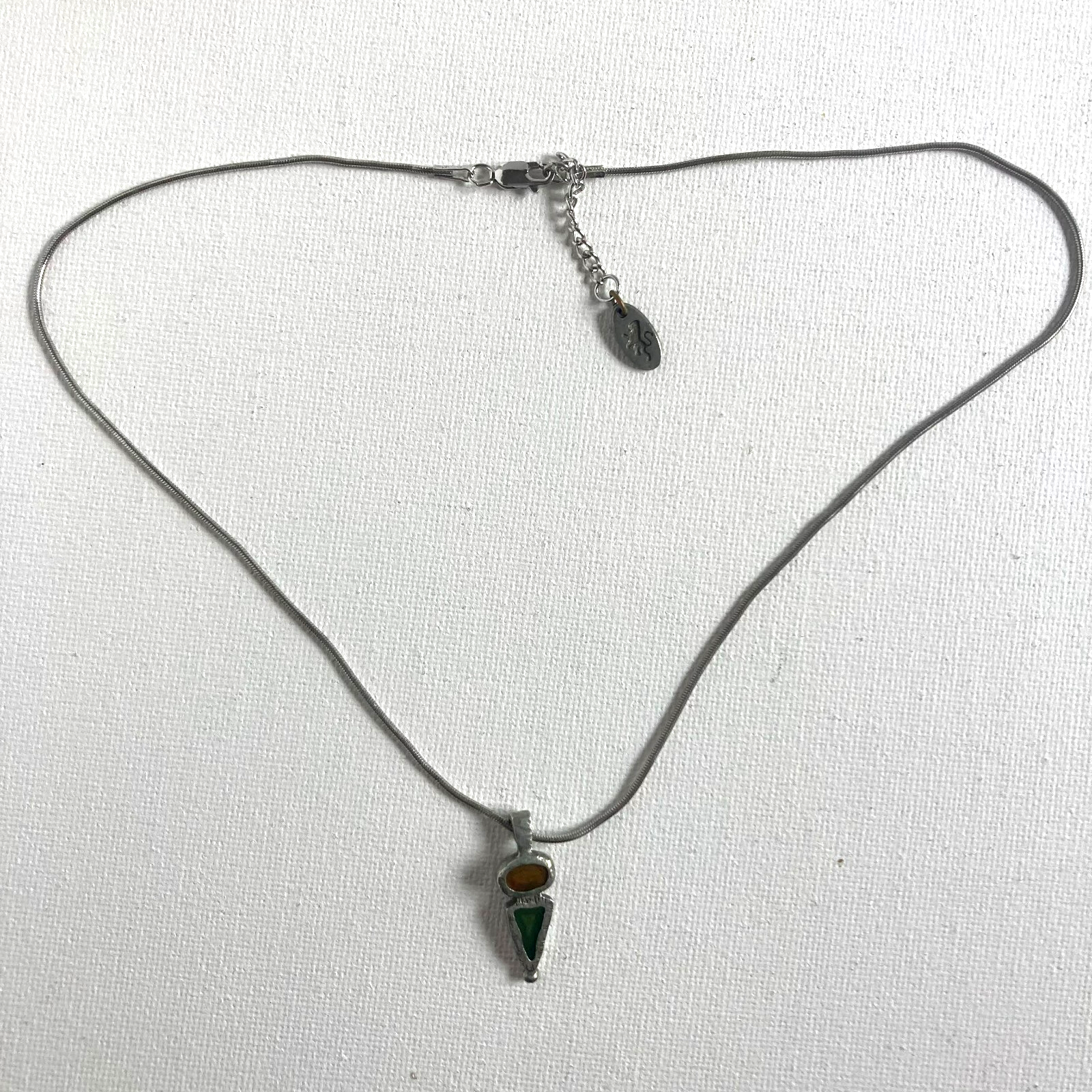 This Danforth Pewter Necklace features a unique abstract green and yellow enamel pendant on a silver 925 chain. Handmade in the United States, this piece is perfect for celebrating Mother's Day or adding a pop of color to any outfit. The pewter metal and bezel setting style give this necklace a high-quality and stylish look, making it a great addition to any jewelry collection.