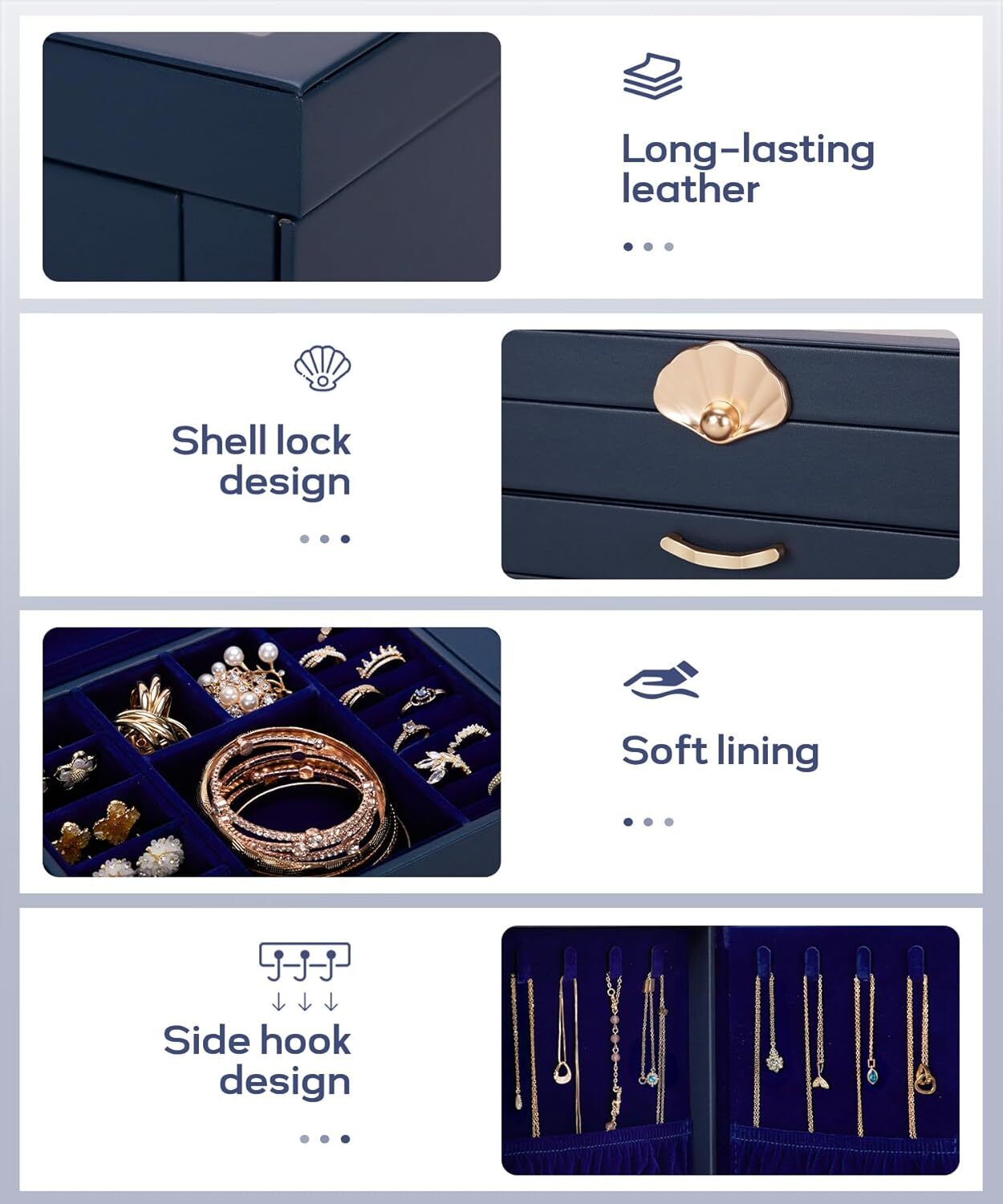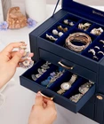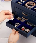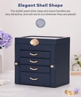Jewelry Storage Haven: This white faux leather jewelry box with a velvet lining is a five-tiered organizer with four drawers, offering ample storage for your earrings, necklaces, and bracelets. Drawers for Easy Access: The box features four golden wave-shaped drawer pulls, making it easy to access your jewelry collection stored within the velvet-lined compartments. Display Your Treasures: The top glass window display lets you showcase your favorite pieces while keeping them protected from dust and damage. Versatile Organizer for Everyday Use: Perfect for your home desk or bedroom vanity, this jewelry box is an elegant organizer for daily jewelry storage and display. Gift-Worthy Jewelry Box: Ideal as a gift for women of all ages, this jewelry box is a thoughtful present for birthdays, Christmas, Valentine’s Day, weddings, and anniversaries. Color Dark Blue Material Faux Leather Style Modern Special Feature Glass Lid, Dustproof, Clear Window, Scratch Resistant, Decorative Recommended Uses For Product Necklace, Bracelet, Ring, Watch, Earring, Bangle Product Dimensions 10.4"D x 6.1"W x 9.9"H Target Audience Women, Daughter, Children, Granddaughter, Girls Shape Rectangular Occasion Baptism, Wedding, Anniversary, Birthday, Valentine's Day Mounting Type Table Top Finish Type Fabric-like Inner Material Velvet Closure Type Drawer Number of Drawers 4 Jewelry Storage Type Jewelry Box Number of Items 1 On Feb 19, 2025 at 19:12:05 PST, seller added the following information: