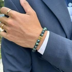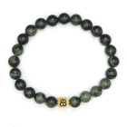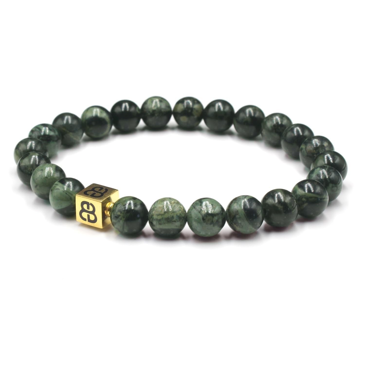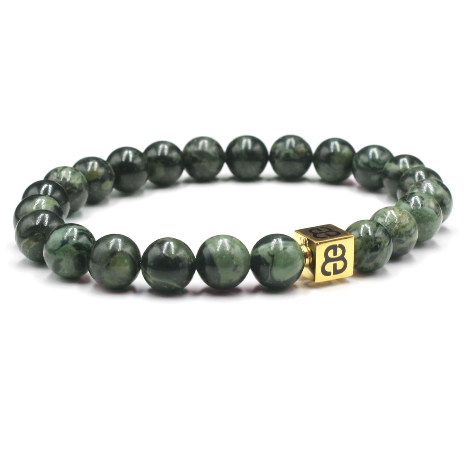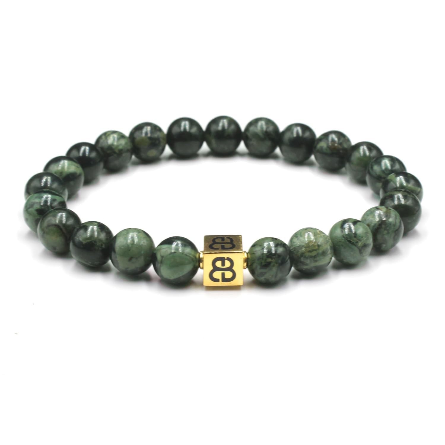 ABOUT THIS ITEM This designer bracelet features 8mm dark green nephrite jade beads accented with a handmade 8mm x 8mm 22 karat gold plated sterling silver “Bali Beads” logo bead. The gold is gently oxidized to darken the recessed areas. Our precious metal beads are individually handmade by Balinese craftsmen in our workshop studio. Our bracelets are strung on a high tension silicon-based clear cord for superior strength and durability that lasts for years. This dark green jade and gold bracelet comes in a bracelet gift box. This bracelet fits a wrist size of 7-7.5 inches. To avoid disappointment and having to return your bracelet please measure your wrist size before ordering. Do not wear your bracelet while swimming, showering, sleeping, or any kind of active sports. Please us if you have any questions about our products or would like inquire about a customized bracelet.
