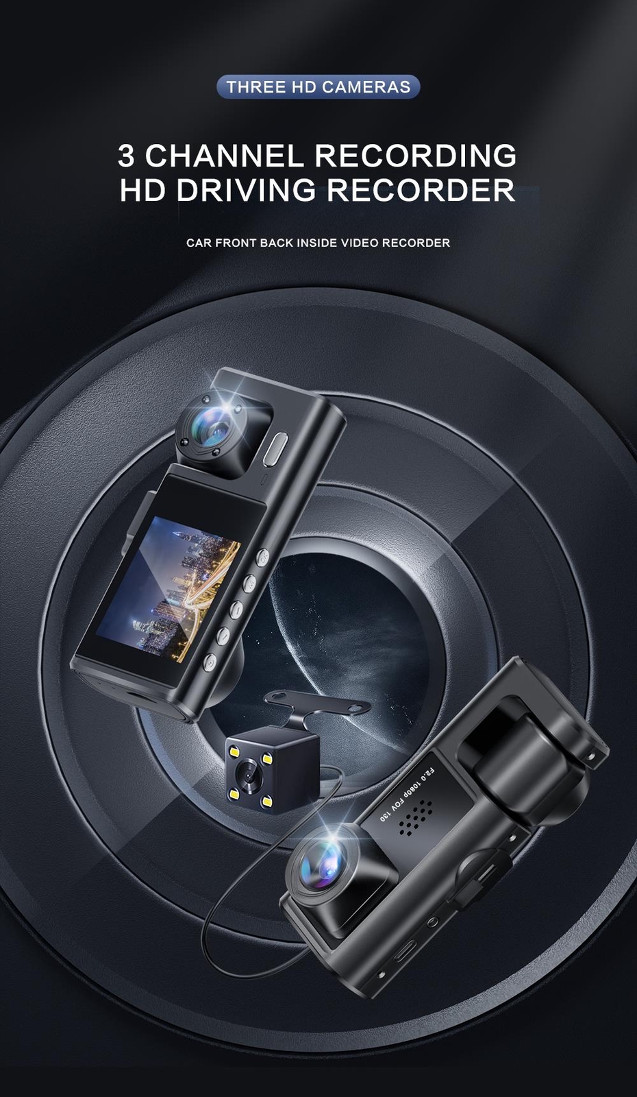 Dash Cam W/ IR Night Vision Loop Recording & 2" IPS Screen 1080P 3 Camera Item Description • High-Resolution Camera : Capture clear and detailed footage with the 1080P 3 Camera dash cam, ensuring important evidence is preserved. • Night Shot Function : Equipped with IR night vision, this dash cam ensures optimal visibility even in low light conditions. • Loop-Cycle Recording Feature : The loop-cycle recording feature ensures that your camera never runs out of storage, providing a seamless recording experience. • Built-in Battery : With a built-in battery, this dash cam is designed to operate even when the vehicle is turned off, ensuring non-stop protection. • Compact Design : The dash cam's compact design perfectly complements your vehicle's interior, offering a sleek and discreet recording tool. • Easy Installation : This dash cam is easy to install, making it a convenient addition to any vehicle. Product Description: · Dual-lens camera: The product is equipped with three cameras in front and inside the car, which can comprehensively observe the road conditions in front and inside and behind. · Reverse image capture: reverse image capture function can easily record important details such as license plate when reversing. Loop recording: The loop recording function ensures that the device continuously records and overwrites old footage, making it a reliable source of evidence. · High-definition video: The product captures high-definition video to provide clear and detailed front and rear road images. Warm reminder: 1: The built-in battery of this product is only for the time and date update function, and the supporting power supply must be linked to the loading work 2: Please use the high-speed c10 capacity memory card 3: Car charger must use the original parts 4: Do not change the line without permission to avoid abnormalities such as machine burning