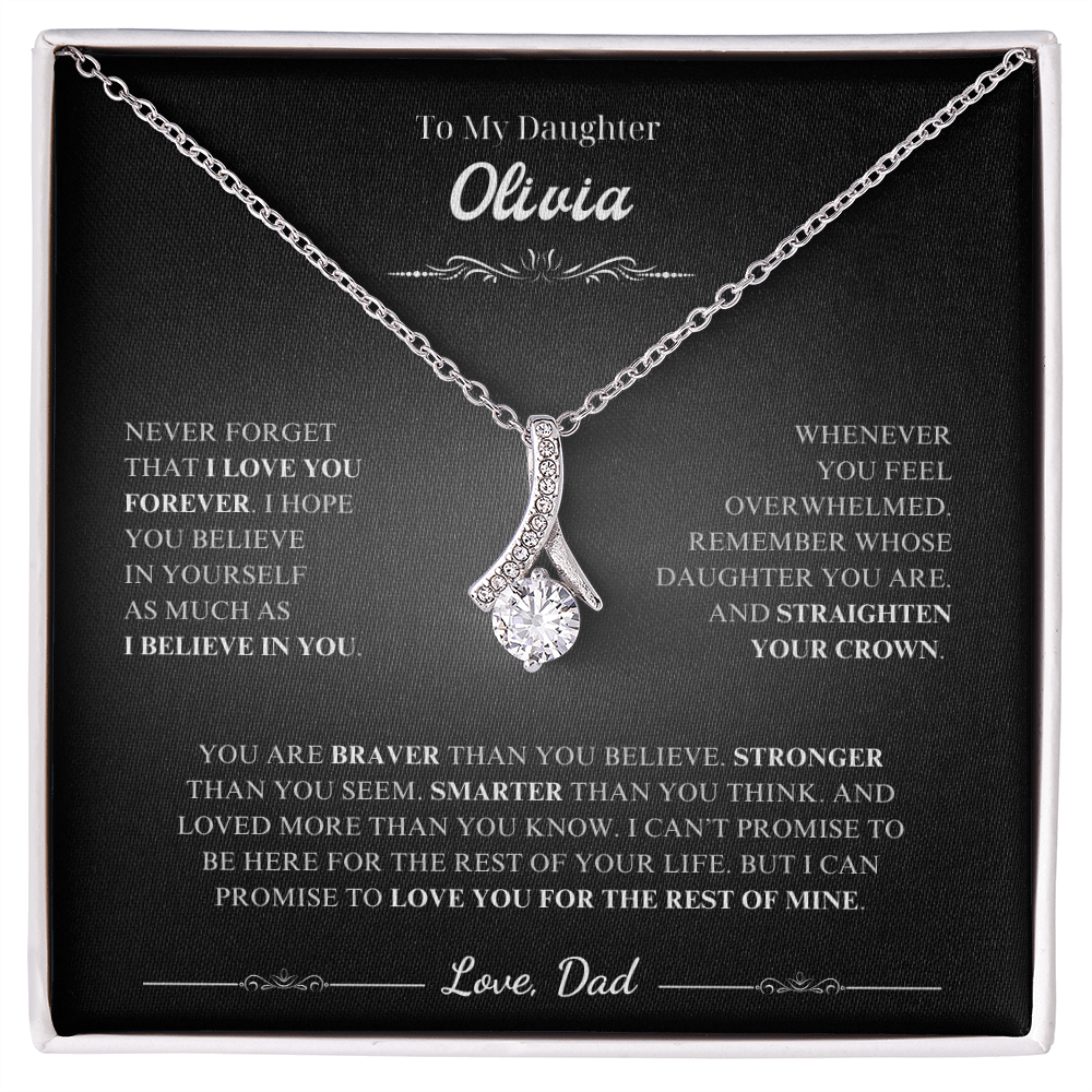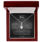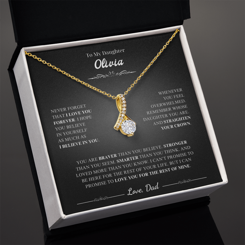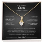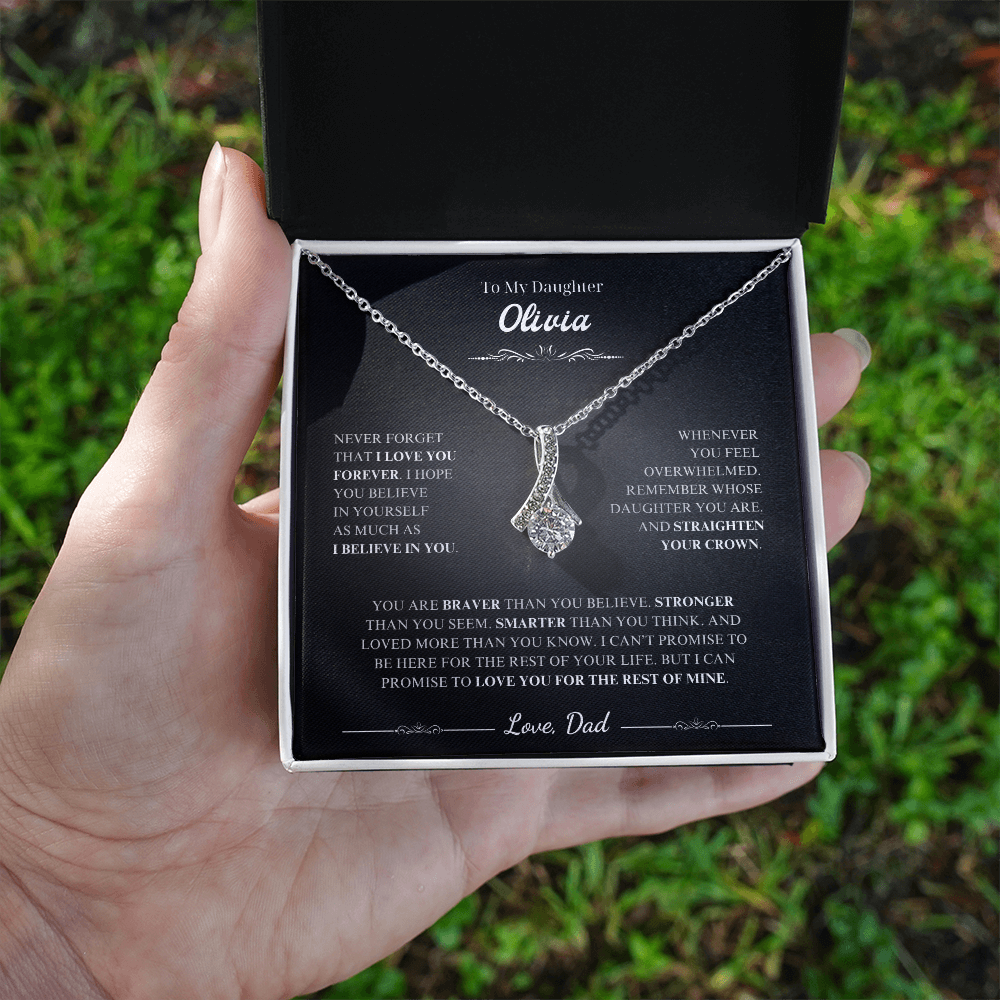 Necklace for Daughter from Dad - Keepsake Jewelry with Loving Message Card A Heartfelt Gift for Your Daughter Surprise your daughter with a timeless treasure she'll cherish forever. Whether it's Christmas, her birthday, graduation, or just because, the alluring beauty necklace jewelry is the perfect way to show your love and support. Crafted with care, this elegant piece combines beauty and sentiment, creating a gift that will light up her heart. Product Highlights A stunning alluring beauty necklace jewelry featuring a sparkling centerpiece surrounded by smaller stones for added brilliance. Pendant dimensions: 15.7mm (height) x 6mm (width). Adjustable 18"-22" cable chain with a secure lobster clasp for a perfect fit. Inspired by timeless alluring beauty necklace jewelry designs, offering elegance and charm. Made with premium materials, including alluring beauty necklace jewelry , ideal for those who love classic and sophisticated jewelry. The alluring beauty necklace jewelry symbolizes an eternal bond, representing the love between you and your daughter in a way words cannot capture. Includes a Special Message Card To My Daughter Never forget that I love you forever. I hope you believe in yourself as much as I believe in you. Whenever you feel overwhelmed, Remember whose daughter you are, And straighten your crown. You are braver than you believe,Stronger than you seem,Smarter than you think,And loved more than you know. I can’t promise to be here for the rest of your life, But I can promise to love you for the rest of mine. Love, Dad Upgrade to Something Extra Special Make your gift truly unforgettable with a Mahogany-Style Luxury Gift Box , featuring a silky interior and built-in LED light to beautifully highlight the love knot necklace sterling silver . Personalization Options Want to make it even more special? Customize the message card with your own heartfelt words. Send us your request within 1 hour of placing your order. What is Included A standard black gift box or a luxury LED wood box (your choice). A beautifully designed gift message card jewelry. Fast shipping: arrives in 3-8 business days. Satisfaction Guaranteed We are committed to ensuring that your gift reflects the special bond between you and your daughter. If you have any questions or requests, please don't hesitate to reach out to us. Show your daughter how much she means to you with the stunning love knot necklace silver or other meaningful designs like the Mother Daughter Necklace Sterling Silver , Daddy Daughter Necklace , Daughter Necklace From Mom , To My Daughter Necklace From Dad , Daddy Daughter Necklace , Necklace For Daughter From Dad , Daughter Necklace , and Father Daughter Necklace . Order now to make her day truly unforgettable. #GiftForDaughter #MeaningfulJewelry #motherdaughternecklacesterlingsilver #daughternecklacefrommom #tomydaughternecklacefromdad #daddydaughternecklace #necklacefordaughterfromdad #daughternecklace #fatherdaughternecklace #AlluringBeautyNecklaceJewelry #AlluringBeautyNecklace #GiftForDaughter #HeartfeltJewelry #DaughterGiftIdeas
