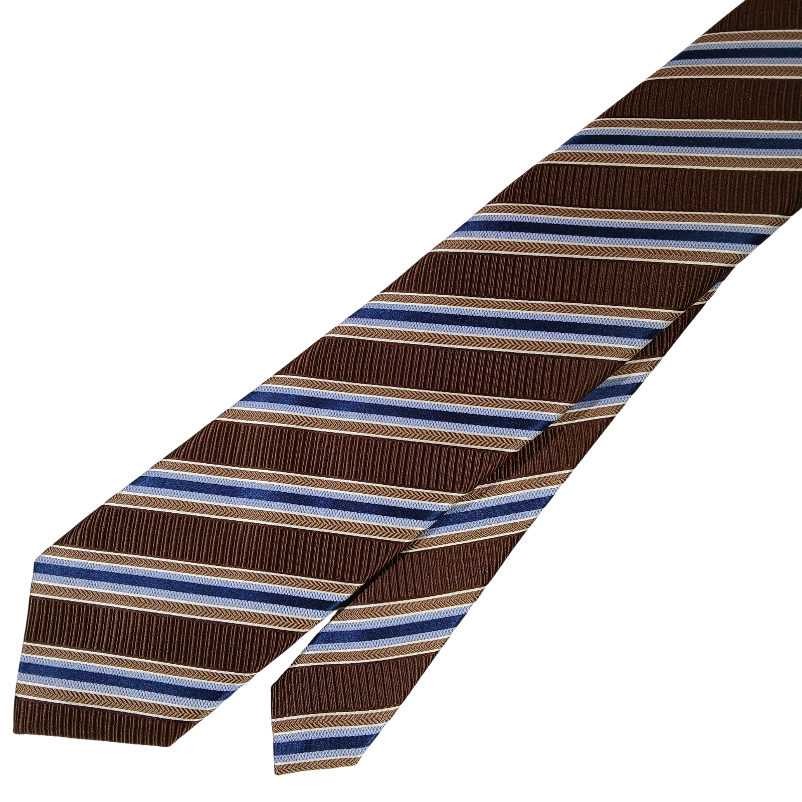 Elevate your formal wardrobe with this David Donahue necktie, featuring a refined brown base accented with blue and tan diagonal stripes. Made in the USA from a silk and cotton blend , this tie offers a slightly more textured hand and a classic, structured drape—ideal for business wear and professional settings. Brand: David Donahue Condition: New with original retail tags Material: 60% Silk / 40% Cotton Color: Brown with blue & tan stripes Pattern: Diagonal stripe Construction: Traditional self-tipped tie Made in USA Standard men’s length (approx. 60")