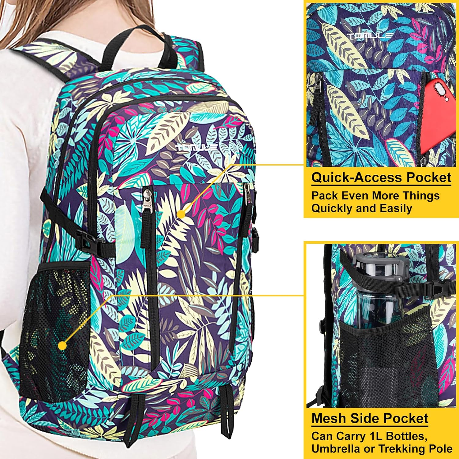High-Density Nylon Imported Convenient compartments - Our hiking backpack is designed with multiple practical pockets. In addition to the main compartment and front pocket, we have a designed quick-access pocket in the front. This allows you to quickly store and retrieve frequently used items without removing the hiking backpack over and over again. The hiking backpack is equipped with a wet pocket inside, which you can easily use to store wet items through a separate zipper entrance, ensuring your other items stay dry. Comfortable to carry - This travel backpack features wider shoulder straps that effectively distribute the pressure on your shoulders, ensuring your back feels relaxed. You can easily adjust the length of the shoulder straps to fit your height, ensuring a comfortable travel experience. The shoulder straps on our travel backpack are equipped with breathable mesh, meaning that during extended periods of carrying, your shoulders will receive good ventilation, preventing discomfort and heat buildup. Protecting your item - This waterproof backpack is made from waterproof and scratch-resistant materials, designed to easily handle the ever-changing outdoor environments. You don't need to worry about rain seeping into the interior of the waterproof backpack and there's no need to be concerned about the waterproof backpack getting scratched by branches or stones. You can enjoy camping activities with peace of mind, knowing that the durability of the waterproof hiking backpack won't be an issue. Ultralight and Packable - Our lightweight hiking backpack is designed to lighten your load, providing a more effortless hiking experience. This lightweight hiking backpack weighs only 0.99 pounds, ensuring that you can use more of your energy to carry equipment during your travel rather than the lightweight hiking backpack itself. When you don't need to carry the lightweight hiking backpack, it can easily fold into a pouch of just 6.6 x 8.2 x 1.9 inches, saving space in your luggage. Journey of Freedom - Our travel backpack comes with a chest buckle to secure its position and compression buckles to keep the travel backpack stable and maintain its shape, helping to maintain your body's balance. There are mesh pockets on both sides of the hiking backpack for holding water bottles and umbrellas. The day hiking backpack have a sunglasses holder, and there are gear loops for camping and hiking, allowing you to free up your hands and enjoy your camping adventures. Product Description 1 Hiking 2 Travel 3 Beach 4 Camping 5 Sport Water-Resistant Material Effectively protect your items from rainwater. Breathable Shoulder Straps Bring comfort to your journey. Sunglasses Holder Don't worry about losing your sunglasses anymore. Adjustable Shoulder Straps You can adjust the shoulder strap length to your preferred size. Foldable and Packable It can be folded into a small pouch, taking up no space in your luggage. 1 Water-Resistant 2 Shoulder Straps 3 Sunglasses Holder 4 Adjust the Length 5 Easy to Carry Product Details Add to Cart Add to Cart Add to Cart Add to Cart Add to Cart Add to Cart Add to Cart Customer Reviews 4.6 out of 5 stars 3,583 4.6 out of 5 stars 3,583 4.6 out of 5 stars 3,583 4.5 out of 5 stars 1,078 4.5 out of 5 stars 1,078 4.6 out of 5 stars 3,583 4.6 out of 5 stars 3,583 Price $22.99 $ 22 . 99 $23.99 $ 23 . 99 $22.99 $ 22 . 99 $19.99 $ 19 . 99 $18.99 $ 18 . 99 $22.99 $ 22 . 99 $19.99 $ 19 . 99 Color Tropical Blue Tropical Red Green Black Green Black Color bar Weight 0.99 pounds 0.99 pounds 0.99 pounds 0.88 pounds 0.88 pounds 0.99 pounds 0.99 pounds Size Standard Standard Standard Small Small Standard Standard Packable ✔ ✔ ✔ ✔ ✔ ✔ ✔ Wet Pocket ✔ ✔ ✔ ✘ ✘ ✔ ✔