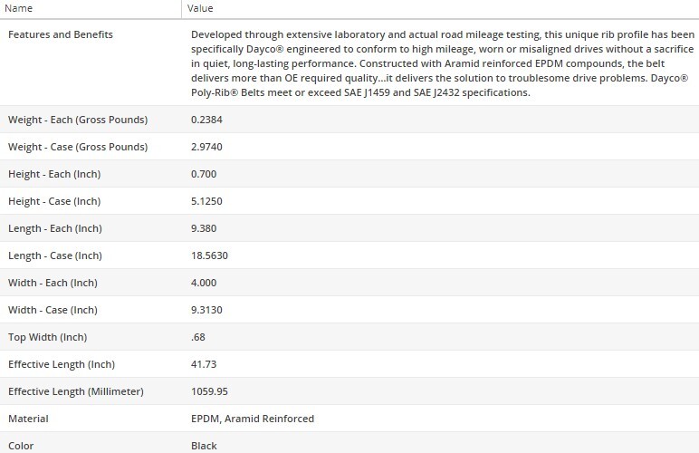 GENUINE DAYCO PRODUCT *100% AUTHENTIC GUARANTEED* Built for passenger cars and light-duty trucks, the extensive line of Dayco Poly Rib serpentine belts are engineered for high mileage, demanding drives found in todays vehicles. As the manufacturer of the first original equipment multi-ribbed serpentine belt, Daycos commitment to automotive product excellence and innovation is unwavering. The Dayco Poly Rib W Profile serpentine belt is the most innovative advancement in serpentine belt design in more than 30 years. Developed through extensive laboratory and actual road mileage testing, this unique rib profile EPDM belt has been engineered to conform to high mileage, worn or misaligned drives and help eliminate noisy belt conditions. Constructed with aramid-reinforced EPDM compounds, the Dayco W Poly Rib serpentine belt delivers more than just OE-required quality. It delivers the solution to troublesome drive problems. Dayco manufactures other serpentine belt constructions for application-specific belt drive systems, such as the ela stretch belt, special deep rib belts for certain import applications, Linear Groove Technology belts and double-sided belts. ela Stretch belt – Designed for direct replacement on accessory drives requiring stretch-type belts, Dayco ela belts are specifically designed for two- to four-point drives where the elastic belt design maintains constant tension on the drive. Deep Rib belt – Dayco discovered that certain import applications perform quietest when the rib depth of the serpentine belt is increased. Dayco added layers of material, increasing the rib depth of the Deep Rib belt, resulting in the best drive belt option for specific import vehicle applications. Double-sided belt– Designed for multiple accessory drives that require the transmission of power from both sides of the belt. The Double-Sided belt, which Dayco introduced to the automotive aftermarket, features a construction that uses a highly fiber-loaded compound on both sides of the belt to maximize load carrying requirements while minimizing pulley misalignment noise. Confirm Your Vehicle Compatibility To confirm that this part fits your vehicle, enter your vehicle's Year, Make, Model, Trim and Engine in the eBay Compatibility Table. Many of the parts we sell at YES Auto Parts only work with specific vehicles. Please double-check the accuracy of your order before purchasing. Check that the reference number, size, and placement are correct. Contact YES Auto Parts If you have any questions, you may reach us via our eBay Contact Form . One of our outstanding customer service representatives from our US-based service centers will respond to your questions or feedback. Shipping Your order will be processed within one business day . We strive to ship every order promptly. We will email you a tracking number when your order ships. Items will ship via major shipping carriers including USPS, FedEx, and UPS. Some items offer faster shipping for a small fee. Please see the Shipping and payments eBay tab for more details on shipping rates and delivery times. We do offer local pickups. Please leave a message when checking out your item. There is an option called [Note to Seller] please leave a Note stating the you would “Like to Pickup this item†also leave a call back number and we will contact you to arrange a pickup time. We participate in the eBay global shipping program. Please see the Shipping and payments eBay tab for details on the countries we ship to outside of the U.S. Customer Satisfaction YES Auto Parts stands for value, selection, and quality. Our goal is to provide a 5-star shopping experience. We give all our customers positive eBay feedback. Please work with us by contacting us if you have a problem before leaving a negative feedback. We will do our best to resolve any problems that occur with your purchase. Returns If you would like to return your new, unopened, and uninstalled part: Go to your My eBay page. Click [Buy] > [Purchase History] on the left sidebar. Find the item you ordered. Below the Leave Feedback button, click [More Actions] > [Return This Item]. Select a reason. The most common reason is Doesn't Fit . Add details like I tried to install this part, and it didn't fit. Click [Request a Return]. Returned parts will be inspected, and a refund given within 5 business days if the part is new, unopened, and uninstalled. Original shipping costs and a restocking fee may be deducted from your refund. If the item has been opened, installed, or used, depending on the condition of the item we might be unable to accept a return due to safety concerns. If the item is in New condition then we will accept your return. Payment Method We accept PayPal, VISA, MasterCard, AMEX, Discover, Debit Card through PayPal as our type of payment. Shipping Policy We process shipment within 1 business day after the payment has been received and cleared. We do ship outside the United States Find the item you ordered. We do ship to APO/FPO. We do ship on weekends and/or holidays. Please provide a correct shipping address so that your item(s) will be delivered on time and will not get lost. THANK YOU FOR YOUR BUSINESS Powered by SixBit's eCommerce Solution