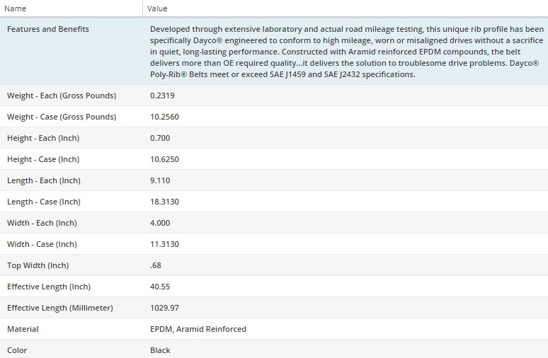 GENUINE DAYCO PRODUCT *100% AUTHENTIC GUARANTEED* Built for passenger cars and light-duty trucks, the extensive line of Dayco Poly Rib serpentine belts are engineered for high mileage, demanding drives found in todays vehicles. As the manufacturer of the first original equipment multi-ribbed serpentine belt, Daycos commitment to automotive product excellence and innovation is unwavering. The Dayco Poly Rib W Profile serpentine belt is the most innovative advancement in serpentine belt design in more than 30 years. Developed through extensive laboratory and actual road mileage testing, this unique rib profile EPDM belt has been engineered to conform to high mileage, worn or misaligned drives and help eliminate noisy belt conditions. Constructed with aramid-reinforced EPDM compounds, the Dayco W Poly Rib serpentine belt delivers more than just OE-required quality. It delivers the solution to troublesome drive problems. Dayco manufactures other serpentine belt constructions for application-specific belt drive systems, such as the ela stretch belt, special deep rib belts for certain import applications, Linear Groove Technology belts and double-sided belts. ela Stretch belt – Designed for direct replacement on accessory drives requiring stretch-type belts, Dayco ela belts are specifically designed for two- to four-point drives where the elastic belt design maintains constant tension on the drive. Deep Rib belt – Dayco discovered that certain import applications perform quietest when the rib depth of the serpentine belt is increased. Dayco added layers of material, increasing the rib depth of the Deep Rib belt, resulting in the best drive belt option for specific import vehicle applications. Double-sided belt– Designed for multiple accessory drives that require the transmission of power from both sides of the belt. The Double-Sided belt, which Dayco introduced to the automotive aftermarket, features a construction that uses a highly fiber-loaded compound on both sides of the belt to maximize load carrying requirements while minimizing pulley misalignment noise. Confirm Your Vehicle Compatibility To confirm that this part fits your vehicle, enter your vehicle's Year, Make, Model, Trim and Engine in the eBay Compatibility Table. Many of the parts we sell at YES Auto Parts only work with specific vehicles. Please double-check the accuracy of your order before purchasing. Check that the reference number, size, and placement are correct. Contact YES Auto Parts If you have any questions, you may reach us via our eBay Contact Form . One of our outstanding customer service representatives from our US-based service centers will respond to your questions or feedback. Shipping Your order will be processed within one business day . We strive to ship every order promptly. We will email you a tracking number when your order ships. Items will ship via major shipping carriers including USPS, FedEx, and UPS. Some items offer faster shipping for a small fee. Please see the Shipping and payments eBay tab for more details on shipping rates and delivery times. We do offer local pickups. Please leave a message when checking out your item. There is an option called [Note to Seller] please leave a Note stating the you would “Like to Pickup this item†also leave a call back number and we will contact you to arrange a pickup time. We participate in the eBay global shipping program. Please see the Shipping and payments eBay tab for details on the countries we ship to outside of the U.S. Customer Satisfaction YES Auto Parts stands for value, selection, and quality. Our goal is to provide a 5-star shopping experience. We give all our customers positive eBay feedback. Please work with us by contacting us if you have a problem before leaving a negative feedback. We will do our best to resolve any problems that occur with your purchase. Returns If you would like to return your new, unopened, and uninstalled part: Go to your My eBay page. Click [Buy] > [Purchase History] on the left sidebar. Find the item you ordered. Below the Leave Feedback button, click [More Actions] > [Return This Item]. Select a reason. The most common reason is Doesn't Fit . Add details like I tried to install this part, and it didn't fit. Click [Request a Return]. Returned parts will be inspected, and a refund given within 5 business days if the part is new, unopened, and uninstalled. Original shipping costs and a restocking fee may be deducted from your refund. If the item has been opened, installed, or used, depending on the condition of the item we might be unable to accept a return due to safety concerns. If the item is in New condition then we will accept your return. Payment Method We accept PayPal, VISA, MasterCard, AMEX, Discover, Debit Card through PayPal as our type of payment. Shipping Policy We process shipment within 1 business day after the payment has been received and cleared. We do ship outside the United States Find the item you ordered. We do ship to APO/FPO. We do ship on weekends and/or holidays. Please provide a correct shipping address so that your item(s) will be delivered on time and will not get lost. THANK YOU FOR YOUR BUSINESS Powered by SixBit's eCommerce Solution