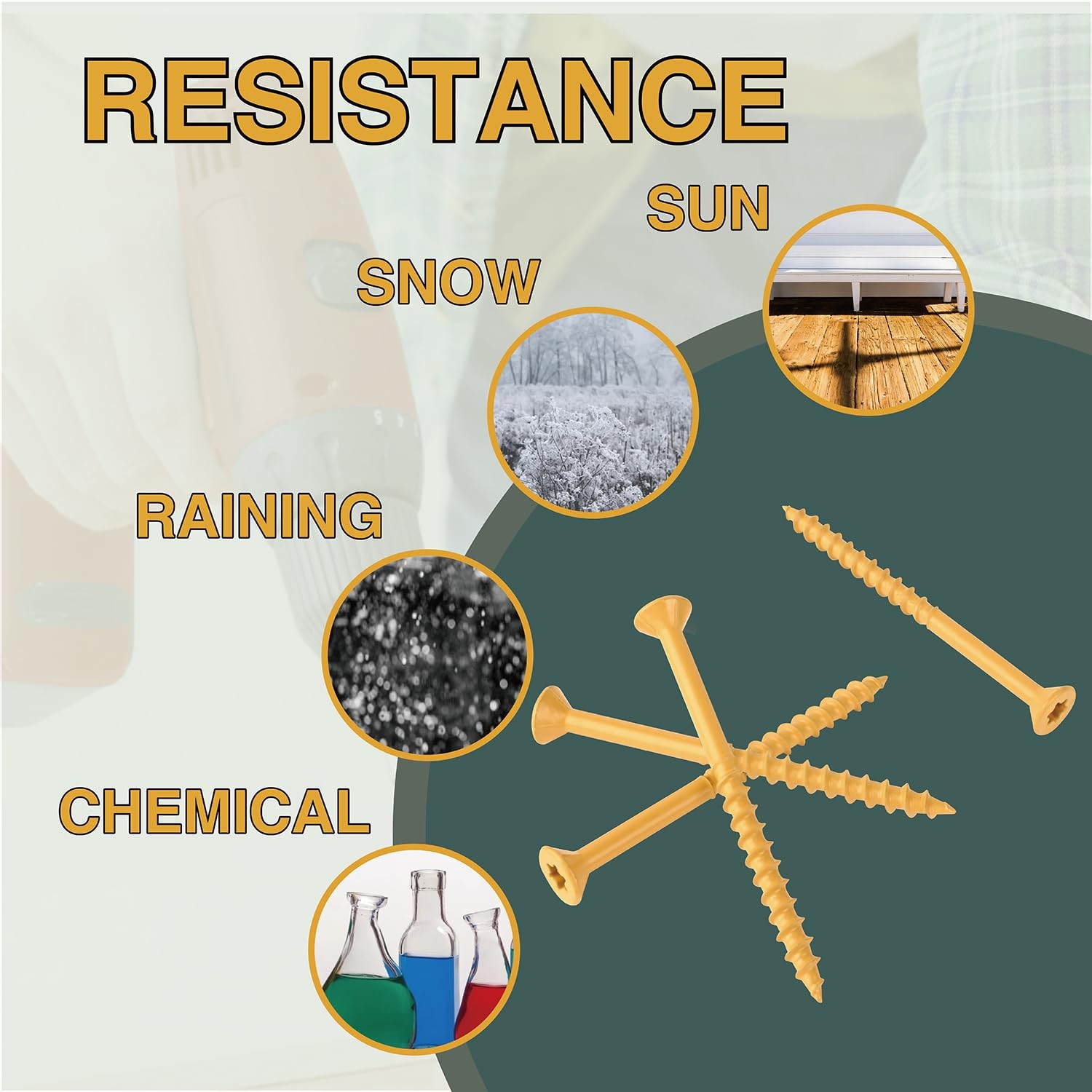 Deck Screws Rust ResistantOutdoor Structural Screws, Torx Drive Screws Brilliant Yellow Ruspert Coating Rust Proof [High Quality Coating]: The surface of the deck screws is covered with three high performance coatings, which provides excellent protection against rust and decay in adverse outdoor weather [Easy to Use]: No pre-drilling required. This decking screws with self-attack point can be used directly in engineering. Its thick thread also increases the tapping force [Tail Cutting]: Wood screws with tail cutting design can better avoid wood cracking during construction [Torx/Star Drive]:The star/torx drive has 6 contact points that prevent the screws from peeling and make them easier to secure into the wood. We will give you two bits, so that you can save more worry and effort during construction [Package]: The plastic box contains 315 PCS #10 x 3" deck screws and 2 T-25 drive bits. If you have any questions about the product, feel free to contact us and we will help you