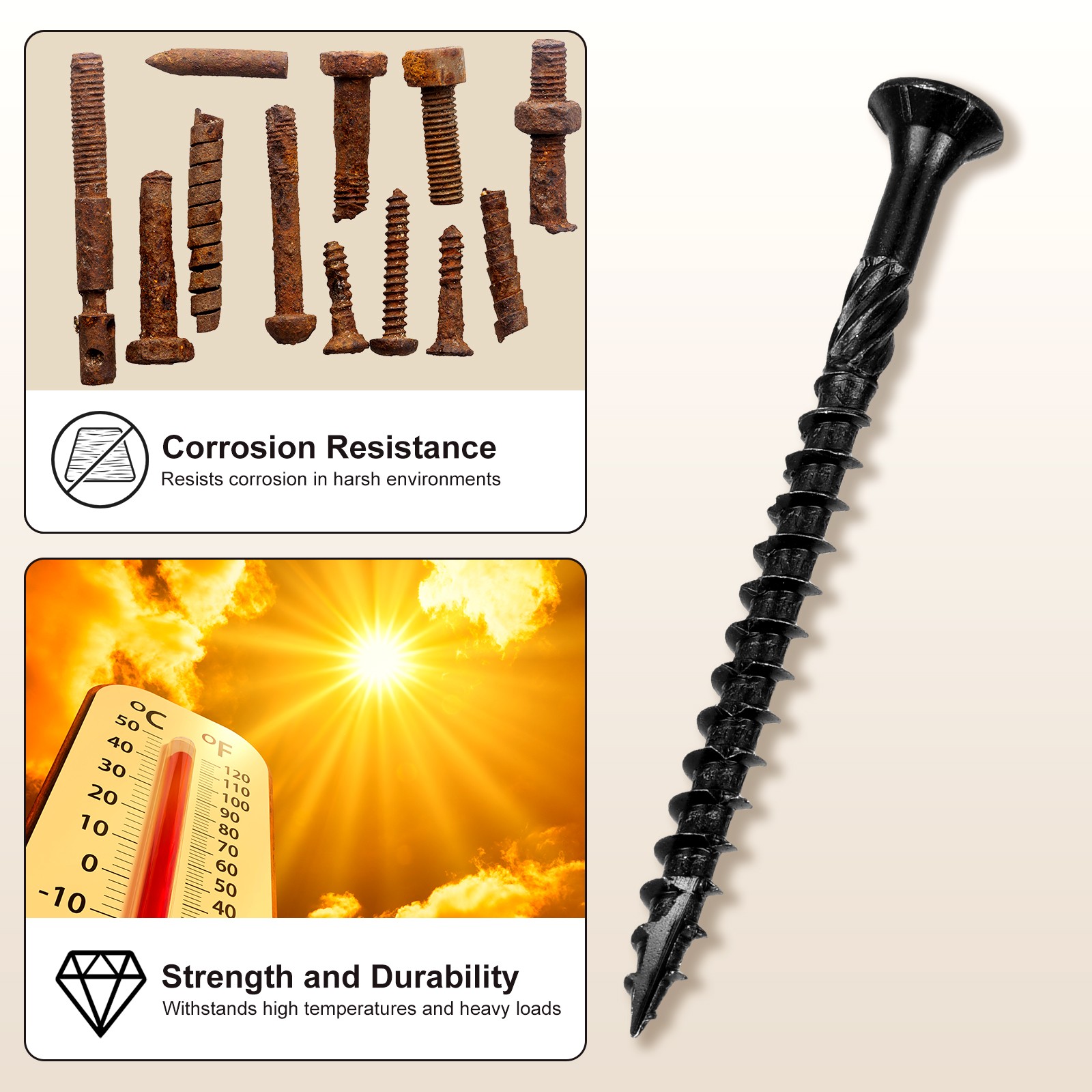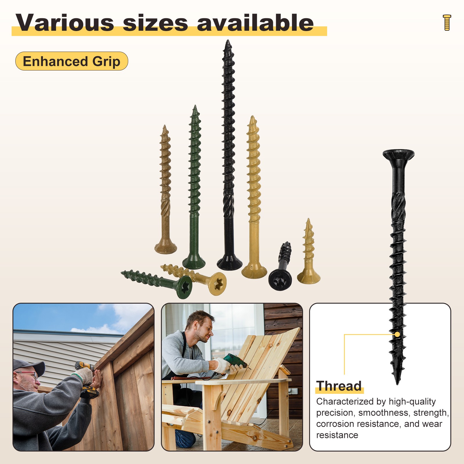 Document APPLY TO - This versatile deck screw is suitable for a wide array of wooden applications, including but not limited to patios, fences, frames, farm structures, ladders, outdoor furniture, pet houses, doors, tables, chairs, shelves, and workbenches. SPECIFICATION:Screw Size: #10x2-1/4"(Thread Dia x Length)Tail Type: Type 17Slot number: T25Color:BlackMaterial: Carbon SteelQUANTITY INCLUDED - 400Pcs x Deck Wood Screws; 1Pcs Torx BitADVANTAGE - Constructed from carbon steel with an advanced anti-corrosion treatment, these screws exhibit superior resistance to rust and corrosion. They have been tested for 1000 hours under salt spray conditions, ensuring reliable performance in both extreme heat and cold. This makes them highly durable and long-term use in various environments.DESIGN - The star drive design ensures a secure grip, minimizing the risk of slippage during installation and removal. The fine-point 17-gauge tip allows for effortless penetration into different types of wood, including hardwoods, softwoods, and pressure-treated materials. Additionally, the coarse serrated threads, and damping knurled shoulder and tail cutting design provide a robust hold, reducing board separation and enhancing overall structural stability.Note - Before purchasing, it’s recommended to use a caliper to verify the correct size for precise measurements, as rulers or tape measures might not be accurate enough. Deck Screws(#10x2-1/4") 400Pcs,Carbon Steel Wood Screw with T25 Torx Drive,Black APPLY TO - This versatile deck screw is suitable for a wide array of wooden applications, including but not limited to patios, fences, frames, farm structures, ladders, outdoor furniture, pet houses, doors, tables, chairs, shelves, and workbenches. SPECIFICATION: Screw Size: #10x2-1/4"(Thread Dia x Length) Tail Type: Type 17 Slot number: T25 Color:Black Material: Carbon Steel QUANTITY INCLUDED - 400Pcs x Deck Wood Screws; 1Pcs Torx Bit ADVANTAGE - Constructed from carbon steel with an advanced anti-corrosion treatment, these screws exhibit superior resistance to rust and corrosion. They have been tested for 1000 hours under salt spray conditions, ensuring reliable performance in both extreme heat and cold. This makes them highly durable and long-term use in various environments. DESIGN - The star drive design ensures a secure grip, minimizing the risk of slippage during installation and removal. The fine-point 17-gauge tip allows for effortless penetration into different types of wood, including hardwoods, softwoods, and pressure-treated materials. Additionally, the coarse serrated threads, and damping knurled shoulder and tail cutting design provide a robust hold, reducing board separation and enhancing overall structural stability. Note - Before purchasing, it’s recommended to use a caliper to verify the correct size for precise measurements, as rulers or tape measures might not be accurate enough. Hot Item Payment 1.We accept eBay payment . 2.Payment must be received within 7 business days of auction closing. Shipping 1.We ship to your eBay or Paypal address. Please make sure your eBay and Paypal address is correct before you pay. 2.Items will be shipped within 1-3 business day when we received payment. 3.Delivery time depends on destination and other factors. Description Policy Deck Screws(#10x2-1/4") 400Pcs,Carbon Steel Wood Screw with T25 Torx Drive,Black APPLY TO - This versatile deck screw is suitable for a wide array of wooden applications, including but not limited to patios, fences, frames, farm structures, ladders, outdoor furniture, pet houses, doors, tables, chairs, shelves, and workbenches. SPECIFICATION: Screw Size: #10x2-1/4"(Thread Dia x Length) Tail Type: Type 17 Slot number: T25 Color:Black Material: Carbon Steel QUANTITY INCLUDED - 400Pcs x Deck Wood Screws; 1Pcs Torx Bit ADVANTAGE - Constructed from carbon steel with an advanced anti-corrosion treatment, these screws exhibit superior resistance to rust and corrosion. They have been tested for 1000 hours under salt spray conditions, ensuring reliable performance in both extreme heat and cold. This makes them highly durable and long-term use in various environments. DESIGN - The star drive design ensures a secure grip, minimizing the risk of slippage during installation and removal. The fine-point 17-gauge tip allows for effortless penetration into different types of wood, including hardwoods, softwoods, and pressure-treated materials. Additionally, the coarse serrated threads, and damping knurled shoulder and tail cutting design provide a robust hold, reducing board separation and enhancing overall structural stability. Note - Before purchasing, it’s recommended to use a caliper to verify the correct size for precise measurements, as rulers or tape measures might not be accurate enough. Hot Item Payment 1.We accept eBay payment . 2.Payment must be received within 7 business days of auction closing. Shipping 1.We ship to your eBay or Paypal address. Please make sure your eBay and Paypal address is correct before you pay. 2.Items will be shipped within 1-3 business day when we received payment. 3.Delivery time depends on destination and other factors.