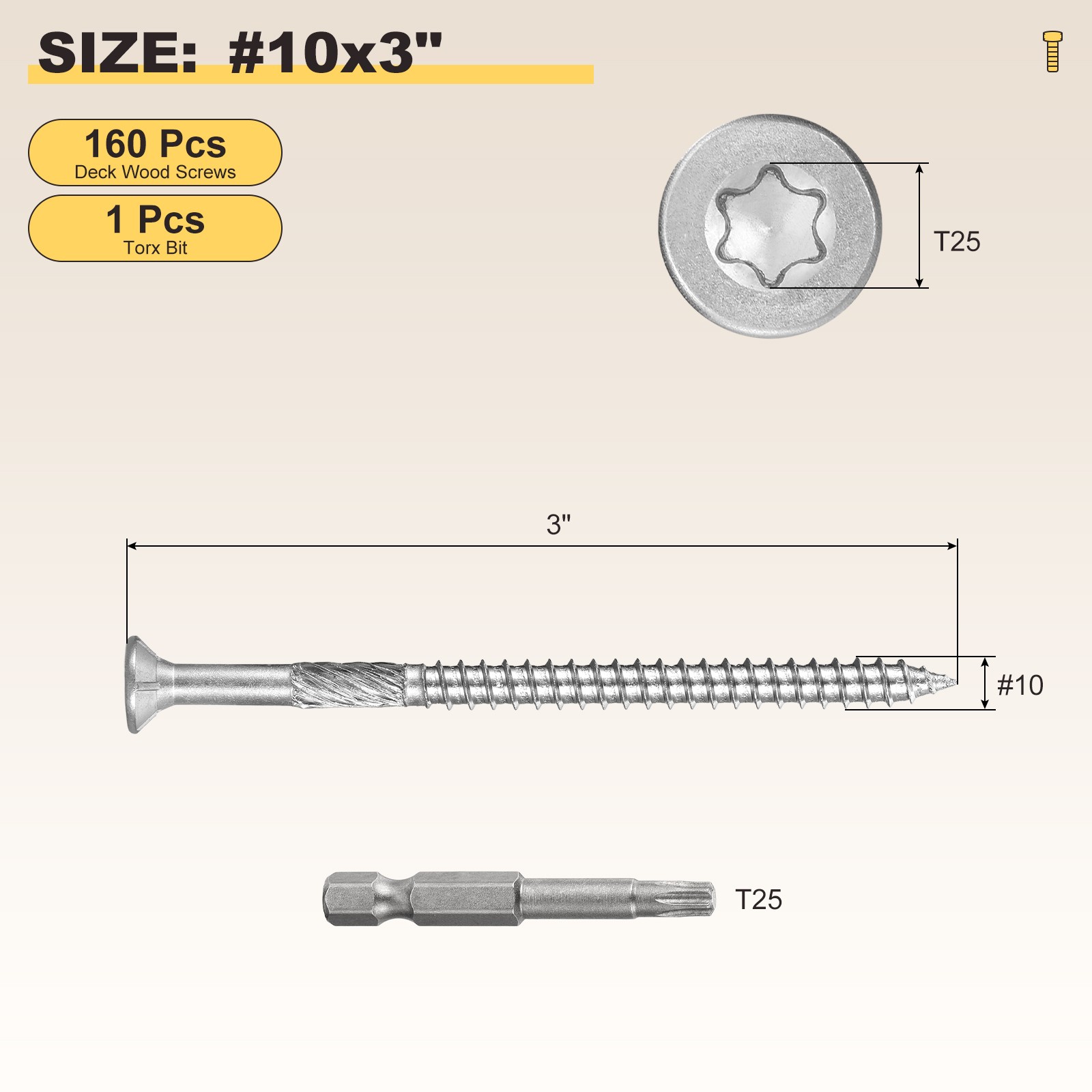 Document APPLY TO - This versatile deck screw is suitable for a wide array of wooden applications, including but not limited to patios, fences, frames, farm structures, ladders, outdoor furniture, pet houses, doors, tables, chairs, shelves, and workbenches. SPECIFICATION:Screw Size: #10x3"(Thread Dia x Length)Tail Type: Type 17Slot number: T25Color: SilverMaterial: 410 Stainless SteelQUANTITY INCLUDED - 160Pcs x Deck Wood Screws; 1Pcs Torx BitADVANTAGE - These screws are made of 410 stainless steel, which is corrosion-resistant, high in hardness and strength, can firmly fix materials, is not easy to break, and is not easy to deform.DESIGN - The star drive design ensures a secure grip, minimizing the risk of slippage during installation and removal. The fine-point 17-gauge tip allows for effortless penetration into different types of wood, including hardwoods, softwoods, and pressure-treated materials. Additionally, the coarse serrated threads, and damping knurled shoulder and tail cutting design provide a robust hold, reducing board separation and enhancing overall structural stability.Note - Before purchasing, it’s recommended to use a caliper to verify the correct size for precise measurements, as rulers or tape measures might not be accurate enough. Deck Screws(#10x3") 160Pcs, 410 Stainless Steel Wood Screws, Silver APPLY TO - This versatile deck screw is suitable for a wide array of wooden applications, including but not limited to patios, fences, frames, farm structures, ladders, outdoor furniture, pet houses, doors, tables, chairs, shelves, and workbenches. SPECIFICATION: Screw Size: #10x3"(Thread Dia x Length) Tail Type: Type 17 Slot number: T25 Color: Silver Material: 410 Stainless Steel QUANTITY INCLUDED - 160Pcs x Deck Wood Screws; 1Pcs Torx Bit ADVANTAGE - These screws are made of 410 stainless steel, which is corrosion-resistant, high in hardness and strength, can firmly fix materials, is not easy to break, and is not easy to deform. DESIGN - The star drive design ensures a secure grip, minimizing the risk of slippage during installation and removal. The fine-point 17-gauge tip allows for effortless penetration into different types of wood, including hardwoods, softwoods, and pressure-treated materials. Additionally, the coarse serrated threads, and damping knurled shoulder and tail cutting design provide a robust hold, reducing board separation and enhancing overall structural stability. Note - Before purchasing, it’s recommended to use a caliper to verify the correct size for precise measurements, as rulers or tape measures might not be accurate enough. Hot Item Payment 1.We accept eBay payment . 2.Payment must be received within 7 business days of auction closing. Shipping 1.We ship to your eBay or Paypal address. Please make sure your eBay and Paypal address is correct before you pay. 2.Items will be shipped within 1-3 business day when we received payment. 3.Delivery time depends on destination and other factors. Description Policy Deck Screws(#10x3") 160Pcs, 410 Stainless Steel Wood Screws, Silver APPLY TO - This versatile deck screw is suitable for a wide array of wooden applications, including but not limited to patios, fences, frames, farm structures, ladders, outdoor furniture, pet houses, doors, tables, chairs, shelves, and workbenches. SPECIFICATION: Screw Size: #10x3"(Thread Dia x Length) Tail Type: Type 17 Slot number: T25 Color: Silver Material: 410 Stainless Steel QUANTITY INCLUDED - 160Pcs x Deck Wood Screws; 1Pcs Torx Bit ADVANTAGE - These screws are made of 410 stainless steel, which is corrosion-resistant, high in hardness and strength, can firmly fix materials, is not easy to break, and is not easy to deform. DESIGN - The star drive design ensures a secure grip, minimizing the risk of slippage during installation and removal. The fine-point 17-gauge tip allows for effortless penetration into different types of wood, including hardwoods, softwoods, and pressure-treated materials. Additionally, the coarse serrated threads, and damping knurled shoulder and tail cutting design provide a robust hold, reducing board separation and enhancing overall structural stability. Note - Before purchasing, it’s recommended to use a caliper to verify the correct size for precise measurements, as rulers or tape measures might not be accurate enough. Hot Item Payment 1.We accept eBay payment . 2.Payment must be received within 7 business days of auction closing. Shipping 1.We ship to your eBay or Paypal address. Please make sure your eBay and Paypal address is correct before you pay. 2.Items will be shipped within 1-3 business day when we received payment. 3.Delivery time depends on destination and other factors.