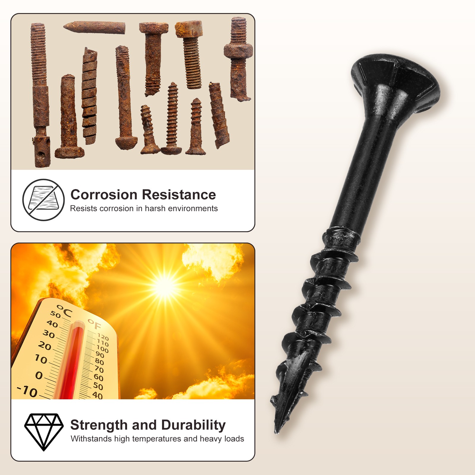Document APPLY TO - This versatile deck screw is suitable for a wide array of wooden applications, including but not limited to patios, fences, frames, farm structures, ladders, outdoor furniture, pet houses, doors, tables, chairs, shelves, and workbenches. SPECIFICATION:Screw Size: #8x1-5/8"(Thread Dia x Length)Tail Type: Type 17Slot number: T25Color: BlackMaterial: Carbon SteelQUANTITY INCLUDED - 200Pcs x Deck Wood Screws; 1Pcs Torx BitADVANTAGE - Constructed from carbon steel with an advanced anti-corrosion treatment, these screws exhibit superior resistance to rust and corrosion. They have been tested for 1000 hours under salt spray conditions, ensuring reliable performance in both extreme heat and cold. This makes them highly durable and long-term use in various environments.DESIGN - The star drive design ensures a secure grip, minimizing the risk of slippage during installation and removal. The fine-point 17-gauge tip allows for effortless penetration into different types of wood, including hardwoods, softwoods, and pressure-treated materials. Additionally, the coarse serrated threads provide a robust hold, reducing board separation and enhancing overall structural stability.Note - Before purchasing, it's recommended to use a caliper to verify the correct size for precise measurements, as rulers or tape measures might not be accurate enough. Deck Screws(#8x1-5/8") 200Pcs,Carbon Steel Wood Screw with T25 Torx Drive,Black APPLY TO - This versatile deck screw is suitable for a wide array of wooden applications, including but not limited to patios, fences, frames, farm structures, ladders, outdoor furniture, pet houses, doors, tables, chairs, shelves, and workbenches. SPECIFICATION: Screw Size: #8x1-5/8"(Thread Dia x Length) Tail Type: Type 17 Slot number: T25 Color: Black Material: Carbon Steel QUANTITY INCLUDED - 200Pcs x Deck Wood Screws; 1Pcs Torx Bit ADVANTAGE - Constructed from carbon steel with an advanced anti-corrosion treatment, these screws exhibit superior resistance to rust and corrosion. They have been tested for 1000 hours under salt spray conditions, ensuring reliable performance in both extreme heat and cold. This makes them highly durable and long-term use in various environments. DESIGN - The star drive design ensures a secure grip, minimizing the risk of slippage during installation and removal. The fine-point 17-gauge tip allows for effortless penetration into different types of wood, including hardwoods, softwoods, and pressure-treated materials. Additionally, the coarse serrated threads provide a robust hold, reducing board separation and enhancing overall structural stability. Note - Before purchasing, it's recommended to use a caliper to verify the correct size for precise measurements, as rulers or tape measures might not be accurate enough. Hot Item Payment 1.We accept eBay payment . 2.Payment must be received within 7 business days of auction closing. Shipping 1.We ship to your eBay or Paypal address. Please make sure your eBay and Paypal address is correct before you pay. 2.Items will be shipped within 1-3 business day when we received payment. 3.Delivery time depends on destination and other factors. Description Policy Deck Screws(#8x1-5/8") 200Pcs,Carbon Steel Wood Screw with T25 Torx Drive,Black APPLY TO - This versatile deck screw is suitable for a wide array of wooden applications, including but not limited to patios, fences, frames, farm structures, ladders, outdoor furniture, pet houses, doors, tables, chairs, shelves, and workbenches. SPECIFICATION: Screw Size: #8x1-5/8"(Thread Dia x Length) Tail Type: Type 17 Slot number: T25 Color: Black Material: Carbon Steel QUANTITY INCLUDED - 200Pcs x Deck Wood Screws; 1Pcs Torx Bit ADVANTAGE - Constructed from carbon steel with an advanced anti-corrosion treatment, these screws exhibit superior resistance to rust and corrosion. They have been tested for 1000 hours under salt spray conditions, ensuring reliable performance in both extreme heat and cold. This makes them highly durable and long-term use in various environments. DESIGN - The star drive design ensures a secure grip, minimizing the risk of slippage during installation and removal. The fine-point 17-gauge tip allows for effortless penetration into different types of wood, including hardwoods, softwoods, and pressure-treated materials. Additionally, the coarse serrated threads provide a robust hold, reducing board separation and enhancing overall structural stability. Note - Before purchasing, it's recommended to use a caliper to verify the correct size for precise measurements, as rulers or tape measures might not be accurate enough. Hot Item Payment 1.We accept eBay payment . 2.Payment must be received within 7 business days of auction closing. Shipping 1.We ship to your eBay or Paypal address. Please make sure your eBay and Paypal address is correct before you pay. 2.Items will be shipped within 1-3 business day when we received payment. 3.Delivery time depends on destination and other factors.