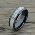 Men's Deer Antler Ring in Black Ceramic, 8mm Comfort Fit Wedding Band Ceramic Material Genuine White Tail Antler inlay From Sheds 8mm Wide Comfort Fit Design Lightweight durable and scratch resistant Waterproof Epoxy layer protects the inlay Ceramic rings are not the same material as the ceramic that you would find at crafting stores or home store. Ceramic Rings are made out of jewelry grade zirconium ceramic, also known as a titanium carbide. Jewelry grade Ceramic is incredibly hard and virtually scratch proof in any color. The luster of ceramic rings are much like tungsten rings where the surface shine will last a lifetime. However ceramic is much lighter than tungsten which aids in the appeal. Males Shed their antlers and re grow new ones every year. Our antler is harvested from these sheds that are picked up off the ground after a buck has lost them.