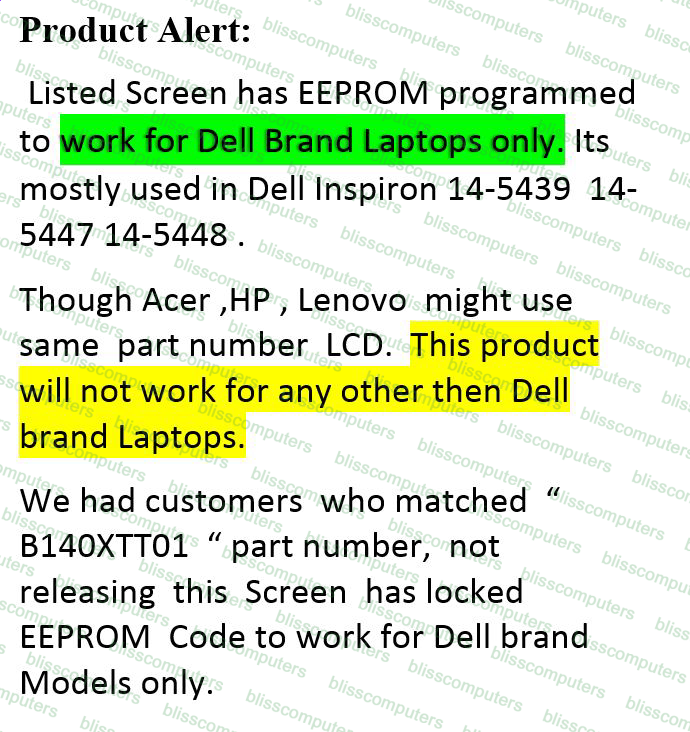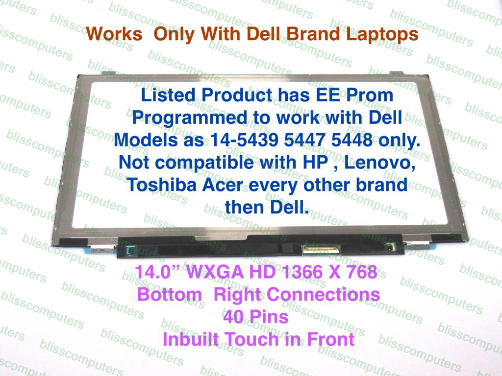 Dell 4D3YR 4D3YR B140XTT01 .2 Dell I14-5447 14 Touch Screen Digitzer LCD Verification Note 1. We need your existing screen part number. 2. We need your laptop service tag to match up connection with Dell. Ghost Touch, Running Touch, No-Touch, and Inverted Touch are not screen related issues. Kindly check your digitizer board and cable since they are the most likely cause of any touch issue; please do not open a return claiming the touch did not work. If the machine has a weakened or fragile digitizer board, the replacement unit or assembly will not have proper touch or in some cases it may not have touch at all. Important Note Provide Laptop service tag if you are clueless about screen you need. Part number: B140XTT01.2 Dell 0VXKJX B140XTT01.0 AUO103C B140XTT01.2 Dell 4D3YR 04D3YR B140XTT01.3 AUO133C EDID B140XTT01.3 AUO133C EDID B140XTT01.3 Dell 6V83Y 06V83Y Dell 6V83Y 06V83Y AUO133C EDID AUO133C EDID HB140WH1-504 DELL GJK57 Model number: Dell Inspiron 14 (3443) Dell Inspiron 14 (5447) Dell Inspiron 14 (5448) Dell Inspiron 14 (5439) Dell Inspiron 14 5458 Dell Inspiron 14 5459 Desc Note: Product Alert: Listed Screen has EEPROM programmed to work for Dell Brand Laptops only. Its mostly used in Dell Inspiron 14-5439 14-5447 14-5448 . Though Acer ,HP , Lenovo might use same part number LCD. This product will not work for any other then Dell brand Laptops. We had customers who matched B140XTT01 part number, not releasing this Screen has locked EEPROM Code to work for Dell brand Models only. Title - B140XTT01, I14-5447, DELL 14, DELL 4D3YR Important Notice About Your Order & Shipping You will receive only the item shown and paid for in the listing. Please note that we do not include free tape, adhesive, installation guides, or any other extras. As a business, we cannot provide free items, and we appreciate your understanding. Need Tape ? You can purchase it separately eBay Item 355286906103 Freight Forwarding Advisory We strongly advise against using freight forwarding companies, as they often mishandle packages—damaging boxes, altering packaging, or stacking heavy items on fragile ones. Since an extra party is involved in handling, FedEx, UPS, and USPS will not honor breakage claims , and unfortunately, we cannot assist with such damages either. If you must use a freight forwarder, we recommend: ✅ Asking them to double-box your package for extra protection. ✅ Purchasing insurance to cover any potential damage, as you’ll need to handle claims directly with the insurance provider. Our products contain fragile glass and are not designed for rough handling by freight forwarders. Please take precautions to protect your order. .