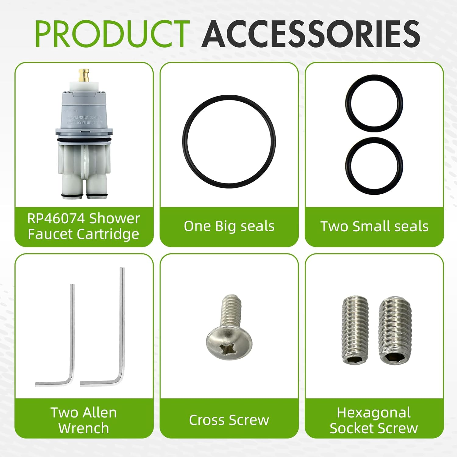 Wide Compatible:The RP46074 shower cartridge assembly for single handle function repair kit, Replacement for 13/14 series shower bathtub & shower faucet cartridge (For MultiChoice 13/14 Series tub & showers after March 2006) Flexible Control: Built-in temperature control valve controls water temperature within a safe range of ±3.6°F to prevent scalding or chilling due to sudden changes in water temperature High Quality: Single handle universal valve cartridge repair assembly is made of high-quality brass and engineering-grade plastic, sturdy and not easy to deform, saving half the cost Easy Installation: The rp46074 cartridge is easy to install and requires no other tools or modifications Before installing a new cartridge, remember to clean all contaminants in the area of the valve Package Including: RP46074 shower valve cartridge & RP22734 bunnet nut and installation accessories (An additional set of waterproof gaskets is included) Product Description DELTA CARTRIDGE RP46074 Installation in just a few steps