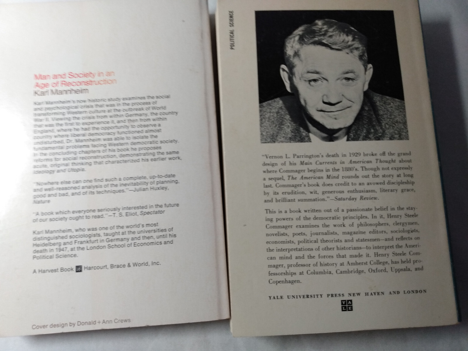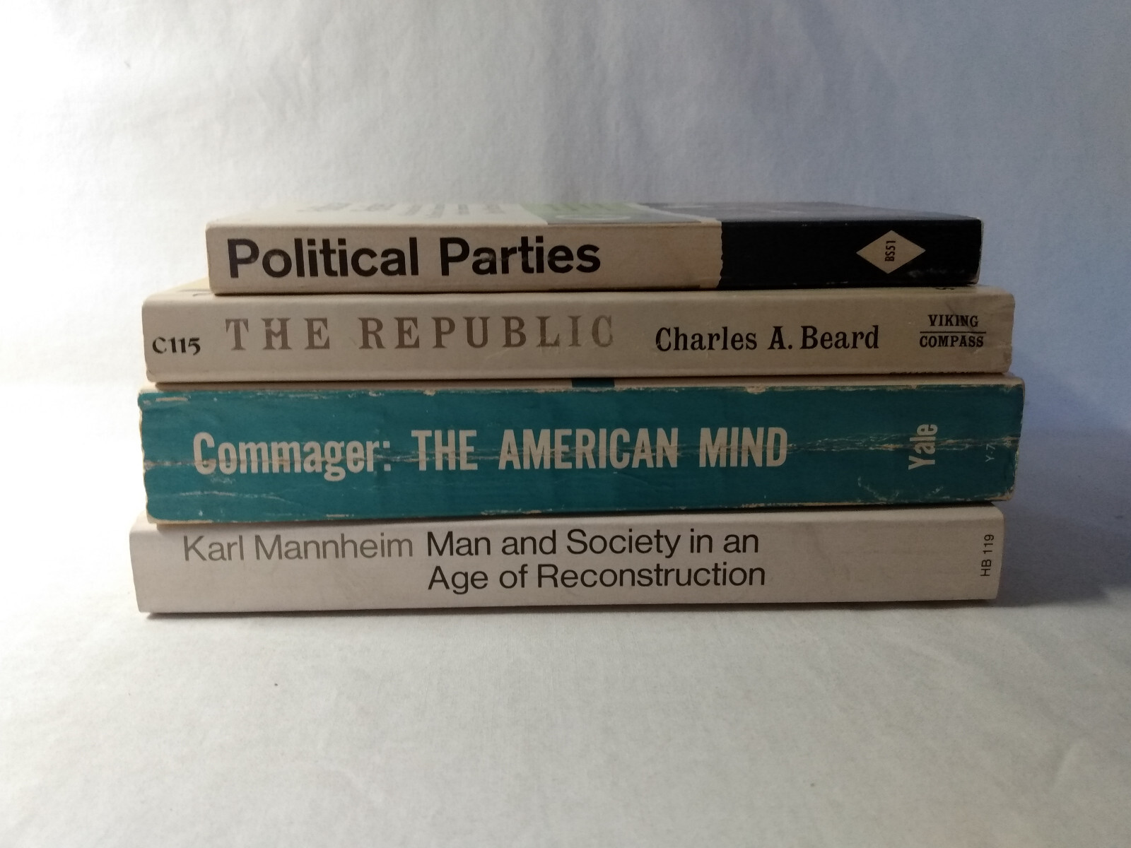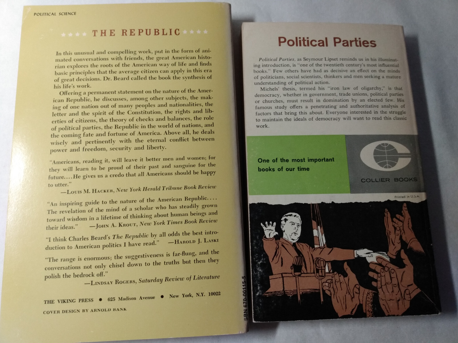 Nice lot of 4 soft cover political philosophy books, mostly on democracy and republics! Includes works by Charles Beard, Henry Steele Commager, and more. Please see pictures for titles and more information! Minor wear and blemishing to pages and covers, bit more wear to cover edges, some discoloring to covers and spines. One book has pen markings to pages throughout.