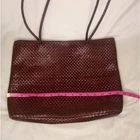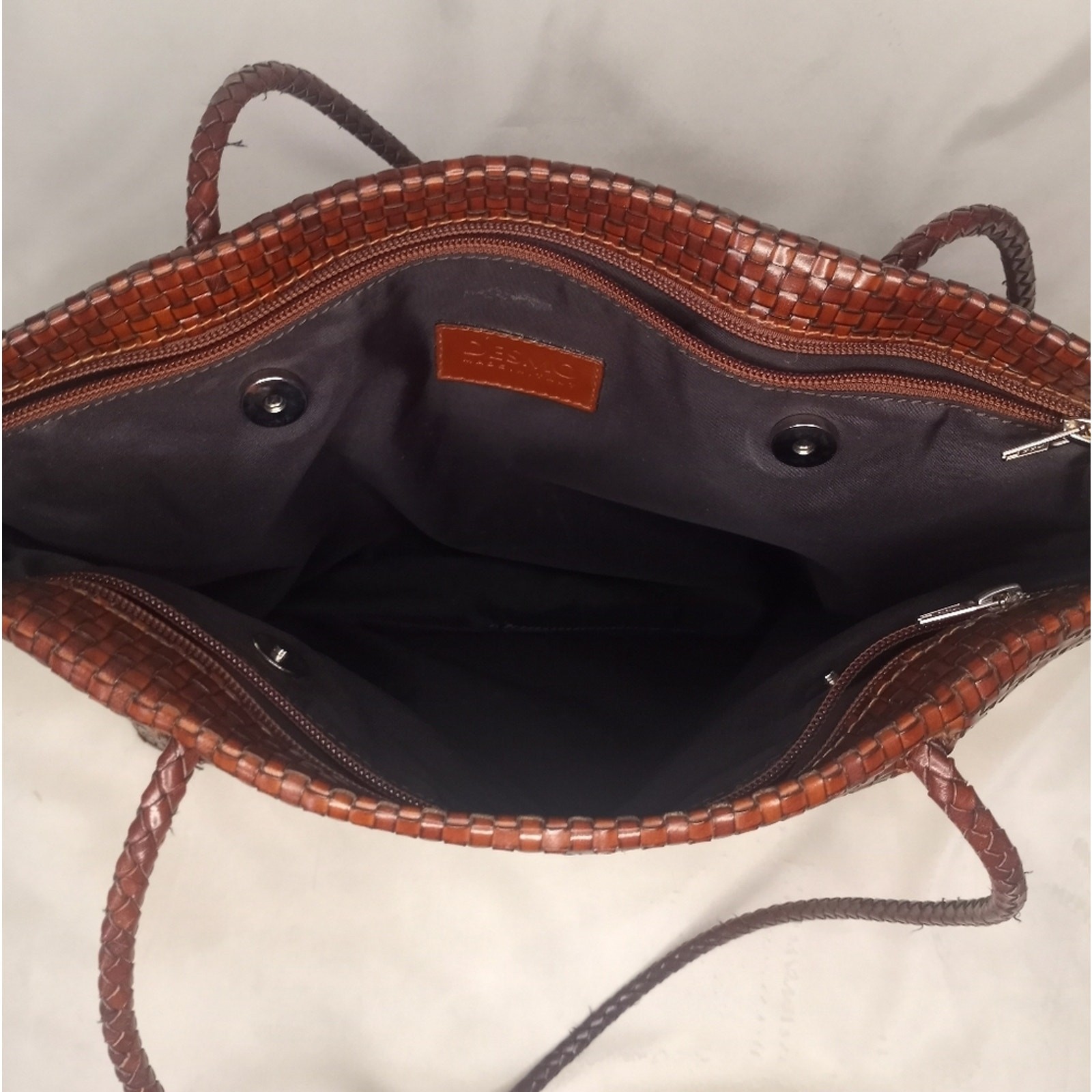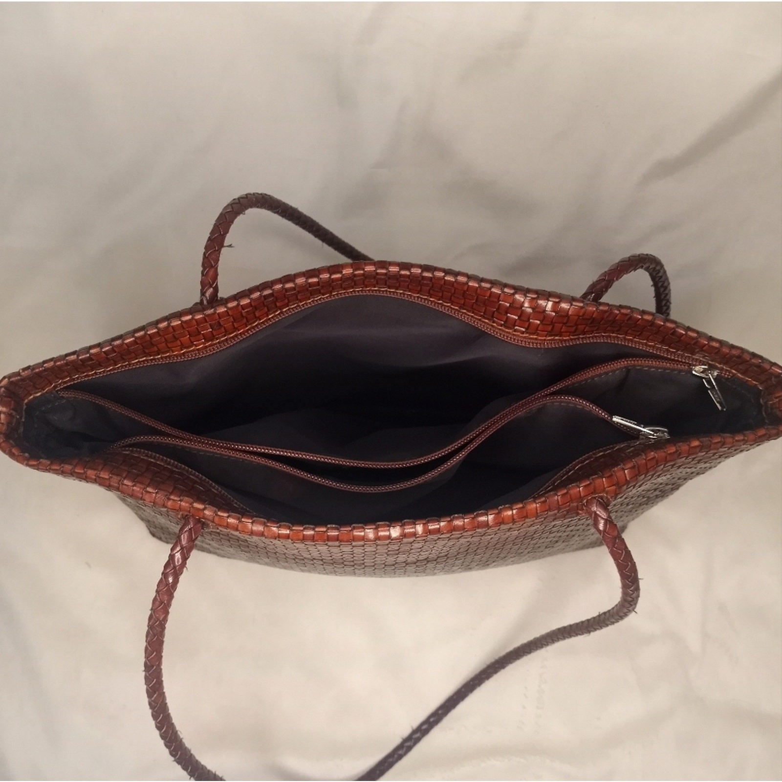 Desmo Italian Made Woven Keather Bag in Rich Tones of Chocolate Brown, Caramel and Burgundy, Beautiful Quality Craftmanship, Classic, Timeless, Quiet Luxury, 3 Large Compartments, 2 Zippered on the Sides and Middlecwith Magnetic Closures, No Flaws, Rare, Elegant, Classy, Old Money, Statement Piece