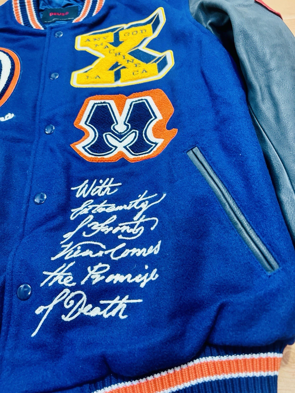 The Deus Ex Machina Varsity Jacket in size L combines wool and leather materials to create a stylish and versatile outerwear piece. With features like an elastic collar, lightweight design, and pockets, this jacket offers both comfort and functionality. The limited edition design, detailed with embroidered logos and a button closure, is perfect for various occasions such as travel, parties, and casual wear during the winter, fall, and spring seasons. Made with quality craftsmanship and a unique animal print pattern, this jacket is a standout piece for any man's wardrobe. MRP:- $560 Condition:- NEW WITHOUT TAGS 9/10