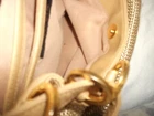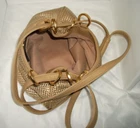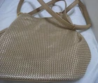 Diahann Carroll Handbag woven golden nylon purse with strap. Measures from top of shoulder strap to bottom of purse is 25 inches. Purse is about 12 inches wide and 10 inches deep. Has four gold tone 1-inch rings on each side of the top of the purse to hold the strap. Purse is a single compartment with small zipper pouch. I'm 5'2'' it hangs about waist length. Lightweight until you start putting all your goodies in it. See pictures. Sold as is.