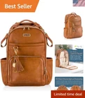 Diaper Bag Backpack – Large Capacity Boss Plus Baby Backpack Diaper Bag Featuring 19 Pockets, Changing Pad, Stroller Clips, and Comfortable Backpack Straps, Cognac 19 MULTI-FUNCTIONAL POCKETS: 's Boss Plus baby backpack diaper bag features a remarkable 19 multi-functional pockets. From 13 internal pockets to 6 external ones, including 2 insulated bottle pockets, this bag has you covered. Measuring "L x 10"W x 18"H, this spacious backpack diaper bag provides ample room for all your baby essentials. QUICK ACCESS AT YOUR FINGERTIPS: Our Boss Plus diaper backpack goes the extra mile for parents. With a tall, zippered front external pocket and an easy-access front "mom" pocket equipped with 3 pockets and a key lanyard, you'll never fumble for what you need. STROLLER STRAPS & EASY-WIPE CHANGING PAD: Designed for modern parents, each Boss Plus baby diaper bag backpack comes with coordinating stroller straps and an easy-wipe changing pad that has its own zippered pocket. Plus, the changing pad features adorable "head and toes" prints, making diaper changes a breeze, anytime, anywhere. RUBBER FEET WITH NEW BRAIDED DESIGN: The Boss Plus diaper bag features our signature rubber feet with a new braided design on the bottom of the backpack. Our signature rubber feet offer enough stability that keep the bag upright and the bottom clean, no matter how much you stuff it. ELEGANTLY MODERN, CLASSICALLY CHIC: Elevate your style with our Cognac Boss Plus design. This exquisite diaper backpack features a sun-printed interior, and a removable vegan leather accent tassel adorned with an engraved chain charm, adding a dash of sophistication to your ensemble. Our Boss Plus diaper bags are so stylish that they can also be used as work bags, gym bags, or carry-ons while traveling, extending their utility long after your baby has outgrown diapers. Meet ’s Boss Plus diaper bag backpack - your forever bag for baby & beyond, every (little) step along the way! The Boss Plus backpack baby diaper bag is everything you love in our original Boss Backpack with a sleek design and premium features. Elevated with thoughtful organization and style, this baby bag backpack is perfect to take on your new babe’s journey – from all packed up to welcome baby at the hospital to adventurous playdates to an amazing work, pumping or me-time bag for you. Plus, this is the ultimate baby diaper bag backpack with changing pad for those with a passion for travel as an airplane carry-on or a car seat tag-along. It can even hold up to a 15” laptop in the laptop pocket! With even more pockets – 19 total! – this is our most organized large diaper backpack yet and includes must-have features like insulated side bottle pockets, comfy shoulder straps, a roomy main compartment, a felt lined valuables pocket, ’s signature rubber bottom feet, and top-to-bottom zippers for total functionality and durability.