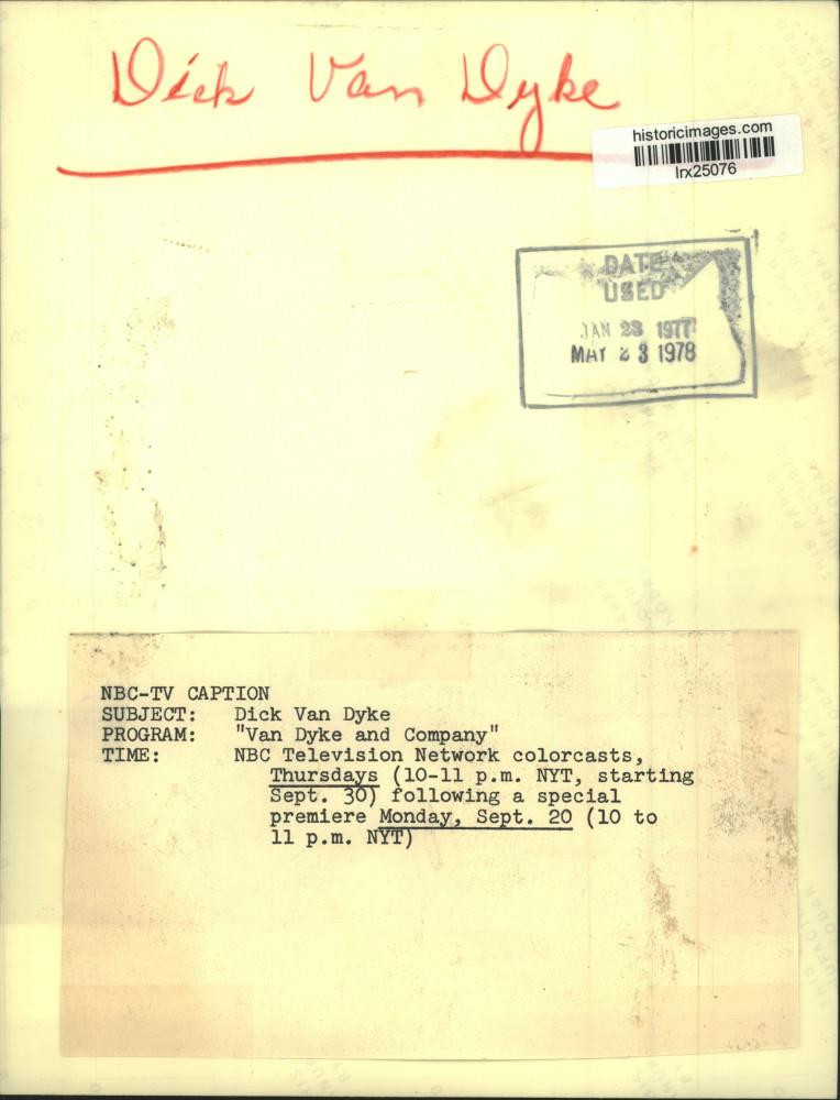ebay template Note: Please study the images carefully to determine the condition of this vintage photograph, as it may not be in perfect condition. It may contain wrinkles, cracks, and possibly even tears due to its age and how it was handled before it got to us. A scanner may interpret colors and contrast differently than human eyes will, so it is possible that the actual photograph may be slightly darker or lighter in person. This vintage photograph is offered for sale as a collectible item and conveys no transfer of copyright. 1977 Press Photo Dick Van Dyke Hosting The "Van Dyke And Company" Show This is an original press photo. Dick Van Dyke. "Van Dyke and Company" NBC Television Network colorcasts. Thursdays (10-11 p.m., NYT, starting Sept. 30) following a special premiere Monday, Sept. 20 (10 to 11 p.m. NYT).Photo measures 7 x 9.25inches. Photo is dated 01-23-1977. PHOTO FRONT PHOTO BACK Historic Images Part Number: lrx25076 FAQs Q: Can I just download a digital version instead? A: No, we sell only vintage originals and do not make or distribute any copies, including digital ones. Q: Do you combine shipping and invoices? A: Multiple photos won on the same seller ID combine automatically through the eBay checkout process. If you encounter problems with this, send us a message via eBay messaging and we will send you an invoice. Due to eBay limitations, we cannot combine items won on our different seller IDs for a single shipping charge. Q: How quickly do you ship the items once paid? A: We ship within one business day after your payment clears. If you do not receive an "order shipped" email from us by the close of the second business day from submitting payment, please e-mail us via eBay messaging. Q: How do you make sure my photograph arrives safely? A: We package each order between two cross-corrugated pieces of cardboard to ensure that the package is as difficult to bend as possible. We then wrap each order in a plastic sheet to help protect against moisture. We want you to rest assured that we take every precaution to ensure that the photograph you receive will be in the same condition in your care as it was in ours. Q: Will the "Historic Images" watermark be on my photo when I receive it? A: No. This is a digital watermark we use to protect our images. It is not printed on the photo. Q: What are your office hours? A: eBay for us is a business, and a very fun one to be in! We are open M-F 9 to 5 (CST). Therefore, we do not return e-mails and phone calls over the weekend. We observe the following holidays: New Years Day, Memorial Day, Fourth of July, Labor Day, Thanksgiving and the day after Thanksgiving, Christmas Eve and Christmas Day. Q: Where did all these vintage photos come from? A: These original vintage photographs are from various news service and newspaper photo archives from locations around the country including: Boston, Detroit, Tampa, Chicago, Denver, Seattle, New Orleans, Milwaukee, Portland, Spokane, and more. We do not copy or reproduce any photographs -- every item is a unique vintage piece that was housed in a news archive. Q: Can I use this photograph in my book/blog/website? A: The short answer is no. There is no transfer of copyright for republication or reproduction with these photographs when you purchase them, and only photographs taken before 1923 are currently automatically in the public domain. Permission from the copyright holder, which usually can be identified from the back of each photo, must be sought to republish or reproduce the image for any purpose. Q: Do you relist items (in case I miss an auction ending)? A: Auction items that receive no bids are relisted in our store (historicimages-store on eBay) as a fixed-price item and at a higher price than the starting auction price. Q: Do you leave feedback? A: Yes, we always leave feedback for buyers. Our software monitors when our buyers leave us feedback, then notifies us that we can leave feedback for the buyer. Rest assured, if you leave feedback, we will do the same! Check out our family of eBay IDs: historicimages01 Sports Photos historicimages02 Entertainment Photos historicimages03 Americana Photos historicimages04 International & War Photos historicimages05 Transportation Photos historicimages06 Photos of All Subjects historicimages07 Entertainment Photos historicimages08 Newsworthy Photos historicimages09 Entertainment Photos historicimages10 Sports Photos historicimages-store Our largest fixed-price selection historicimages-gallery Hand-picked photos Saturday night auctions About Us Historic Images was formed in September 2009, with a handful of scanners working out of a basement to digitize newspaper photo archives. We have since moved out of the basement, and we can now archive thousands of photos per day. Our company has worked with magazines and newspapers from Detroit, Boston, Denver, Seattle, Tampa, Chicago, and New Orleans, just to name a few. We are constantly adding to our inventory, and have assembled an archive of millions of photos to date. As our company evolved, we began our eBay business, which brings thousands of fresh auctions per week to the world's largest online auction marketplace. Our custom software systems and team of great employees allow us to efficiently scan and sell large photo archives online. At the very core of our company's DNA is a strong commitment to customer satisfaction and strict integrity for our product. Our promise to you is that we will do everything in our power to provide you a great buying experience. Copyright 2009 - Present, Historic Images, Inc. Sell Smarter with Kyozou. Inventory and Ecommerce Management