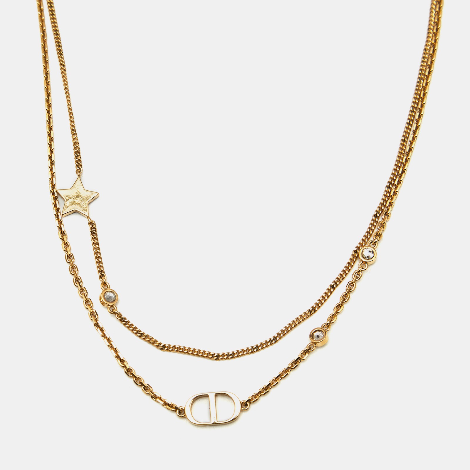 Delicate and refined, this Dior Petit CD necklace features two slender gold tone chains accented with sparkling crystals and the signature CD charm. A layering essential with timeless Parisian allure.Certified by The Luxury Closet - This item has gone through a detailed authentication process overseen by our experts. We offer a lifetime guarantee of authenticity on all our items. Import duties, taxes and charges are not included in the item price. These charges are the buyers responsibility. Please check with your country’s customs office to determine what these additional cost will be prior to buying. Our eBay Store About Us Contact Us Add to Favorite Sellers Dior Petit CD Crystals Gold Tone Double Strand Necklace $523.6 Delicate and refined, this Dior Petit CD necklace features two slender gold tone chains accented with sparkling crystals and the signature CD charm. A layering essential with timeless Parisian allure. Product Details Brand Color Gold Dimensions Material Crystals Size Outsole Width Outsole Length Heel Height Includes Certified by The Luxury Closet This item has gone through a detailed authentication process overseen by our experts. We offer a lifetime guarantee of authenticity on all our items. How We Check The in-house team of experts at The Luxury Closet is highly trained to verify the authenticity and the condition of the luxury products. They ensure that only 100% authentic items are put on sale.The evaluation process is unique with its own mix of assessment criteria and differs according to the category. Each item is evaluated based on the following combination of hallmarks, hardware, stitching, symmetry, material, craftsmanship, stamping, codes, hologram stickers, and packaging. Our authenticators also check if the items have been modified or amended (e.g., aftermarket diamonds, replaced batteries, repaired bags, etc.) International Buyers Import duties, taxes and charges are not included in the item price. These charges are the buyers responsibility. Please check with your country’s customs office to determine what these additional cost will be prior to buying.