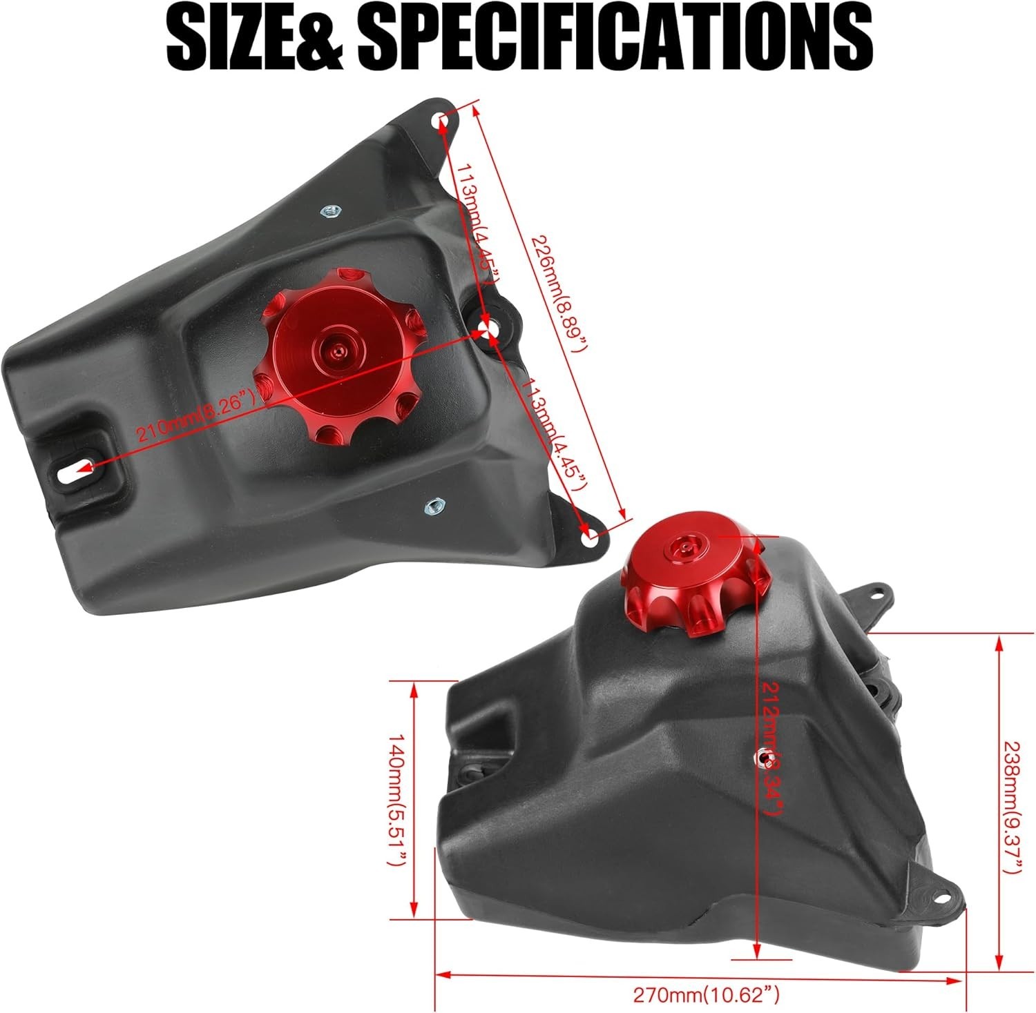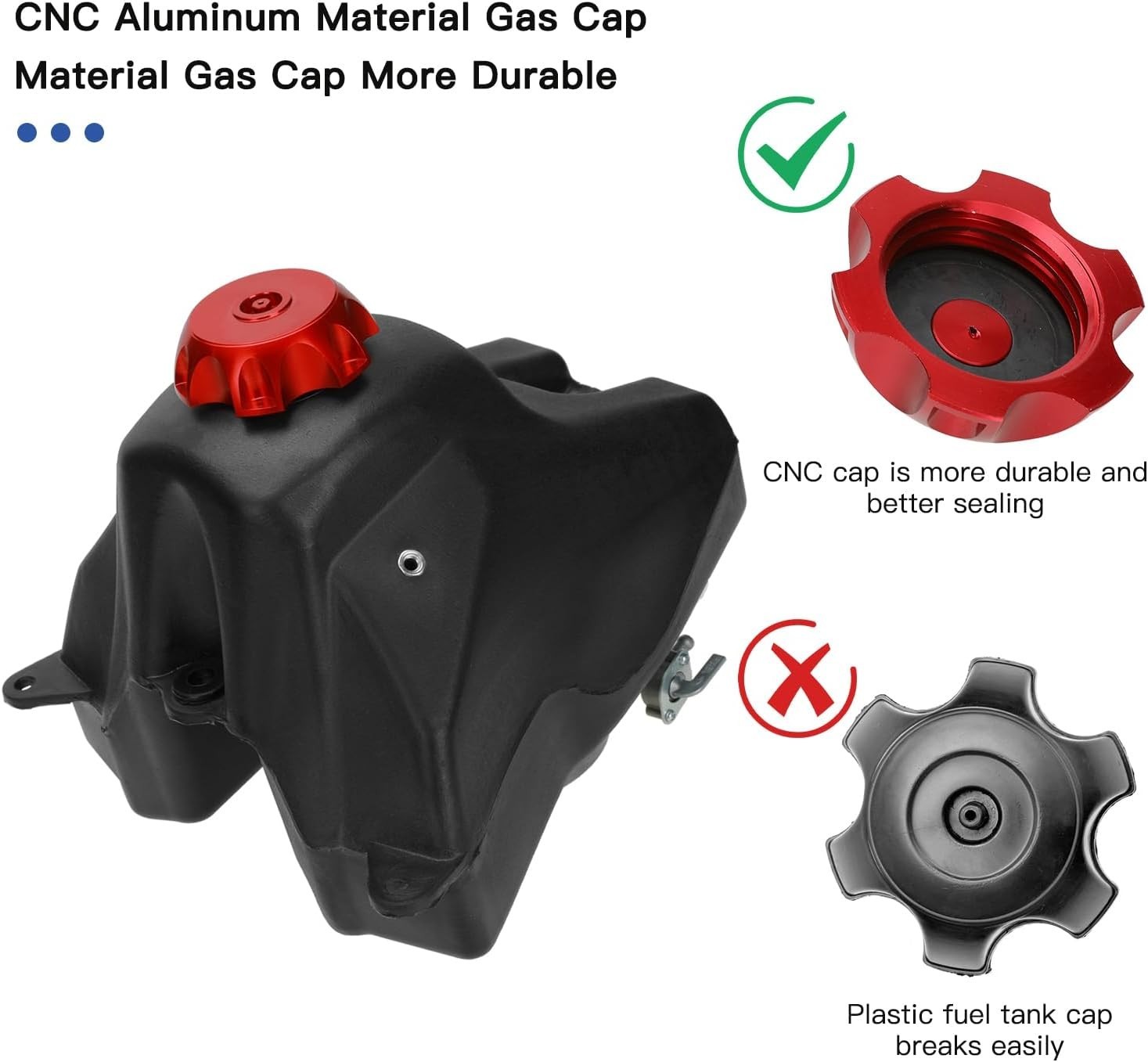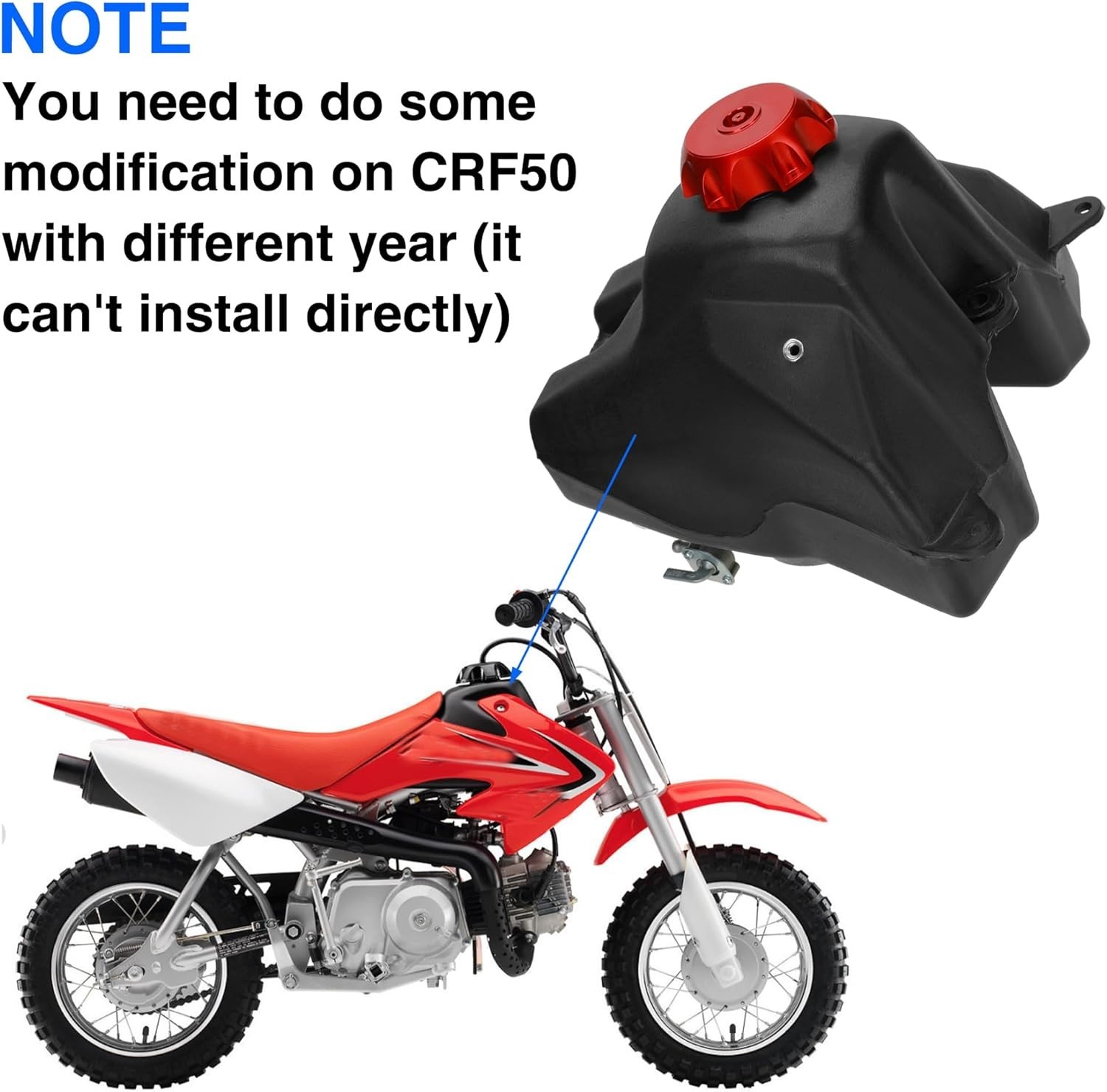 Dirt Bike Gas Fuel Tank for CRF50 XR50 SSR125 110cc 125cc 50cc 70cc Pit Dirt Bik Fitment: Pit bike gas tank for CRF50 XR50 CRF50F (not fit other modle) SSR 125cc 50cc 70cc 110cc Apollo TaoTao Baja Coolster RFZ Pitster Pro Kayo Sdg dirt pit bike and many other Chinese brands Compatibility: CRF50 XR50 CRF50F dirt bike, SSR125 SSR70 SSR50 SSR110 dirt bike, Baja DR49, 2014 Pitster Pro 90ss, Chinese 110cc dirt bike, Kayo 125, 70cc Pitster Pro pit bike, TaoTao 110, Coolster 70cc Coolster 125, Taotao ATD90A Durable Material: Made of CNC aluminum gas tank cap, more durable than plastic one. High strength ABS plastic, which is good sealing and hard to break down Attention: The capacity of this dirt bike fuel tank is 3.5L (0.92 gallon). Please match the size and fitment before purchasing Package List: 1 * Dirt Bike Gas Tank, 1 * CNC Gas Tank Cap (with Fuel Breath Tube), 1 * Fuel Filte*, 1* Fuel Pump Petcock
