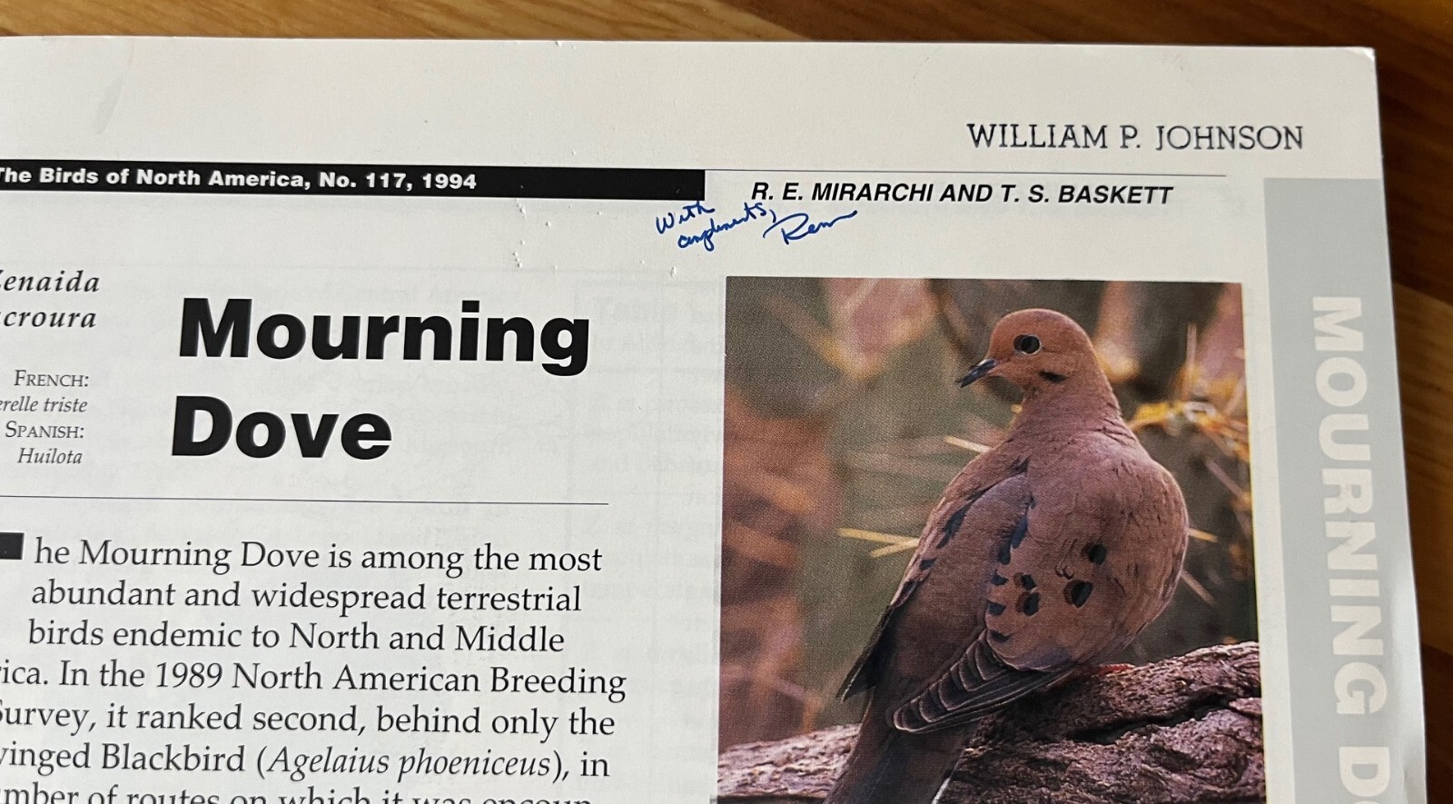 4 dove publications: The condition of each document varies. Read full descriptions below. 1. "Mourning Dove, Zenaida macroura," 1994. The Birds of North America, No. 117, by R.E. Mirarchi and T.S. Baskett. published by The Academy of Natural Sciences & The American Ornithologists' Union. Paperback, Staple Bound, 32 pages. Signed by one of the authors (Mirarchi) "with compliments" Nice condition. The document has a name stamp on the top right. Slight bend to the back cover on the lower left. The front and back cover have some rubbing due to storage against other documents. Signed by one of the authors. SEE PICTURES. 2. "Migration, harvest, and population dynamics of White-winged Doves banded in Texas and northeastern Mexico, 1950-1978." printed in 2000. by R.R. George and others, published by Texas Parks and Wildlife Department. Trade Paperback, Staple Bound 49 pages. There are a few marks on the back cover. Otherwise, excellent condition. SEE PICTURES 3. "Mourning doves in Texas: life history, habitat needs, and management suggestions." printed in 1988, by R.R. George, published by Texas Parks and Wildlife Department. Paperback, 18 pages. Excellent condition. SEE PICTURES 4. "Mourning doves in Texas: life history, habitat needs, and management suggestions." printed in 2004, by R.R. George, published by Texas Parks and Wildlife Department. Paperback, 18 pages. Good condition. Slight printer defect, in that the front cover doesn't exactly light up with the pages (it's about a mm off on the bottom). SEE PICTURES.