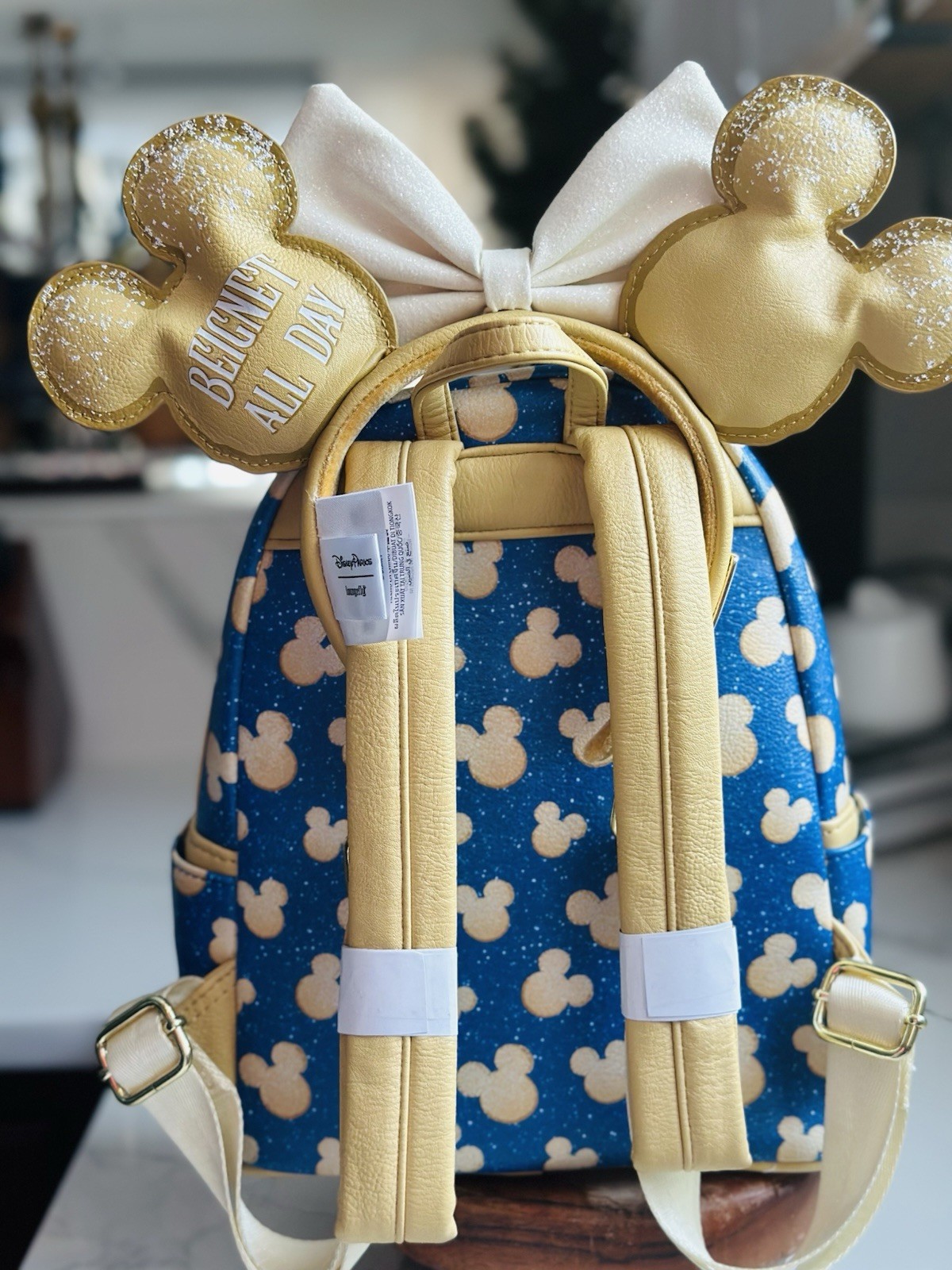 Carry a piece of Port Orleans with the Disney Parks Loungefly Mini Backpack. Featuring the 'Beignet All Day' design, it's perfect for fans of the resort's French Quarter. Simulated leather mini backpack Zip front pocket with large beignet, reads 'Beignet All Day' Zip front compartment Scented Front compartment includes slip pocket with straps and snap fasteners to attach coordinating Beignet Loungefly Ear Headband for Adults, sold separately Zip main compartment with double zip pull Side slip pockets Goldtone hardware Lining features allover beignet print Adjustable shoulder straps Top carry loop Cloisonné Disney Parks | Loungefly logo plate on front Inspired by the Port Orleans French Quarter Resort Polyurethane 10 1/2'' H x 9 1/2'' W x 7'' D Imported Part of the Disney | Loungefly Collection