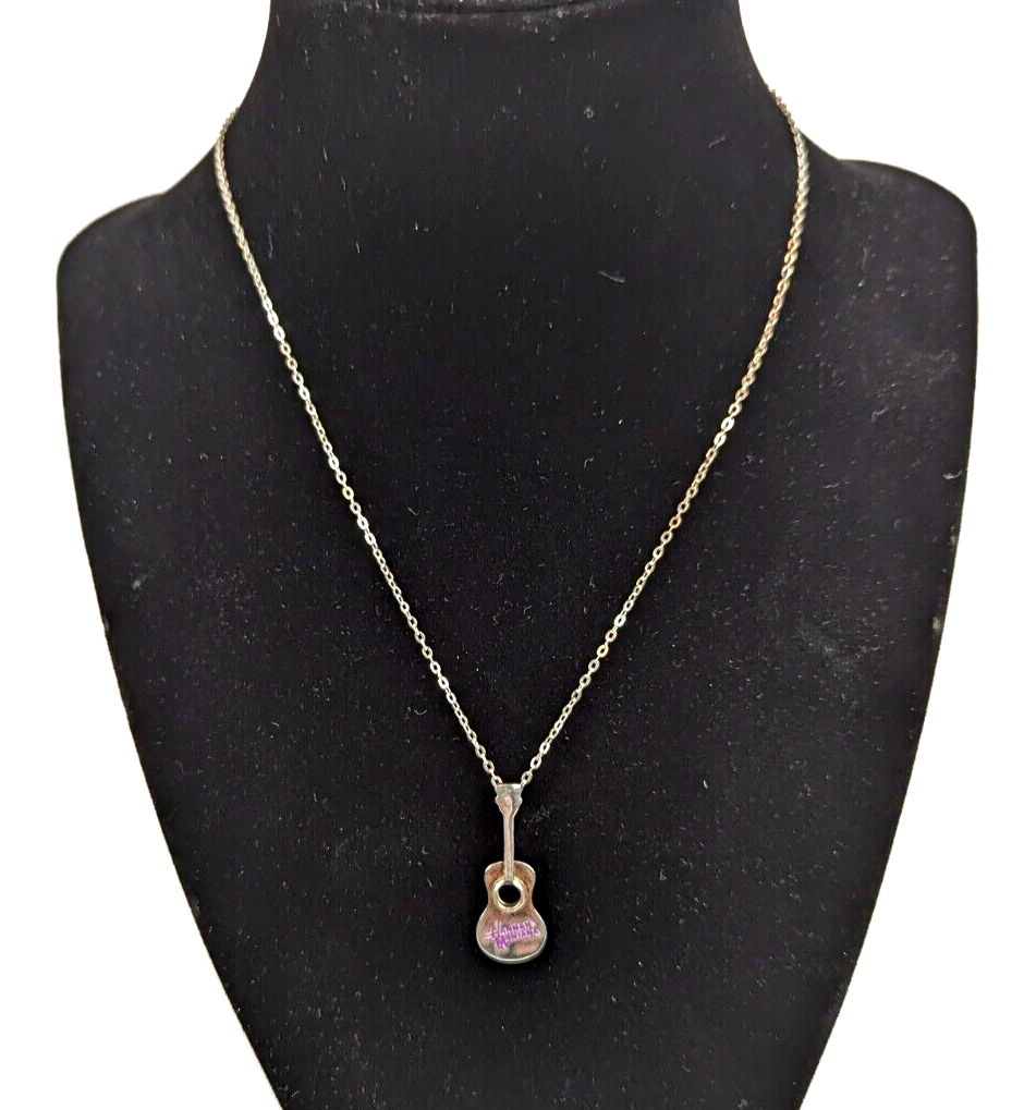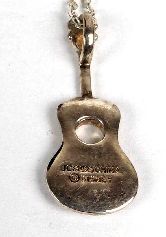 Vintage Disney Sterling Silver Hannah Montana Guitar Charm Pendant Necklace. Guitar pendant is a little over 1" long with Hannah Montana in Purple, and is marked for JCM 925 Disney on the back. It hangs from the original 18" Sterling Silver chain that closes with a lobster claw clasp with the Disney Sterling Hang Tag. 4277