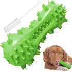 Dog Squeaky Chew Toy Specifications: •1. Size: 7.1*3.1*3.1in / 180 x 78.7 x 78.7 mm. •2. Weight: 5.6oz / 160g •3.Color: Yellow, Turquoise, Green •4. Material: Natural Rubber Note: •1. Please clean the toy regularly. •2. You'd better put some food kibble that your dogs like on it to attract them. •3. This Rubber Chew Toy is lightweight and soft different as the heavy tough Nylon Chew Toy. Dog IQ Training Toy This dog toy keeps your dog playing all day without getting bored, making them more lively and lovely. LIFEIN helps provide mental and physical stimulation. Squeaky Dog Toys The both ends are equipped with a sound devices, it can make a squeak to attract the dog's attention when your dog is biting or playing with it, thereby increasing the dog's more interest in playing. Tooth Cleaning Toy This LIFEIN dog toys can be used as a dog tooth cleaning brush. Squeezing toothpaste on toys can effectively help dogs clean their teeth, reduce their mouth odor and help dogs grow up positively and happily. Soft Durable Rubber Material • Rubber Chew Toy is designed for dog teeth cleaning, it's lightweight soft but durable and safe for dogs gums. • So it's different from the Nylon Chew Toy, which it's heavier, tough and hard as bone, good on heavy duty chewing but risk on gums hurting. Safe Insipidness Material • This dog chew toy is insipidness for absolutely safe chewing. • So you'd better put some food kibble that your dogs like on it to attract them to chew, like toothpaste, peanut butter, mashed potatoes , pumpkin puree, etc. Easy to Clean •You can easily wash it by hand with the attached brush. For the durable surface, you don't need to worry about damaging this toy due to repeated cleaning.