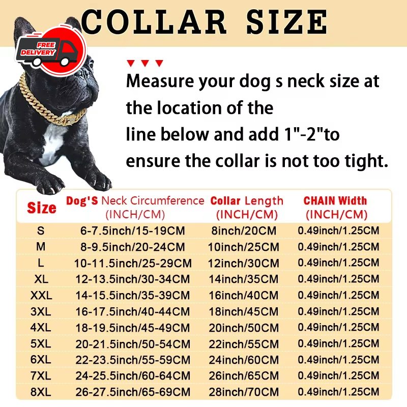 Dog Chain Diamond Cuban Collar Walking Metal Chain Collar with Design Secure Buckle, Pet Cat Cuban Collar Jewelry Accessories Production information: Material: copper alloy, with zirconia diamond Color:Gold/Silver/Rosegold/Blue/Purple/Pink Style1:12.5mm wide Style2:15mm wide Length: 20cm(50g),25cm(55g),30cm(60g), 35cm(70g), 40cm(80g),45cm(85g), 50cm(90g), 55cm(100g), 60cm(110g), 65cm(120g), 70cm(130g) (Due to measurement error, the weight is for reference only, the specific weight is based on the real thing.) Suitable:for Small,Medium,Large Dogs,Cats Package Included: 1 * Dog&Cat diamond necklace Notes: 1. Diamond necklaces are decorative and should not be pulled. 2.Please allow 0-2cm error due to manual measurement. Thanks for your understanding. 3. Monitors are not calibrated same, item color displayed in photos may be showing slightly different from real object. 4.We support large quantities of orders and provide customized services ,the more purchase the more preferential prices. Style1:12.5mm wide