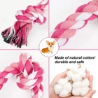 SAFETY MATERIAL -This puppy rope toy is made of natural cotton, safety and sturdy, allowing your pet enjoy chewing and playing IDEAL FOR MEDIUM DOGS, SMALL DOGS AND CATS- Our durable dog toys has 3 knots and 14inches long, designed for small size pets, not for large and extra large dogs RELIEVE ANXIETY &PROTECT FURNITURE - Dogs love to chew on things, they will reduce anxiety by chewing. Now you can give them their own rope chew toy instead of your shoes, sofa and furnitures TEETH CLEANING - Natural material cotton fiber of this tug toy for dogs can gently and deeply clean between the dog's teeth, prevent the accumulation of plaque, achieve the effect of massaging the gums, and keep your dog's teeth healthy TUG OF WAR DOG TOYS - If your pet likes to tug of war, we recommend you try this dog rope toy. Vast majority of dogs enjoy tug of war, which keeps them healthy and happy Product Description Specifications: Material: Natural Cotton Color: Pink Length: 14inches Package content: 1PC 3 Knots Chew Rope Toy