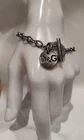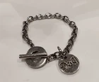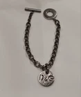 This is a Dolce & Gabbana D&G Vintage Dog Tag Coin Disc Stainless Steel T-Bar Bracelet. The bracelet features a toggle closure and is made of stainless steel. It has a length of 19.2 cm, making it a stylish and trendy accessory for any outfit.