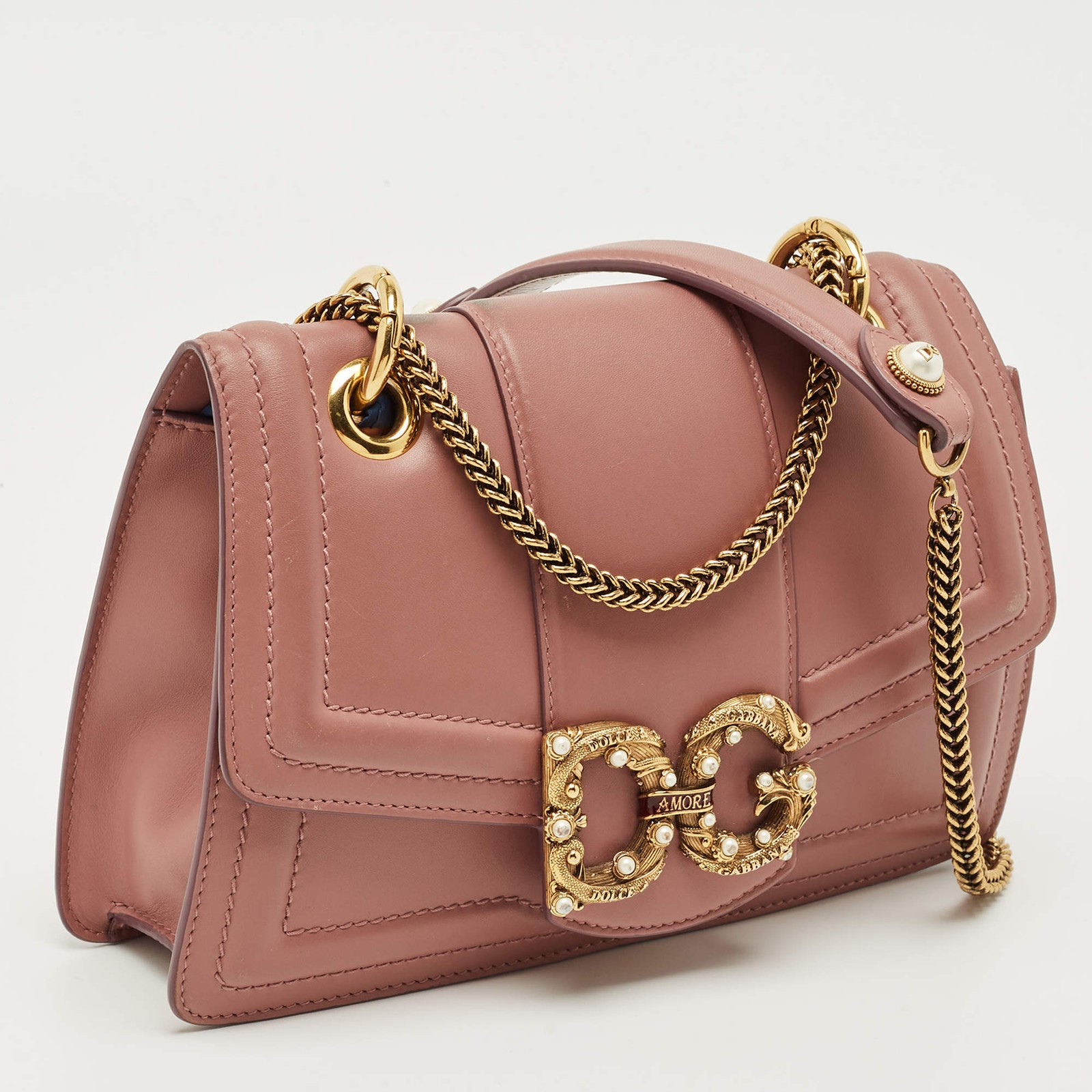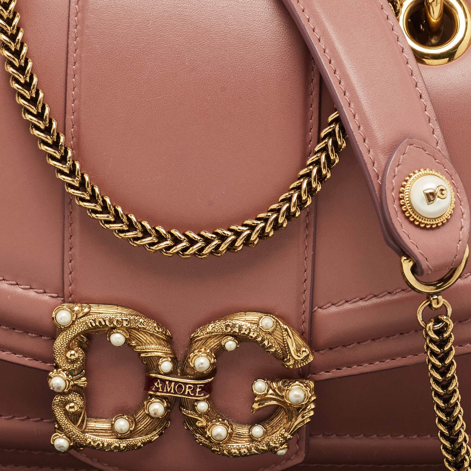 Our eBay Store About Us Contact Us Add to Favorite Sellers Dolce Gabbana Pastel Pink Leather DG Amore Chain Shoulder Bag Romantic and compact, this soft pink leather shoulder bag from Dolce & Gabbana is finished with a gold-tone DG emblem and delicate chain strap. Product Details Brand Dolce & Gabbana Includes The Luxury Closet Packaging Certified by The Luxury Closet This item has gone through a detailed authentication process overseen by our experts. We offer a lifetime guarantee of authenticity on all our items. How We Check The in-house team of experts at The Luxury Closet is highly trained to verify the authenticity and the condition of the luxury products. They ensure that only 100% authentic items are put on sale.The evaluation process is unique with its own mix of assessment criteria and differs according to the category. Each item is evaluated based on the following combination of hallmarks, hardware, stitching, symmetry, material, craftsmanship, stamping, codes, hologram stickers, and packaging. Our authenticators also check if the items have been modified or amended (e.g., aftermarket diamonds, replaced batteries, repaired bags, etc.) Please note that this handbag may have a perfume scent, as it was stored and packaged in Dubai where such fragrances are commonly used. International Buyers Import duties, taxes and charges are not included in the item price. These charges are the buyers responsibility. Please check with your country’s customs office to determine what these additional cost will be prior to buying.
