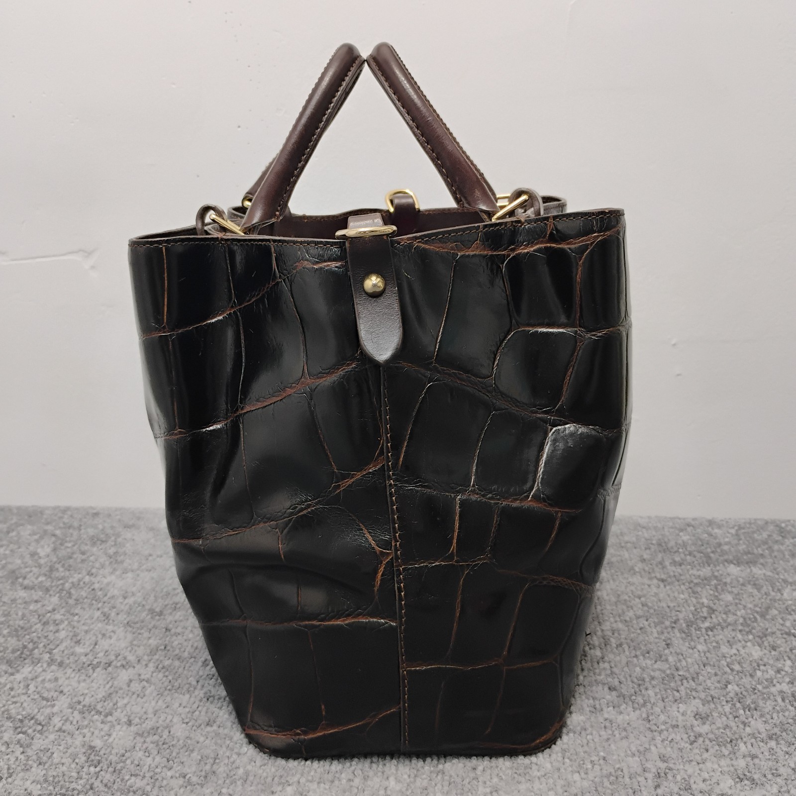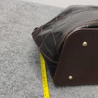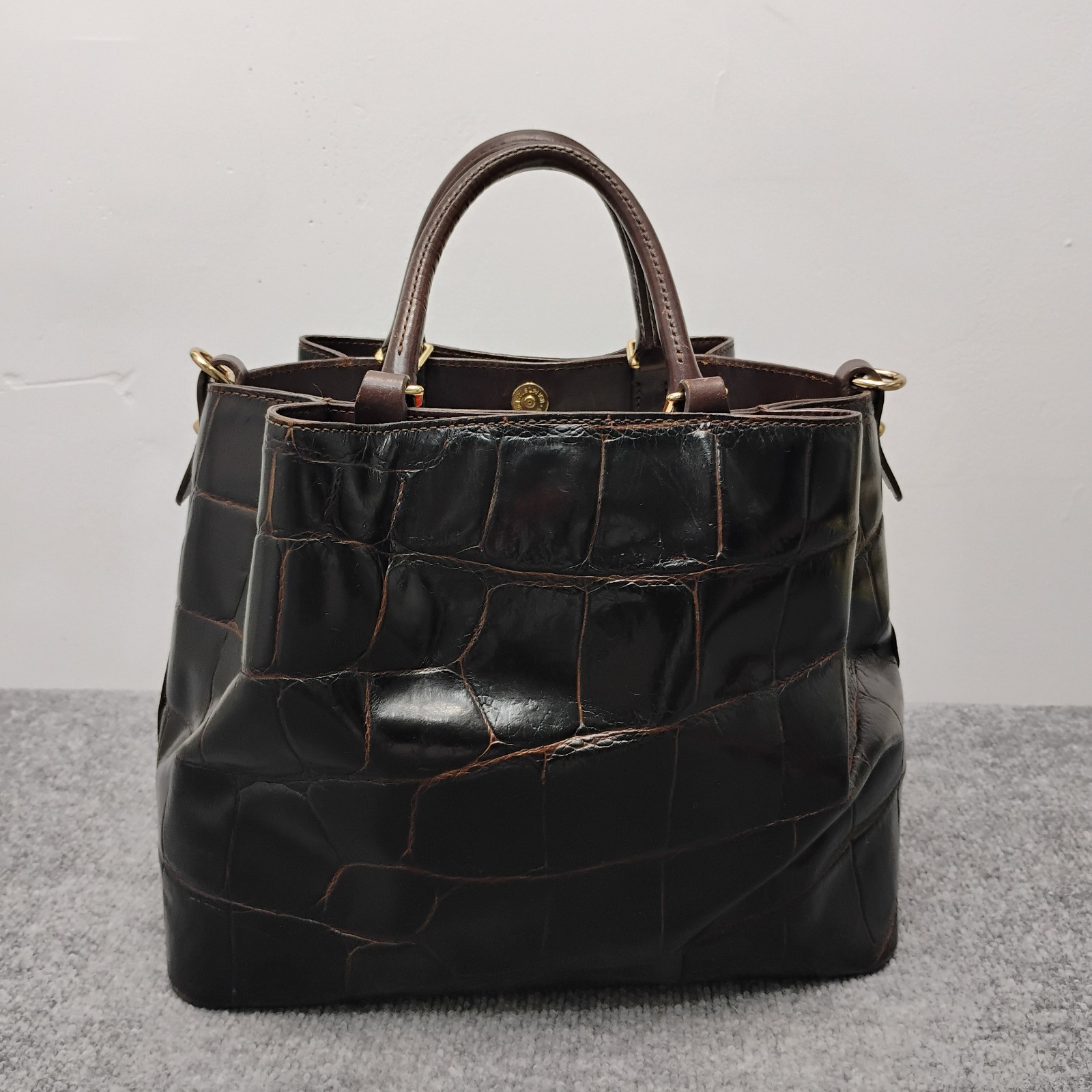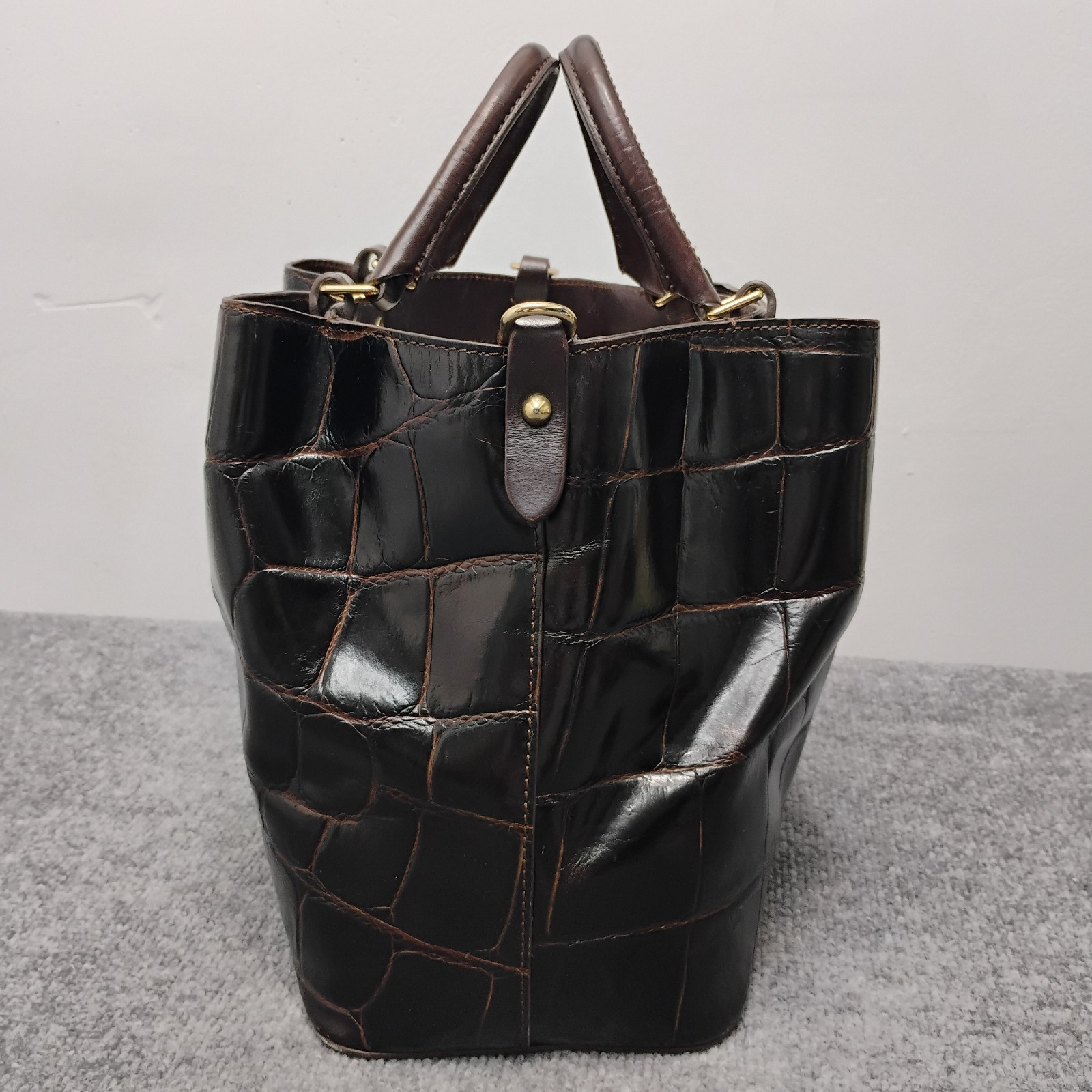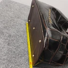 The Dooney & Bourke Chocolate Brown Crocodile Brenna Large Tote Bag Purse is a stylish and spacious handbag crafted from leather with a crocodile embossed exterior. Featuring a magnetic closure and a detachable strap, this satchel/top handle bag is designed for functionality and versatility. The rich chocolate brown color and red lining add a touch of sophistication, making it a perfect accessory for any outfit. With bottom studs and inner pockets, this tote bag is both practical and fashionable, ideal for women on the go.