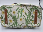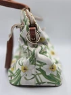 The Dooney & Bourke Floral Women's Satchel is a stylish and versatile accessory for casual occasions. This rectangular shaped bag features a beautiful floral pattern with a dahlia character, accented with gold hardware. The satchel has a zip closure, double brown leather handles, and a detachable strap for added convenience. Made of leather with a white, green, and yellow exterior, this designer bag is lined and exudes a sophisticated and feminine vibe. Perfect for any woman looking to add a touch of elegance to her outfit.
