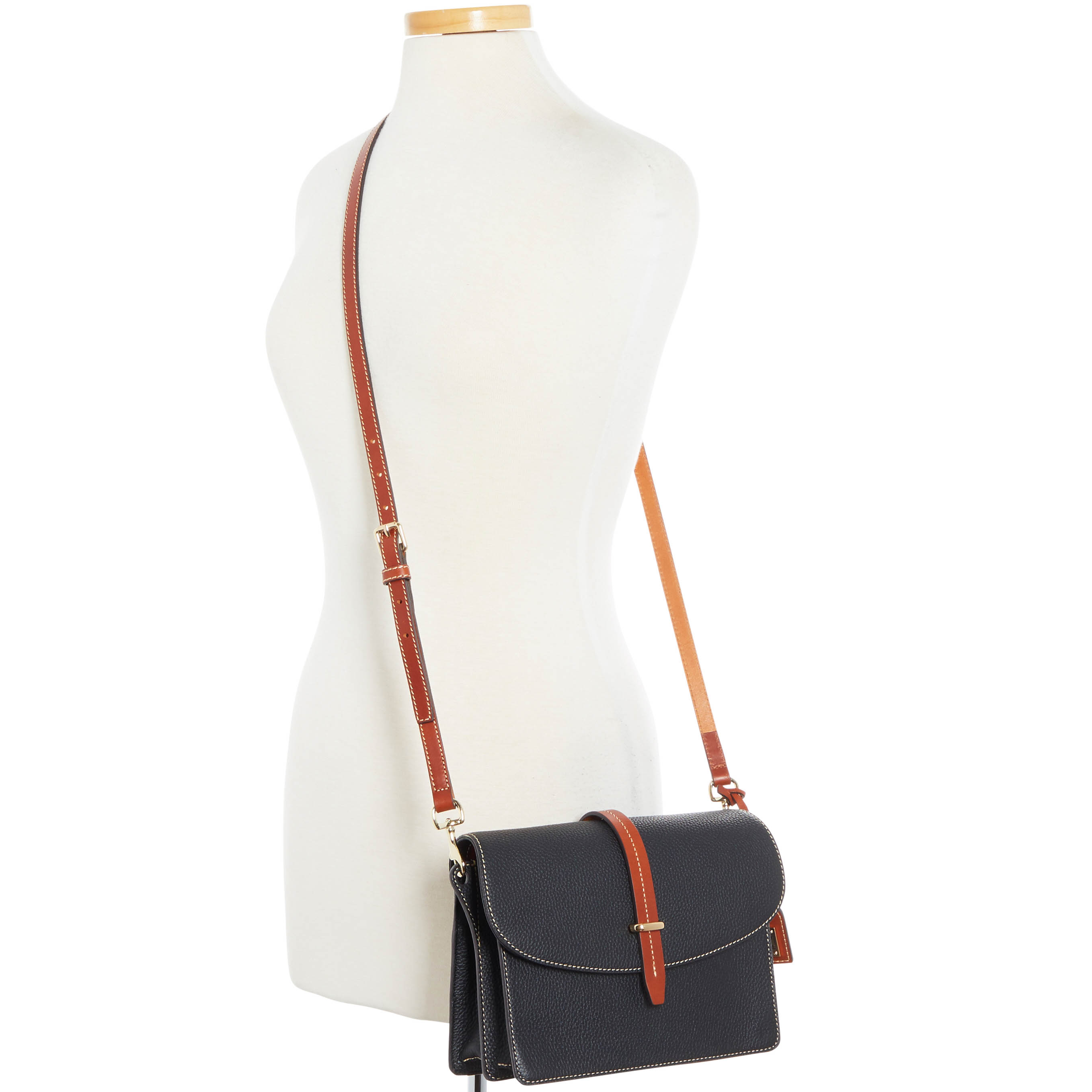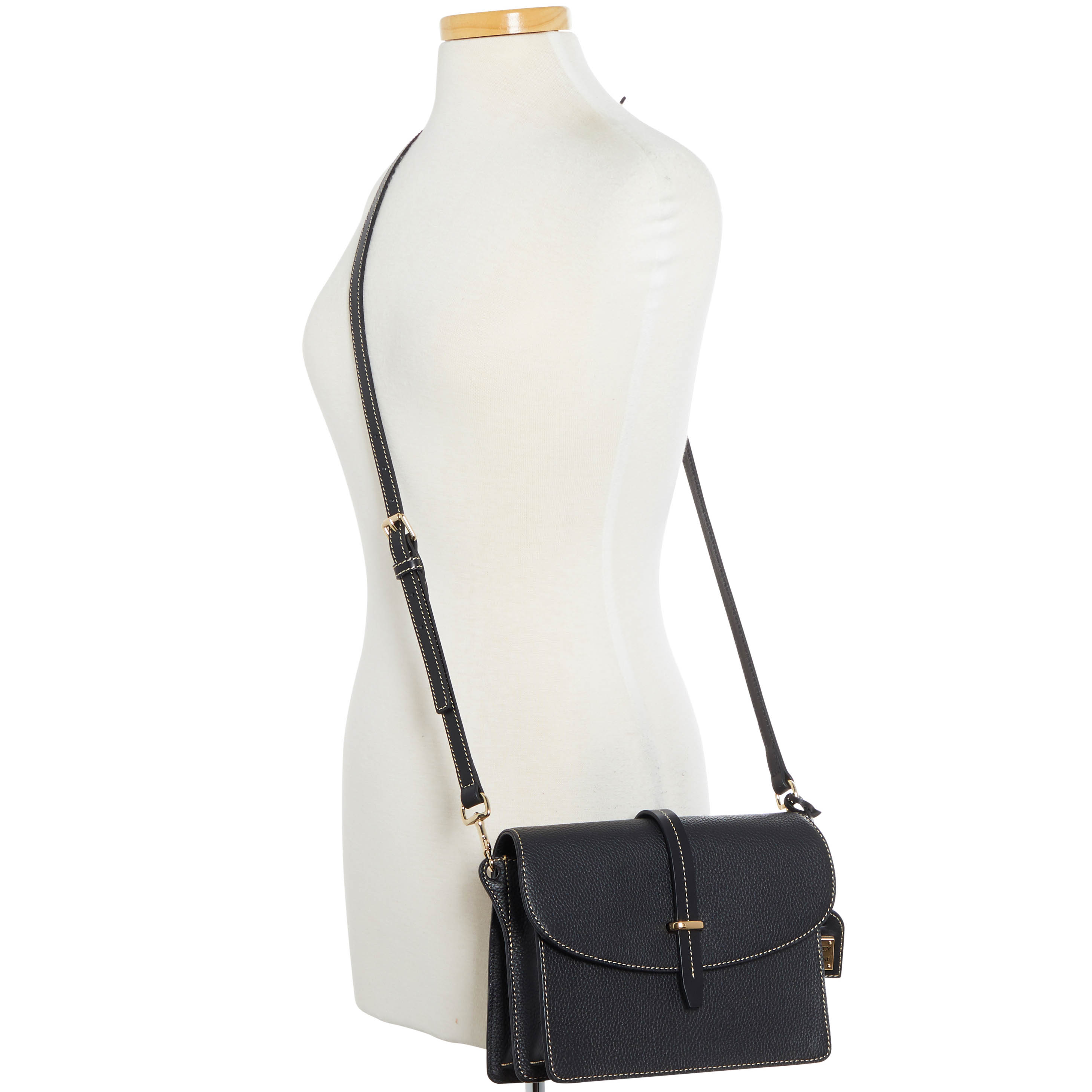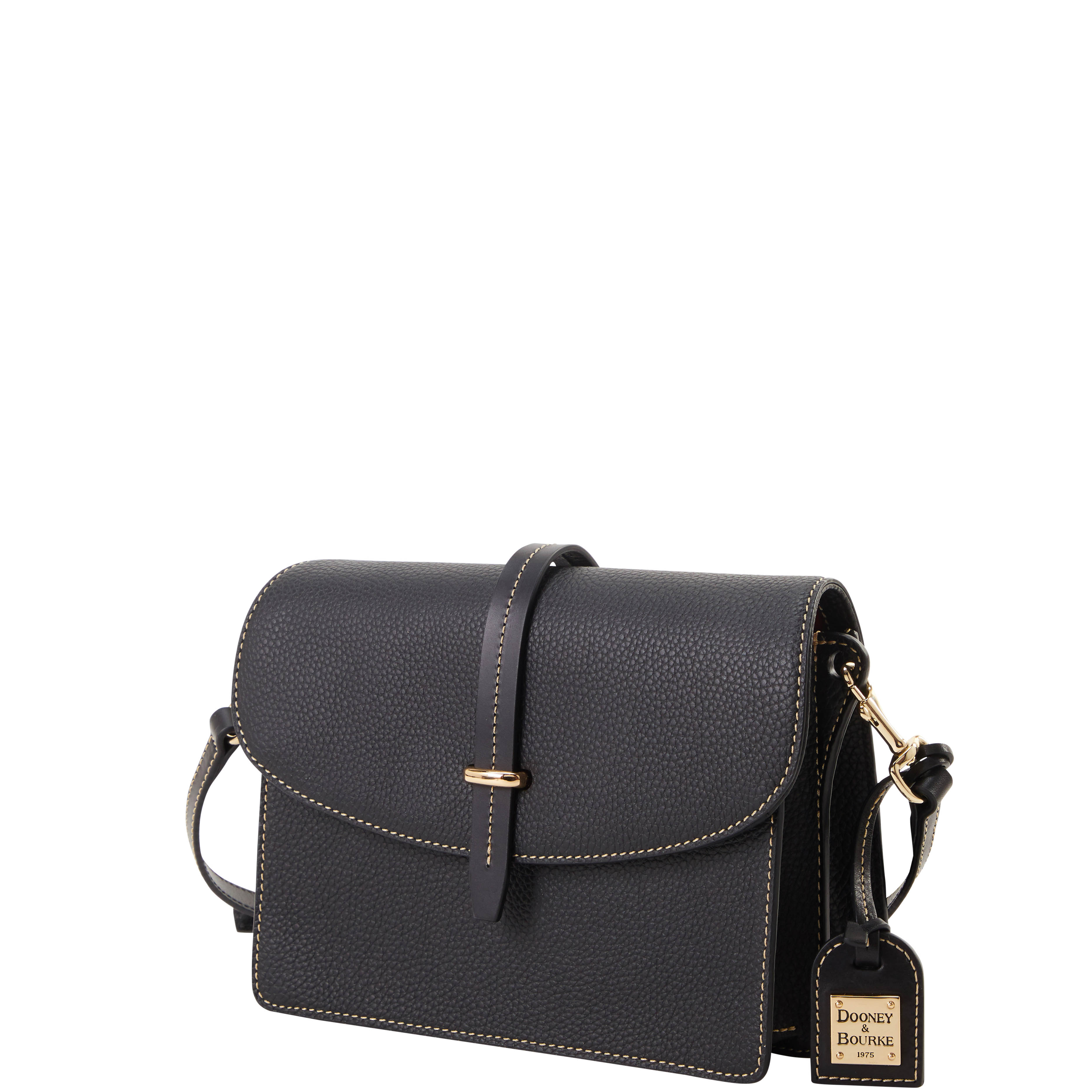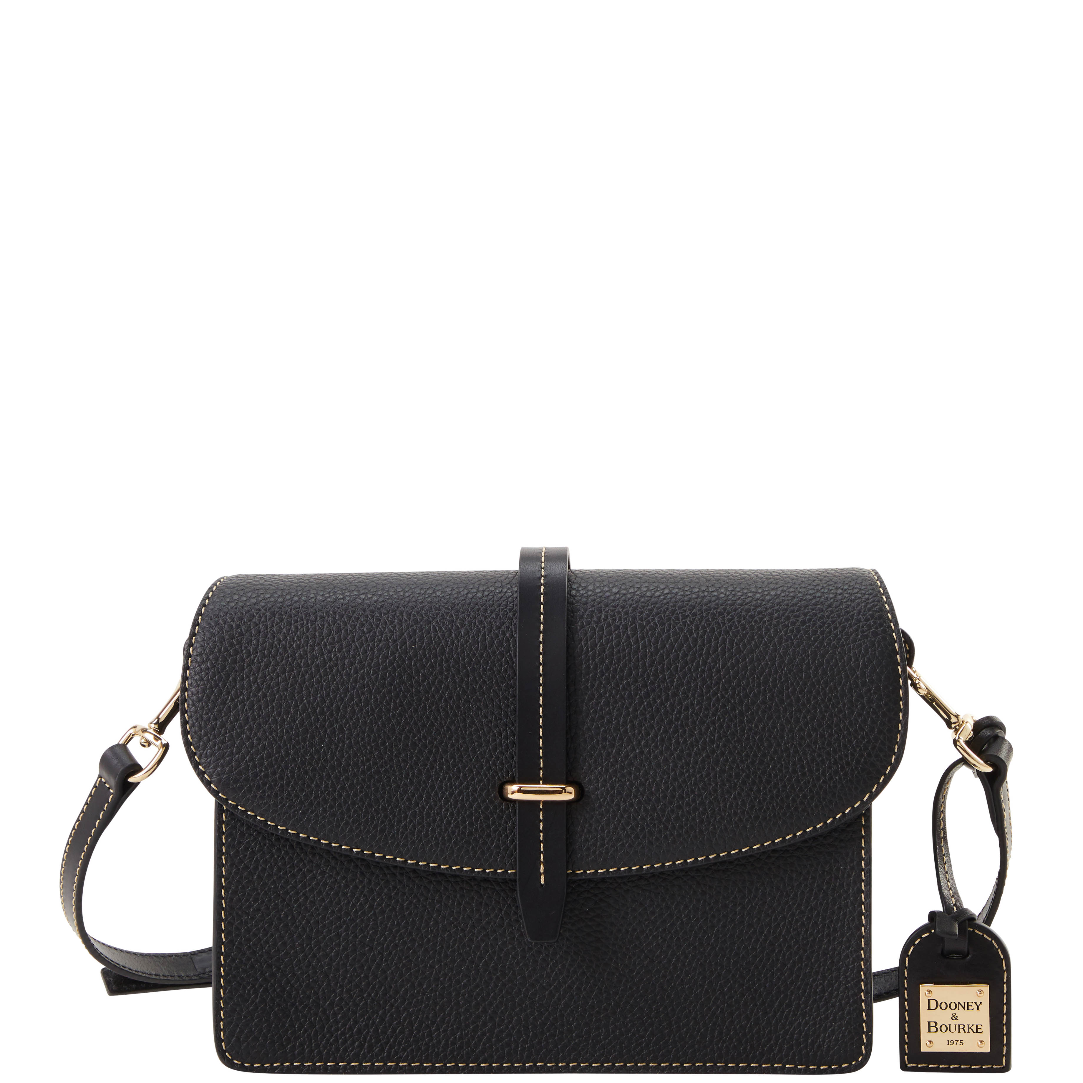 Dooney & Bourke Pebble Grain Flap Crossbody | Black Black. One inside zip pocket. One inside pocket. One zip center compartment. Inside key hook. Strap drop length 25.75". Lined. Flap with buckle closure. Dooney & Bourke Pebble Grain Flap Crossbody | Black Black