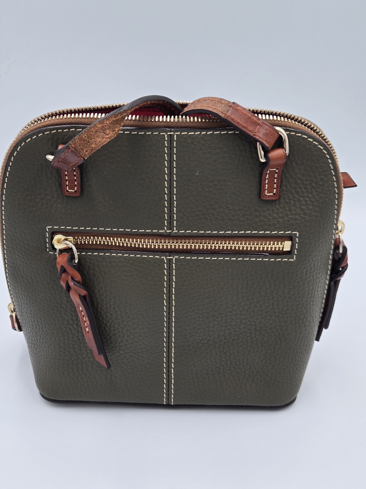 The Dooney & Bourke Pebbled Grain Leather Trixie Crossbody Olive Sexy Bag is a stylish and versatile accessory for women. Made of pebbled leather in a beautiful olive green color, this medium-sized bag features a unique 2-way zipper closure and a gold-plated hardware accents. The crossbody style with a British Tan leather strap offers convenience and comfort for everyday wear. With inner and outer pockets, adjustable strap, and a key clip, this bag is perfect for travel, parties, casual outings, formal events, and workwear. A practical and fashionable addition to any wardrobe, this bag adds a touch of sophistication to any outfit.