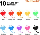 10 AMAZING FUN COLORS: This dot markers set contains 10 vibrant colors: red, orange-red, orange, yellow, green, sky blue, blue, purple, magenta, and black. The wide range of colors allows kids to unleash their creativity and imagination while drawing WASH UP EASILY: If your child accidentally gets ink on their hands or clothes, don't worry! Cleaning up is a breeze. Simply rinse with water and gently rub if needed. For stubborn stains, use hand soap or detergent for a thorough clean NON-TOXIC & ACID-FREE: These dot marker pens are completely safe for kids. We use non-toxic, acid-free ink that is gentle on the skin. The dot markers' materials conform to ASTM-D4236 standards FIT FOR SMALL FINGERS: Featuring 0.42 oz bottles, Shuttle Art dot markers are lightweight and easy for toddlers to grip. Designed to fit small hands, these markers are effortless for kids to hold, mix, and blend colors to create their masterpieces SERVICE GUARANTEE: Your satisfaction is our top priority, please rest assured to purchase our products. If you are not satisfied with our products or have any questions, please feel free to contact us at any time Product Description 1 MARKERS 2 PEN 3 PENCILS 4 PAINT 5 SCHOOL & OFFICE EASY GRIP & VIBRANT COLORS Easy to Hold Perfect for little hands to comfortably grip and create. 10 Vibrant Colors Unleash kids' creativity with our dot markers, which are mess-free and feature washable ink. CREATIVE DOTTING & GAMES Innovative Dotting Creating unique and mesmerizing patterns with every dot. Game Play Ideal for engaging bingo games and endless fun. Dot markers Comparison Add to Cart Add to Cart Add to Cart Add to Cart Add to Cart Add to Cart Customer Reviews 4.5 out of 5 stars 1,804 4.2 out of 5 stars 1,035 4.0 out of 5 stars 53 4.5 out of 5 stars 1,341 4.5 out of 5 stars 2,217 4.5 out of 5 stars 1,804 Price $9.99 $ 9 . 99 $12.99 $ 12 . 99 $14.99 $ 14 . 99 $13.99 $ 13 . 99 $15.99 $ 15 . 99 $21.99 $ 21 . 99 Accessories 135 Unique Patterns PDF 135 Unique Patterns PDF None 20 Patterns Activity Book 20 Patterns Activity Book 20 Patterns Activity Book Washable ✔ ✔ ✔ ✔ ✔ ✔ Non-toxic & Acid-free ✔ ✔ ✔ ✔ ✔ ✔ Volume 0.42 oz/12 ml 0.42 oz/12 ml 0.42 oz/12 ml 1.33oz/40 ml 1.33oz/40 ml 1.33oz/40 ml Colors 10 Colors 15 Colors 15 Glitter Colors 14 Colors 12 Colors 14 Colors