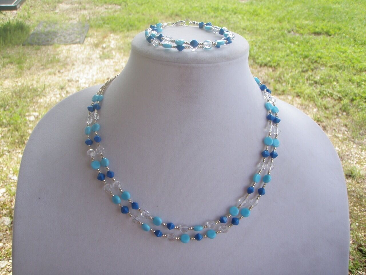 Handmade beaded necklace and bracelet set Necklace is 18.75/19.5" long; bracelet is 8.25" long Czech glass beads in opaque blue, opaque light turquoise, and crystal clear - all three in different shapes Spacers are silver metallic Czech glass seed beads; has silver tone lobster claw clasps on each piece