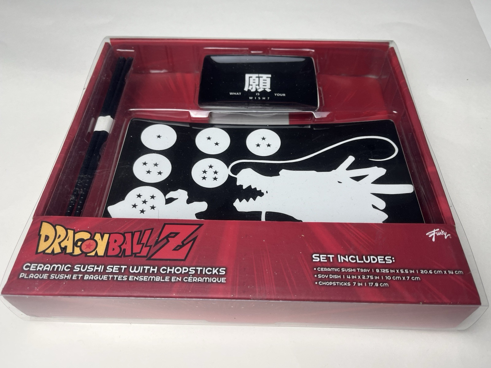 Please see pictures for measurements and details of any flaws. Contact us with any questions or concerns New Never Used Open Box Dragon Ball Z Dragon Ball Z Ceramic Sushi Set W/Chopsticks Dish Tray Black No Return Policy Thank You For Your Support