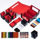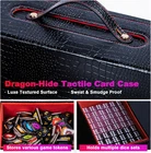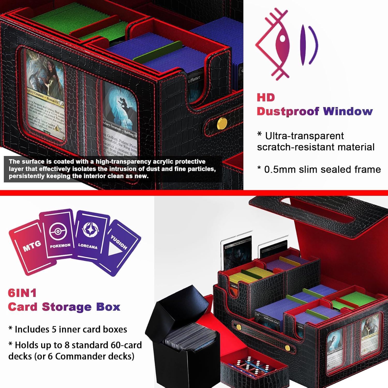 6-in-1 Design: This card storage case contains 4 deck boxes with commander display windows, 1 dedicated 100+ card box and 1 high-capacity dice tray, 12pcs Color Dividers, 4 card holder. Compatible with sleeved cards, toploaders, and 35PT magnetic card holders, optimized for competitive gauntlet play formats including EDH and Standard. Practical and Portable Design: The outer storage case integrates a carrying handle and dual transparent viewing windows for water and dust resistance. Both side compartments feature dedicated commander slots for instant identification. The 8-point magnetic sealing system ensures full closure protection, eliminating accidental openings and providing a reliable safety barrier for your valuable cards. High Capacity: This deck box holds 6×100+ double-sleeved cards, 6×140+ single-sleeved cards, or 6×240+ unsleeved cards (compatible with MTG/PTCG/Yu-Gi-Oh!). Verified to store 6×100 Dragon Shield double-sleeved cards. Unifies all your cards, 35PT magnetic holders, dice, tokens, and counters in one Trading Cards box Dragon Scale Textured Design: Provides a unique visual identity to this card storage box. It creates dynamic shadow effects under light refraction, complemented by a refined tactile feedback that enhances its premium quality. The surface features anti-slip and anti-fingerprint treatment, along with water and scratch resistance. Inside, the ultra-soft microfiber lining gently cradles each card, effectively preventing scratches and wear. Reinforced with high-density double-stitched sewing at key stress points, it significantly improves overall durability. Elevate Your Game: Whether you play MTG, Lorcana, other TCGs, or collect sports cards, our deck box is the ultimate choice for safeguarding your valuable collection. Its premium design features an exclusive dragon-scale texture, blending elegance with functionality—keeping your cards perfectly organized and easily accessible during tournaments. Stand out at competitive events and game nights while showcasing your expertise and style. Experience the satisfying magnetic "click" and luxurious appearance that catches eyes and sparks admiration—finally, storage worthy of your rarest cards! Product description