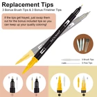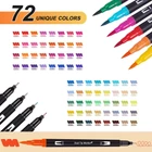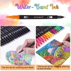 DUAL TIP MARKER DESIGN: The 0.4mm fine tip is suitable for drawing relatively thin lines, you can use it for writing records and some designed line drafts; 1-2mm brush tip works well for coloring books, signing, design, art project and hand lettering.The design of the dual tip makes your drawing process more convenient and easy 72 UNIQUE COLORS: This complete set of dual brush tip pen art markers comes with a whopping 72 unique and vibrant color options to choose from, NO duplicate. Fully meet the painting needs of beginners, rich and vivid colors arouse your artistic creativity QUALITY INK: Odorless and harmless, water-based ink, easy to wash on clothes and skin. All brushes and fineliner work well with no skipping or ink flow issue. Please put on pen caps timely after every use to avoid the tips drying completely GREAT PRESENT: Our colored markers is an ideal art set present for family, friends and all skill level children in Birthdays, Thanksgiving, Christmas etc. Perfects for adult coloring books, sketch, illustrations, drawing, planner, journal, notebook, calendar, signing, manga, animation, graphic, design, art project and more PACKING LIST: 1 x Portable Case, 72 x Coloring Markers, 1 x DIY Coloring Book, 3 x Bonus Brush Tips & 3 x Bonus Fineliner Tips.The coloring markers are packaged in a durable and attractive case, offering enhanced protection for the pens during transportation. The built-in elastic cord secures the dual brush marker pens in place, making them convenient to carry, the outer zipper with stitching is easy to open and close