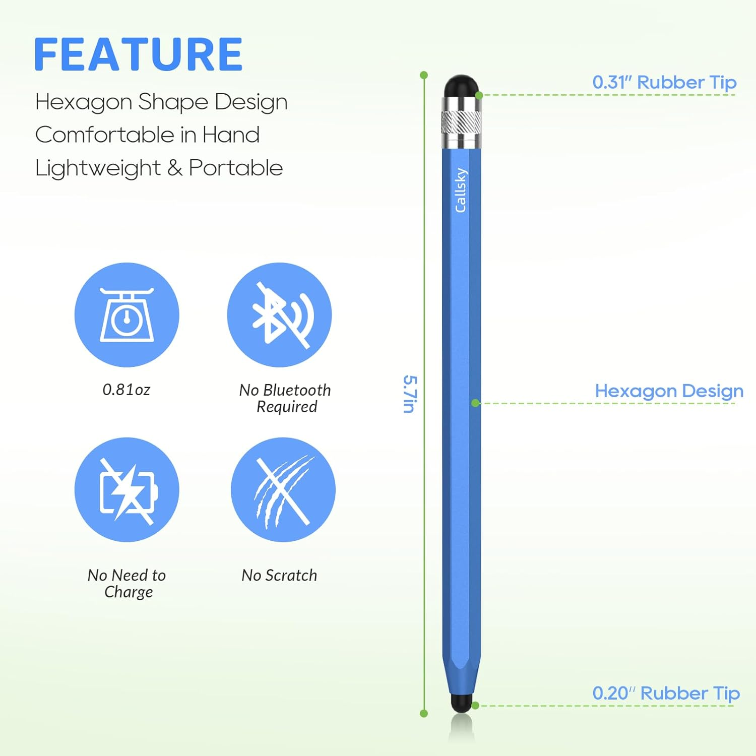 Stylus Pens for Touchscreen, 2 Size Rubber Tips Stylus Pen with Metal Hexagonal Barrel, Compatible for Ipad Iphone Chromebook and Android Tablets, Suit for All Touch Screen Devices 5 Pcs 10 Tips DESIGN FOR REDUCE WRIST STRAIN - Our stylus pen for touchscreen is crafted to fit comfortably in your hand, promoting a natural grip that reduces strain on your wrist during extended use HIGH ACCURACY & HIGH SENSITIVEITY - The fine tip of our fine tip stylus allows for greater accuracy when tapping keys on your device, reducing the likelihood of hitting multiple keys at once—common when using larger fingers HEXAGONAL BARREL & METAL MATERIAL - The hexagonal barrel prevents the stylus from rolling off desks or tables, ensuring it stays in place when not in use. This means you'll spend less time searching for it and more time being productive! Our alloy construction ensuring that your stylus pencils can withstand the rigors of daily use without compromising on performance. This means it’s built to last, supporting your creative and professional endeavors COMPATIBLE AND MULTI-PURPOSE - Universal stylus pen, perfect match with Callsky-Tab brand tablet and suitable for touch screen devices (Apple, Samsung, Moto, Lenovo, Xiaomi, etc.,. You can use our stylus pencil to write on drawing applications, take notes, read news, play games, etc., just like any other touch screen device EASY TO USE & REPLACEABLE TIP - Callsky-Tab stylus pen with rubber tip do not require charge and bluetooth connection. All tips are replaceable and finish the replacement process within seconds. Package contains 5* 0.20" replaceable rubber tips, 5* 0.31'' replaceable rubber tips. Simply unscrew the pen cap and replace rubber tips Product Description Prevent Dirty Screens Reduce Arthritic Strain Cant' Tap with Gloves Typing Multiple Letters Problem Step:1 Unscrew the stylus tip anti-clockwise. Step:2 Take off the broken tip, put the replacement on. Step:3 Screw the replacement tip clockwise. Item dimensions L x W x H 0.4 x 0.38 x 5.5 inches Material Metal Are Batteries Included No Color Black/Green/Red/Pink/Blue Product Dimensions 0.4 x 0.38 x 5.5 inches Item Diameter 0.4 Inches Country of Origin China Compatible Devices Android Tablets, Iphone, Ipad Item Weight 4 Ounces Batteries Required? No 0.38 inches x 0.4 inches x 5.5 inches. Weight: 4.0 oz Shipping from the USA All of our products are shipped from the USA, ensuring quick delivery to your destination. Payment We offer the following payment methods: PayPal, credit card, bank transfer, and eBay's secure payment system. Free Shipping & Free Returns Shipping within the USA is FREE. Additionally, any return is absolutely free for you. Risk-Free Purchase You have the option to return an item within 30 days without any justification. We cover the return shipping costs! Fast Shipping We ship immediately upon receipt of payment. Generally, the package is delivered within 2-3 days in the USA. If it takes longer, we will contact you. Quality and Costs Made in Europe, USA, China No customs fees or additional charges Total satisfaction guarantee Invoice with declared VAT available upon request in .pdf format Feedback Your feedback is very important to us. After you pay for your purchase, you will automatically receive positive feedback from us.
