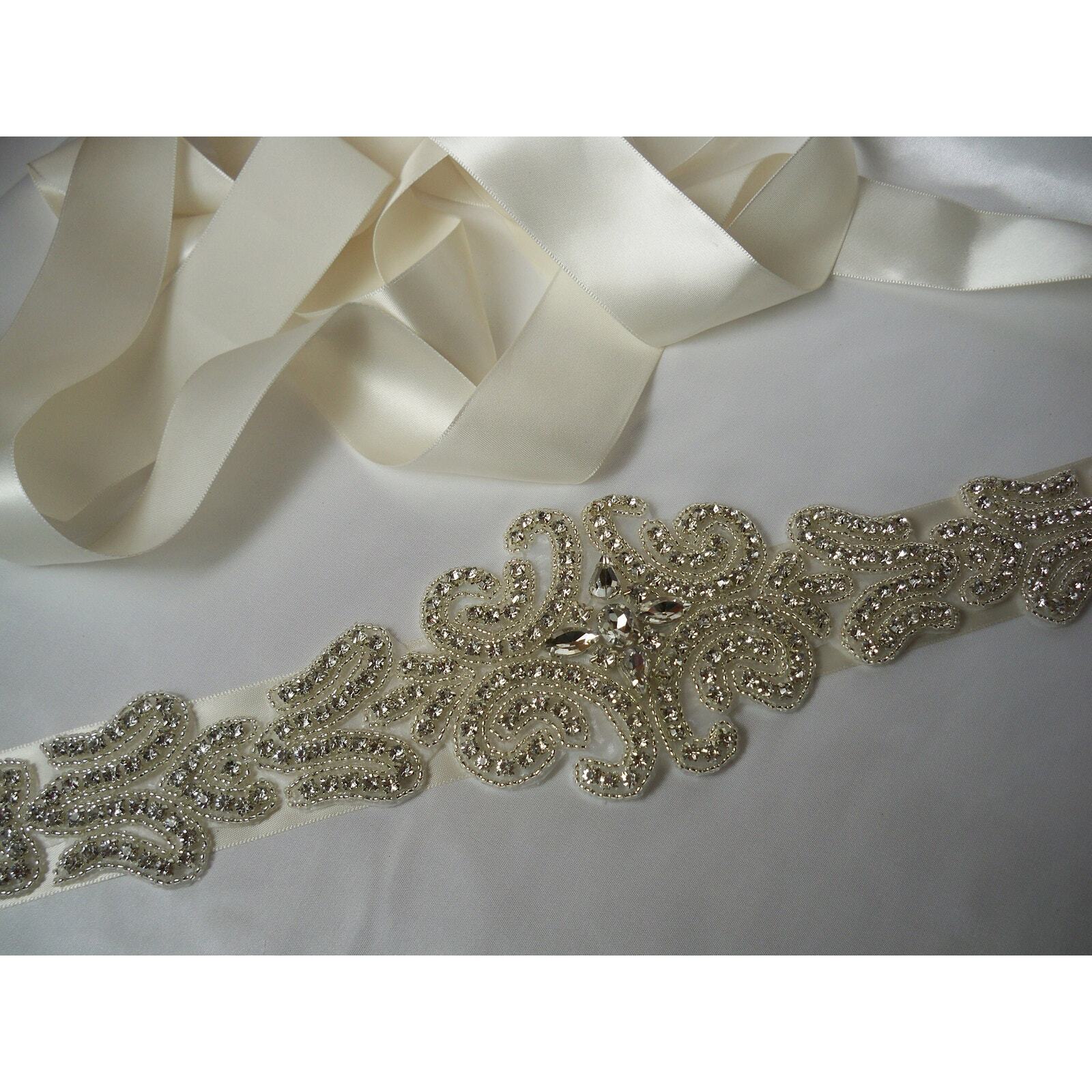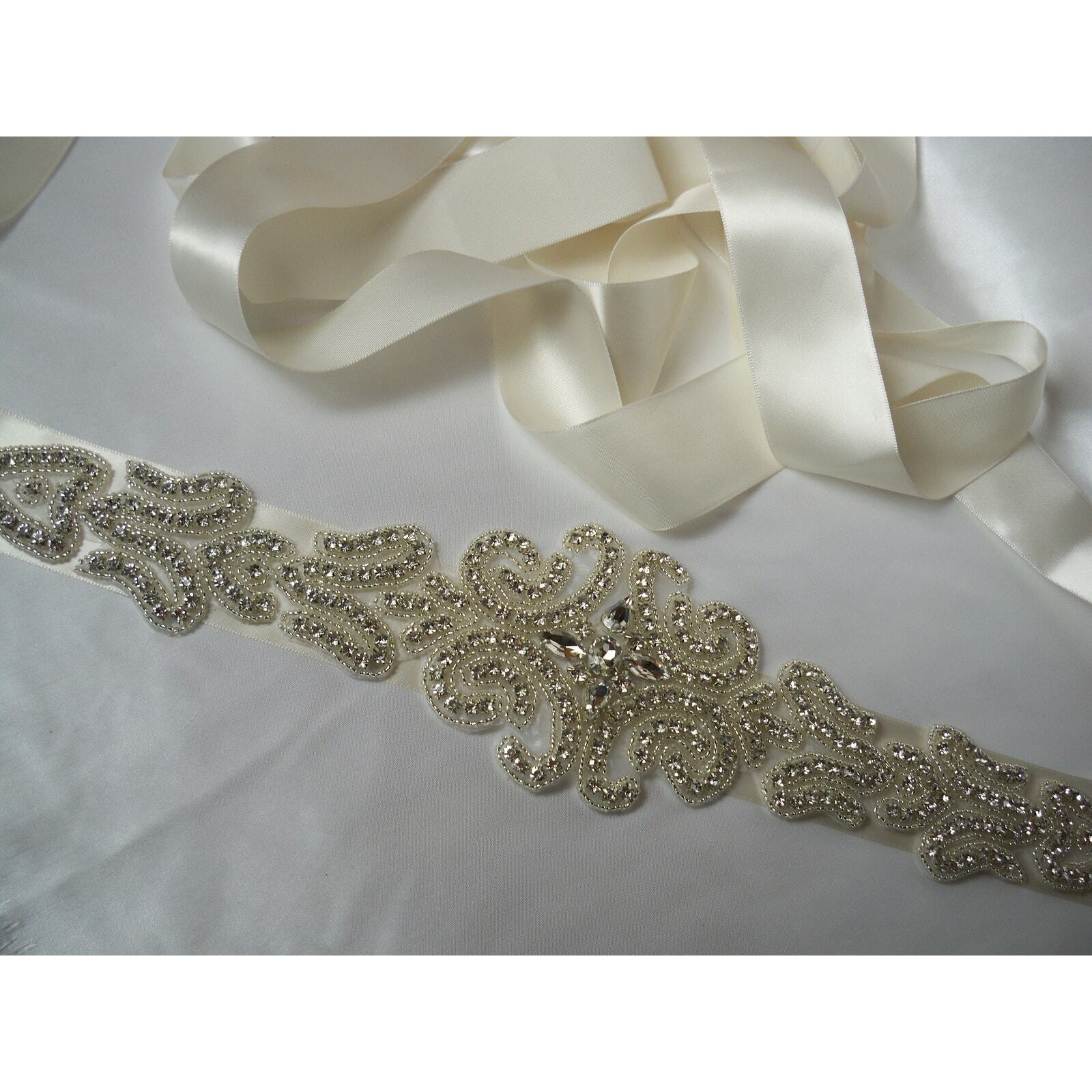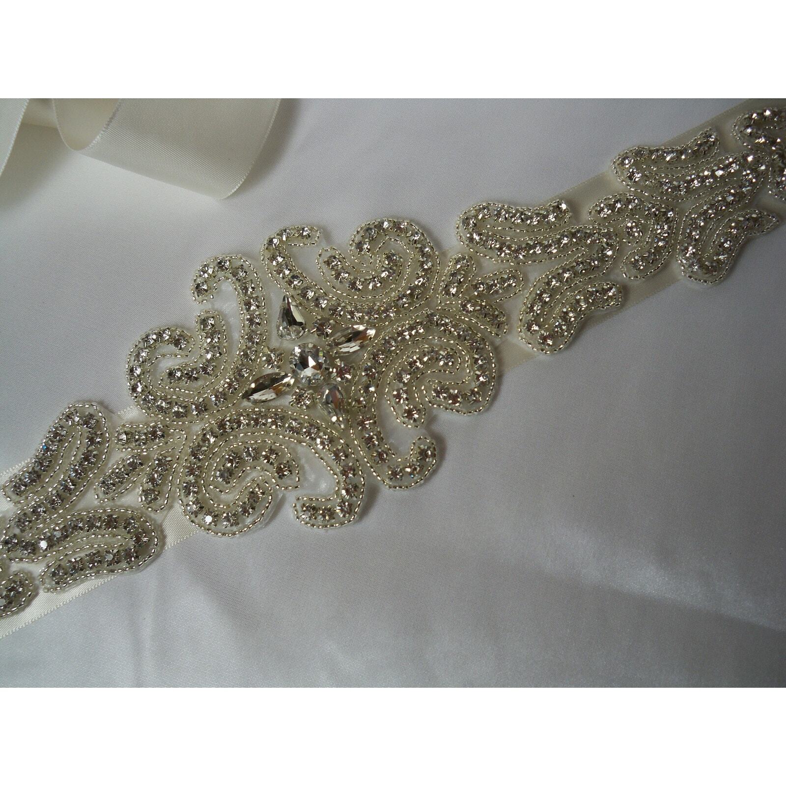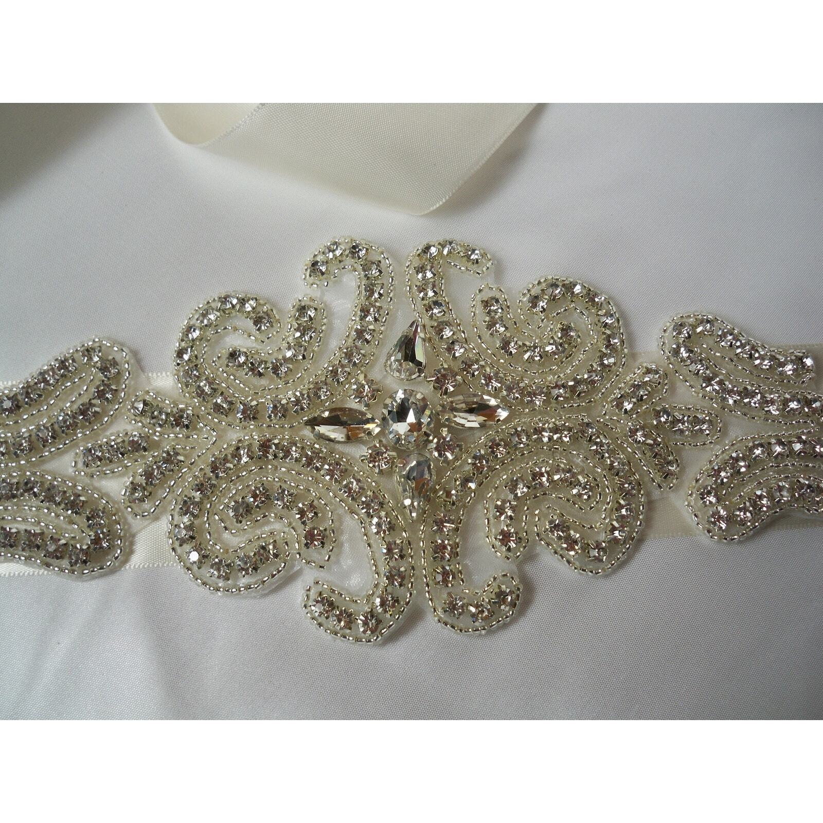 Stunning rhinestone applique bridal wedding dress belt or sash. The white double faced satin ribbon s 109 inches long and 2 1/4 inches wide. The sparkling rhinestone applique is 14 1/2 inches long. #40 Returns I ship five days a week, Monday through Friday, via USPS Mail. I don't accept returns or exchanges But please contact me if you have any problems with your order. We are NOT responsible for any Rhinestones that come lose after it was shipped. Refunds are for the amount of the item(s) purchased only. Shipping costs are not refunded. I want you to be happy with your purchase. Any items damaged during shipping must be reported to me within 2 days of receiving the package. A photo must be provided of the item if damaged to have a return approved. The item must not of been tried on or worn. I must be notified within 2 days of receiving the item if you believe an error has been made.