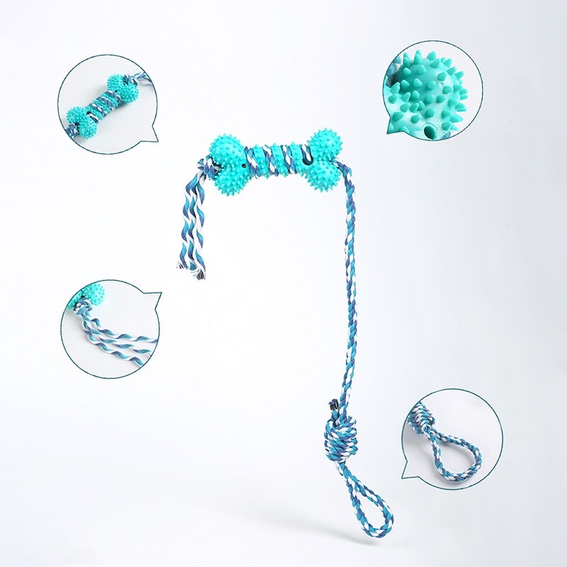 This chew toy is a game-changer for my energetic pup! It keeps him busy for hours while cleaning his teeth—no more boredom or plaque buildup. The material is super tough, perfect for aggressive chewers, and it holds up well during intense tug sessions. Love the bright colors, and most importantly, my dog is obsessed. Great for dental health and playtime!